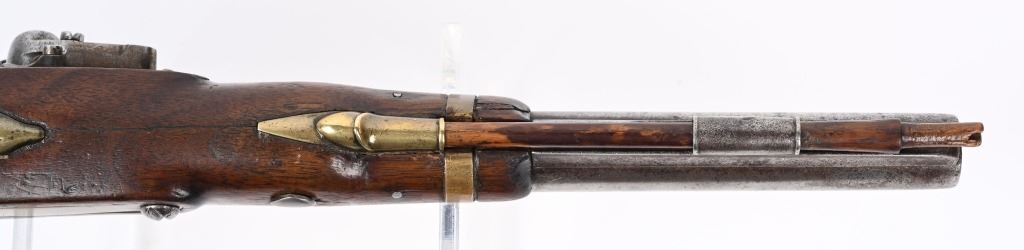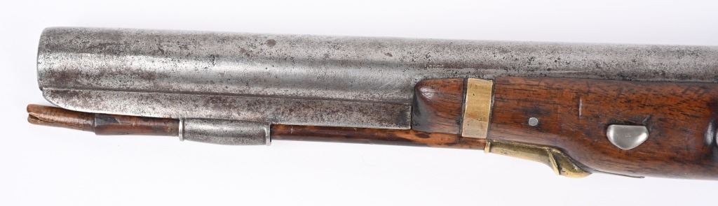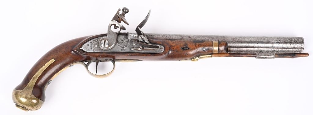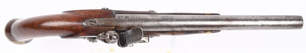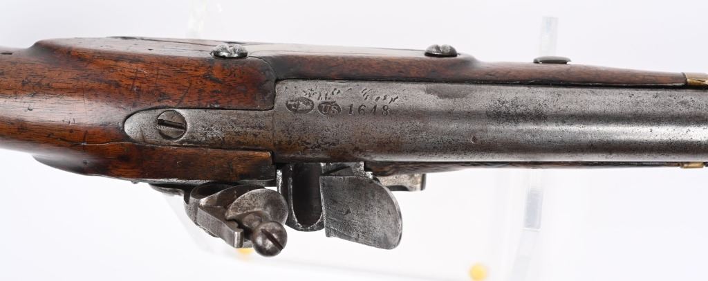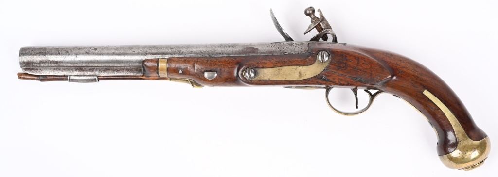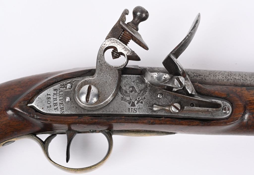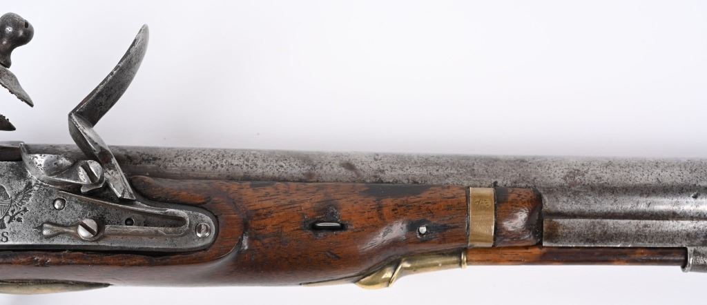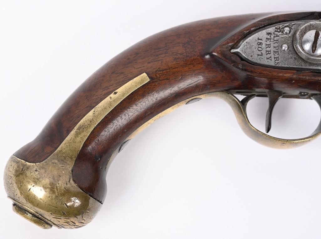 SERIAL NUMBER 1648 BARREL 10 1/8" CALIBER .54 SMOOTHBORE MANUFACTURED 1807. Produced at the US Arsenal at Harpers Ferry with tapered round barrel numbered 1648 at breech and marked US & inspected with the Eagle Head over "P" inspection. Lock is marked "HARPERS FERRY 1807 " at rear with Large Eagle with "US" in center. one piece walnut stock with brass butt with medium stirrups, brass trigger guard and rod guide with brass band at forend. Stock is retained with single wedge and tang screw. Just over 2500 pistols were produced in 1807 with most later being converted to percussion. This example remains in its original flintlock configuration with visible cartouches in the wood stock and remains operable. CONDITION. Good with proper functioning lock. Bore is dark. Markings remain crisp and legible. The stock has period of use wear and slight material loss on left side from an earlier repaired crack. A visible but illegible cartouche in present on left side of stock. Barrel and lock are a even dove grey as the stock is good with period of use impressions and a earlier repaired crack on left side. The loading rod is a replacement. Considered by many to be the most elegant of all US Martial pistols and its image is still used to this day on US Military Commendations and awards. ANTIQUE
