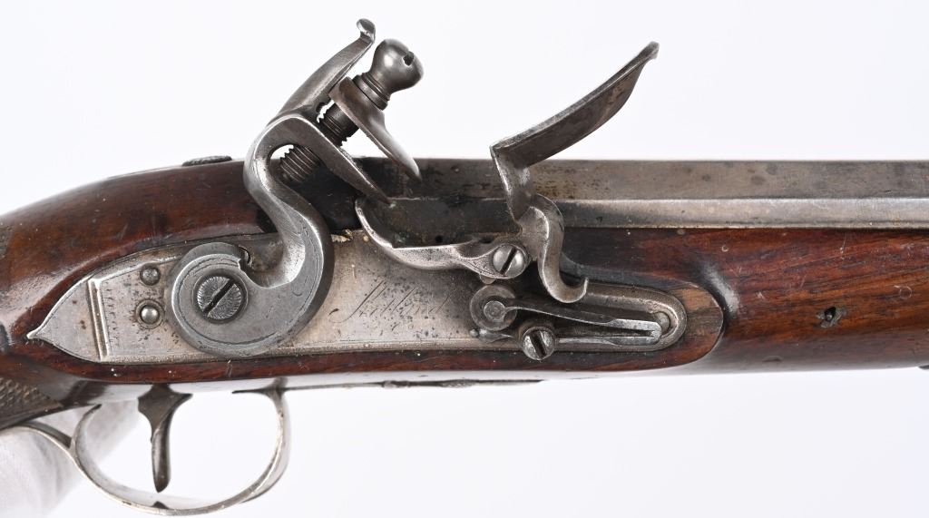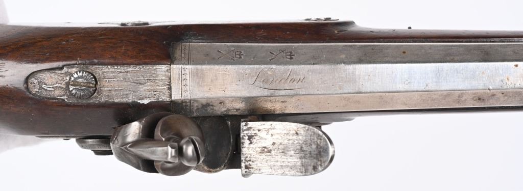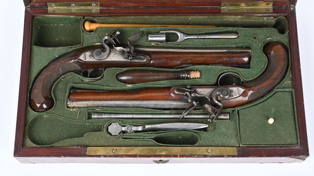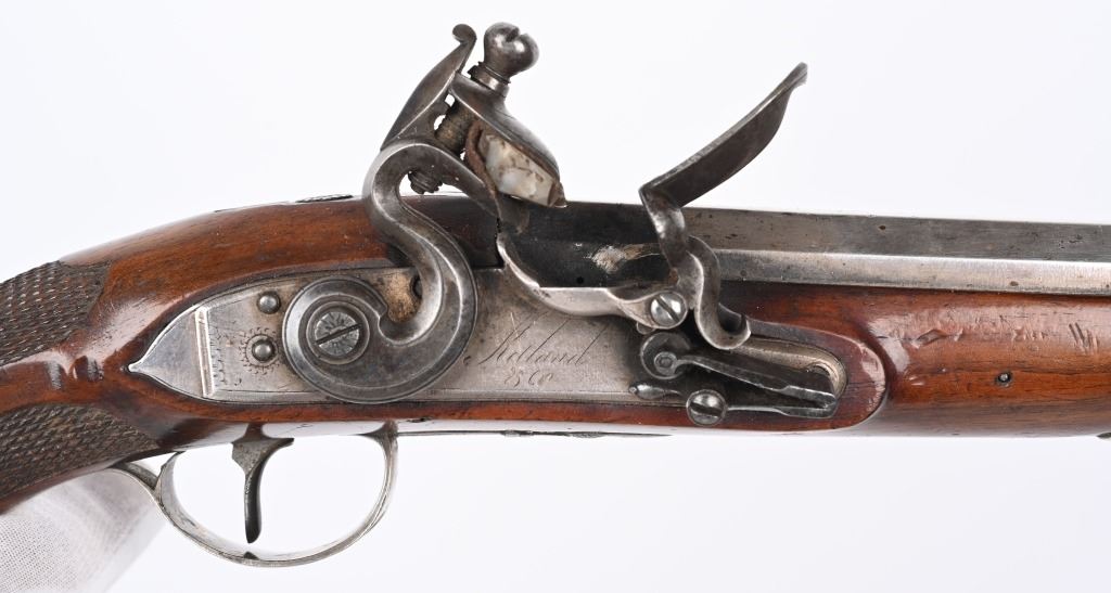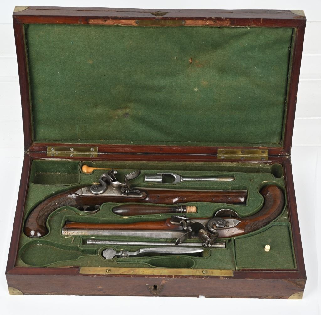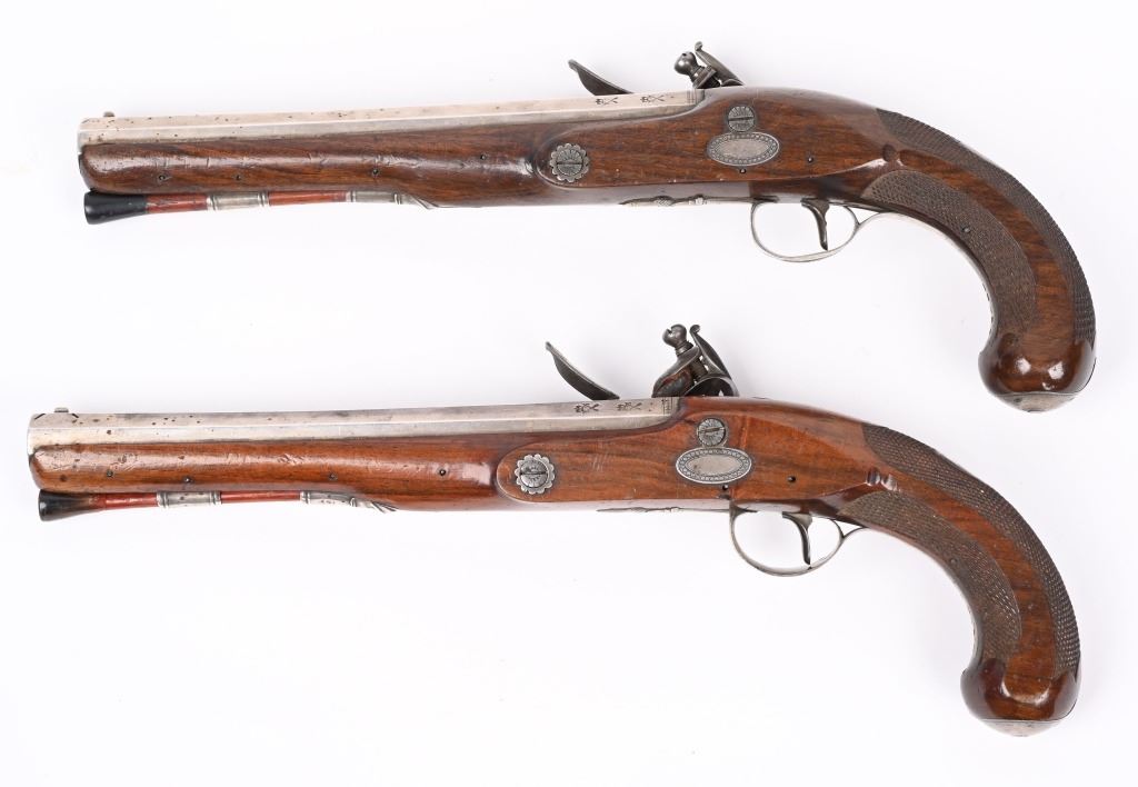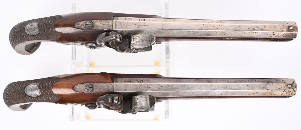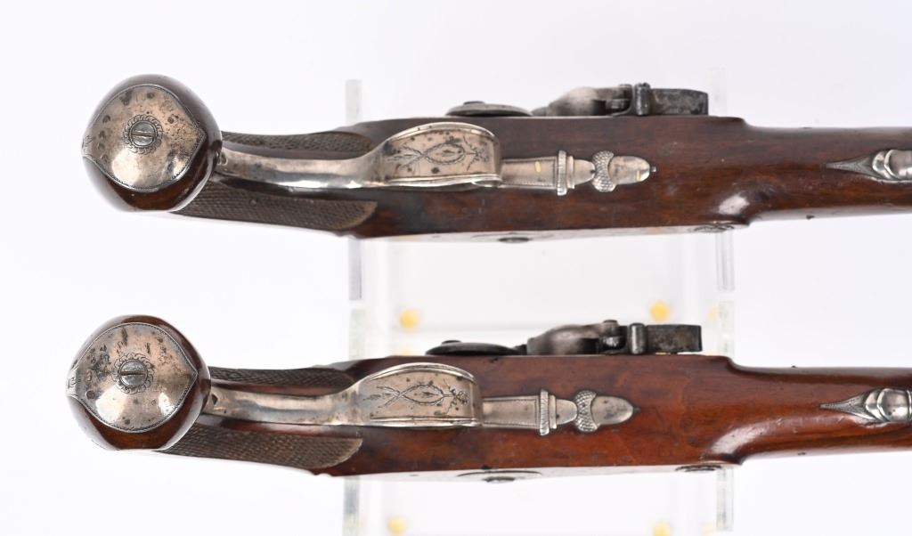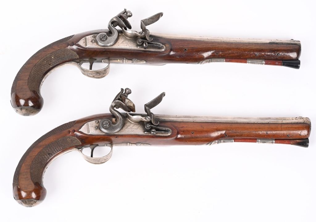 SERIAL NUMBER N/A BARREL 8 5/8" CALIBER .56 SMOOTHBORE MANUFACTURED CIRCA 1810-1830. Made for the Continental market. Wonderfully silver mounted with swamped octagon barrels. Silver bowed trigger guard with 4 small hall marks at rear and tear shaped silver butt cap with 4 hall marks. One piece checkered stock with 2 silver rod pipes and hickory loading rod with horn tip. Both pistols are identical in design and pattern. Both are cased with their English pattern French fitted case with wiping rod, wad cutter and mechanical mold with sprue cutter. CONDITION, Both pistols are very fine with the silver having a light tarnish The stocks are very fine and solid with a few minor period of use impressions and dents. The locks are crisply marked "KETLAND" in script and retain most all of their respective plating. The Octagon barrels are very fine with English proofs and "LONDON" in script on the top barrel flat and barrels retain most all of their plating. The case is good with some distress on the top lid from warpage and lock mechanism has been forced open. Lining is very fine. Accessories are very good. ANTIQUE