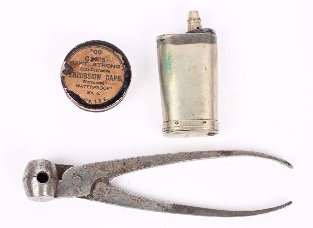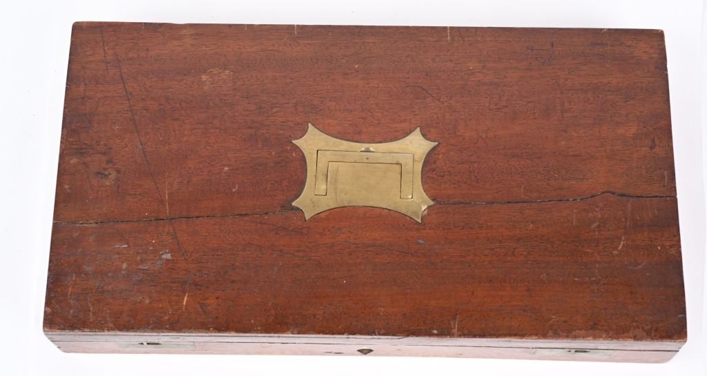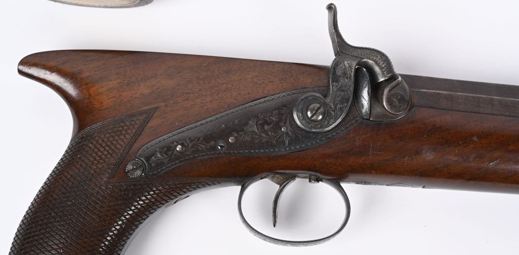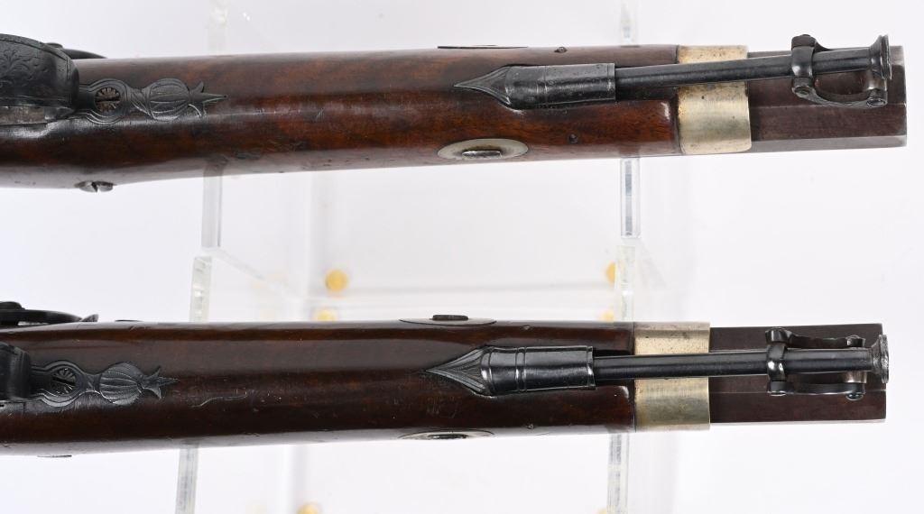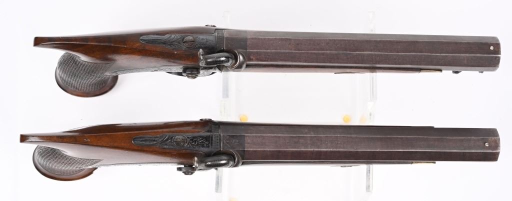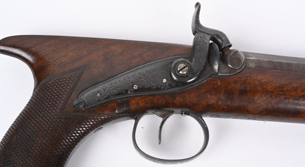 SERIAL NUMBER N/A BARREL 8 1/4" CALIBER .68 CALIBER SMOOTHBORE MANUFACTURED CIRCA 1840-60. Produced in London by the Wilson family of gun makers with incredible big 68 caliber smoothbore and swivel rammer. Octagon barrel marked A.WILSON LONDON on top flat and percussion lock marked "WILSON" on top center with modest scroll engraving. Single set triggers with blue finished trigger guard engraved to match lock. Checkered saw handle pattern walnut stock with single wedge retainer and German silver butt cap. These massive traveling pistols remain with their partitioned velvet lined case with bullet mold, powder flask, wiping rod and percussion caps. CONDITION. Very fine with excellent stocks and fine bores. Locks and set triggers operate properly. The finishes have more than likely been period restored as was practice of the day. The case and accessories remain very fine. ANTIQUE