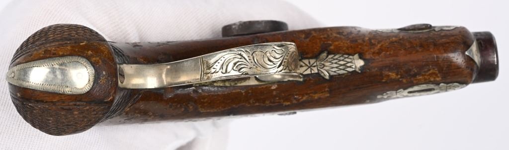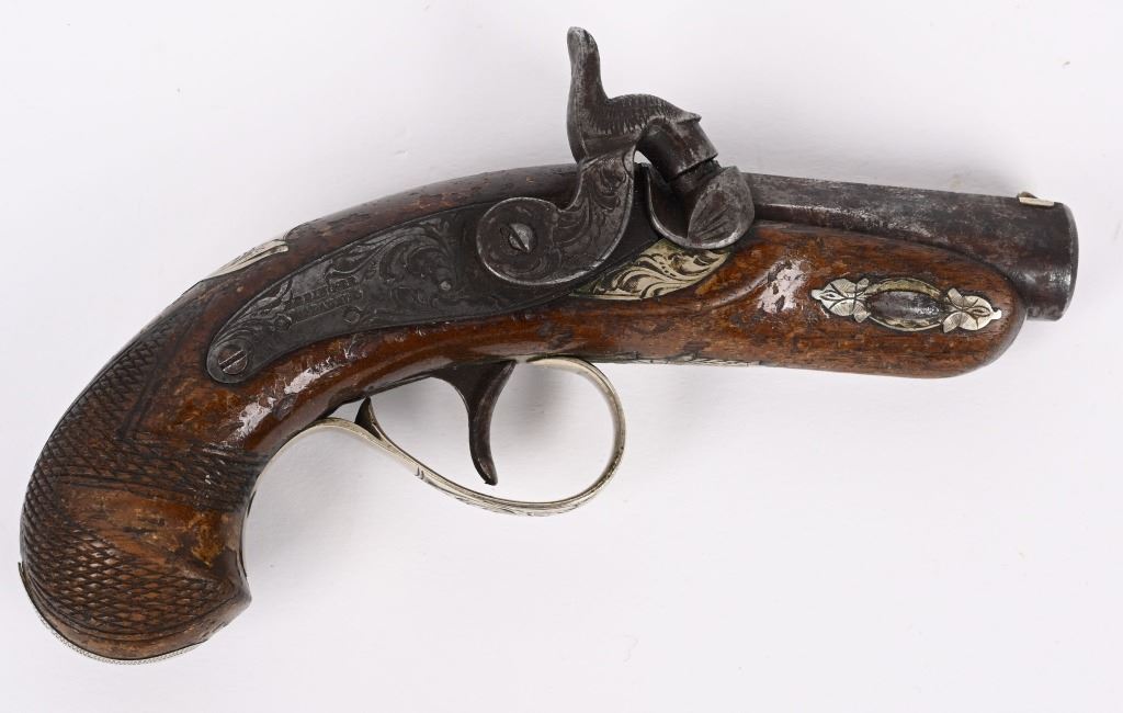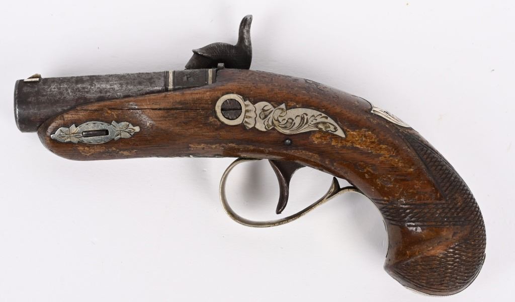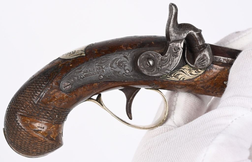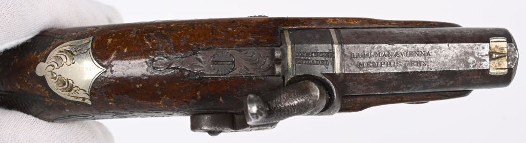 SERIAL NUMBER N/A BARREL 2 5/8" CALIBER 41 PERCUSSION MANUFACTURED CIRCA 1855-1865. Retailer marked "LULLMAN & VIENNA MEMPHIS TENN," on top barrel flat. Single shot Henry Deringer pistol of the dimensions of the famed pistol used by John Wilkes Booth to assassinate Abraham Lincoln at Fords Theatre. One piece checkered walnut stock with birds head grips and engraved German silver hardware, 41 caliber percussion barrel marked with "DERINGER PHILADEL" with 2 silver bands and "P" proof surrounded with sunburst. Lock is marked with same and is floral engraved. Lullman & Vienna were retailers of small arms in Memphis Tenn, who continued their business through reconstruction. CONDITION. Good with crisp legible markings. Action operates properly. Barrel and lock have toned to an even brown patina. Stock is good with period bruises and impressions. Hammer screw is chipped. ANTIQUE