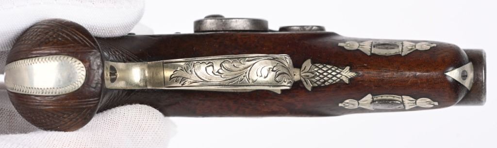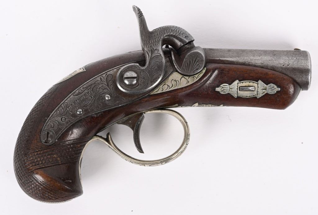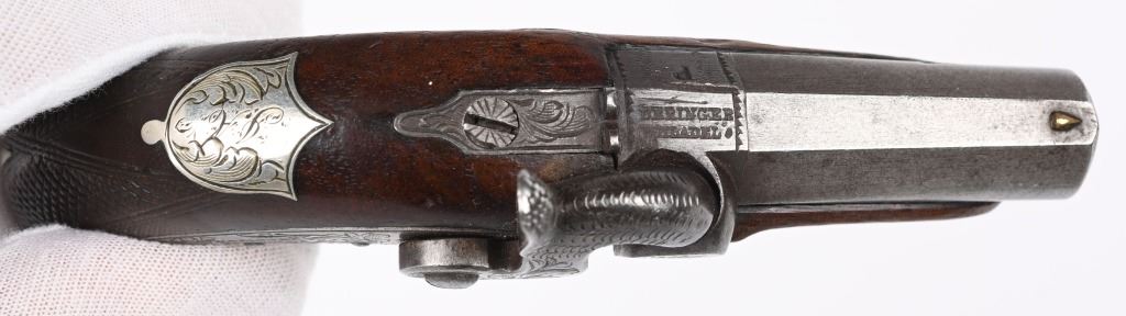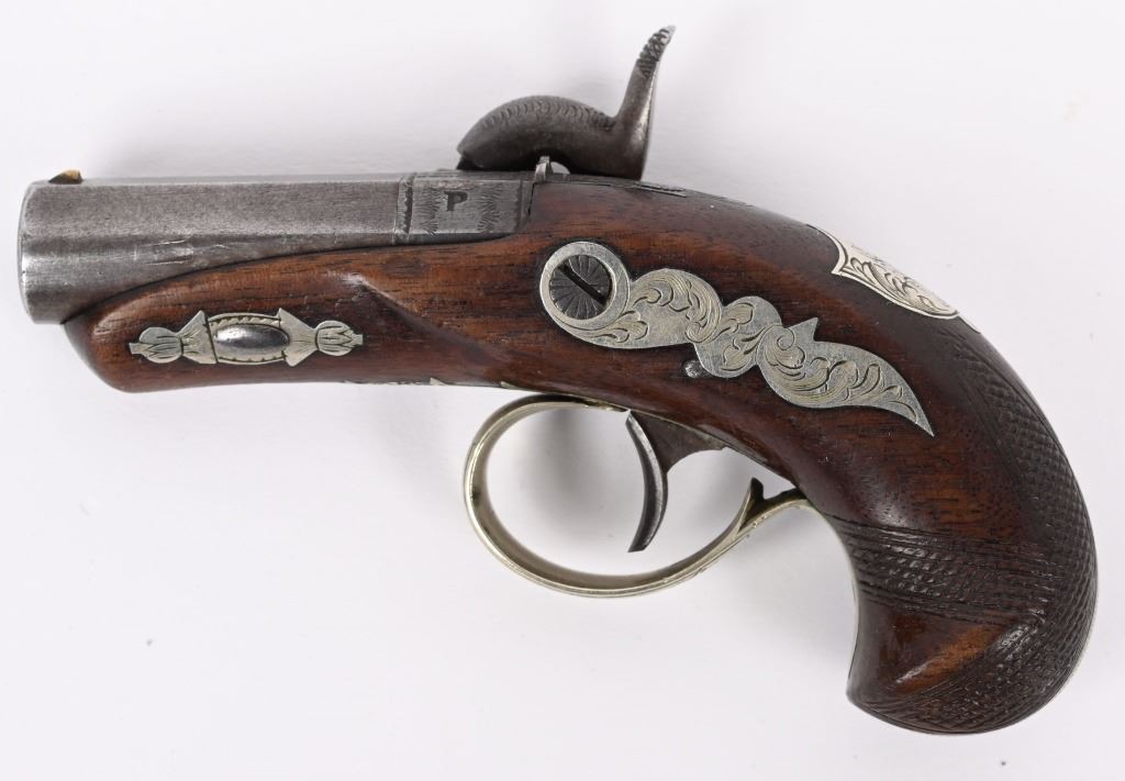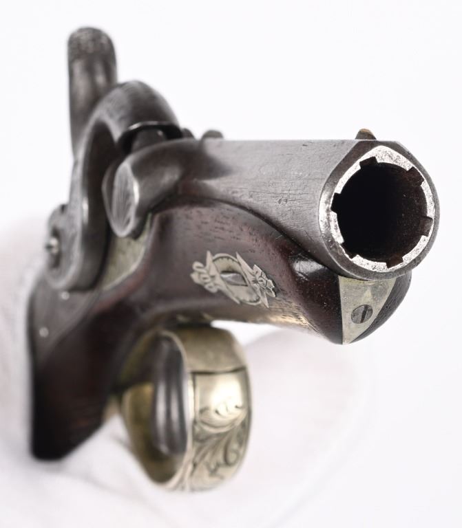 SERIAL NUMBER N/A BARREL 2 1/4 CALIBER 41 PERCUSSION MANUFACTURED 1855-65. Smallest pattern of the famed Henry Deringer pocket pistols. Lock and breech marked " DERINGER PHILADEL" with "P" proof with sunburst. Birds Head walnut grip with German silver furniture. Modestly engraved with scrolls and vine with name plate engraved "J.A." in script. CONDITION. Good with traces of faux Damascus scene on barrel. All markings and legends remain crisp. Action operates properly. Bore is good and stock is very good. ANTIQUE