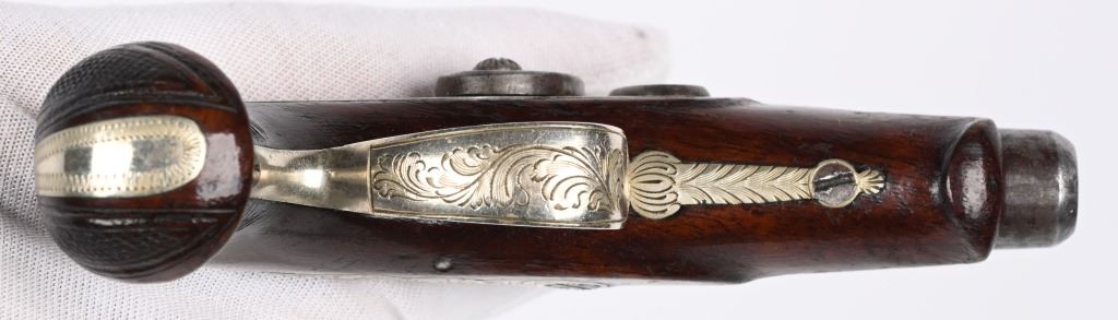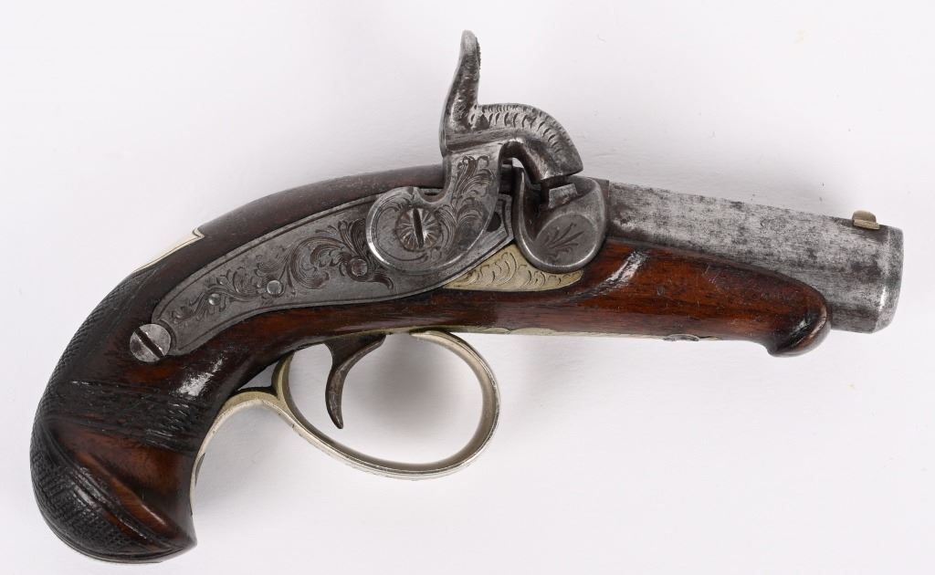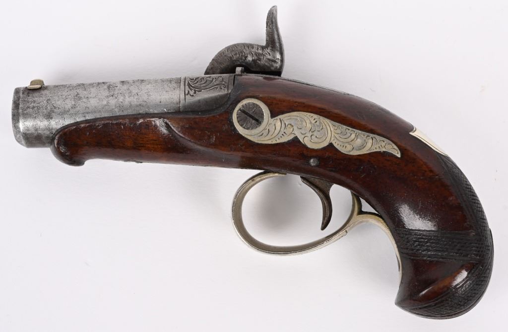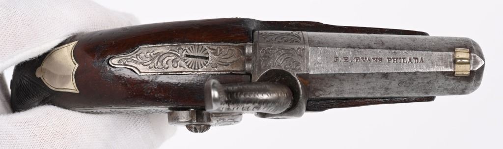 SERIAL NUMBER N/A BARREL 2 1/2" CALINER .35 PERCUSSION MANUFACTURED 1850-1865., James E Evans of South Street Philadelphia regarded and advertised himself as a gunsmith and firearms dealer. His unlicensed copies of the Henry Deringer pistol are one of few that deviated in caliber and stock design. This example with 35 caliber rifled bore and marked "J.E.EVANS PHILa" on top barrel flat. Birds Head walnut stock is mounted with German silver furniture in the Deringer form. The stock tip is done in a small schnable design. Dovetail blade front sight. CONDITION, Very fine with sock retains most all varnish ands sharp checking. Lock and barrel are very good with crisp legends and sharp engraving. Bore is good and action operates properly. ANTIQUE