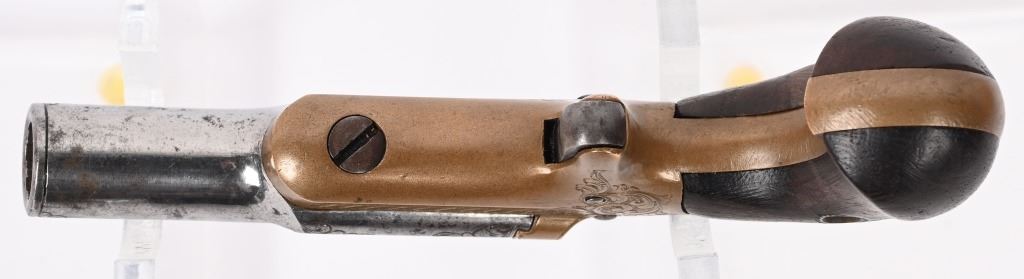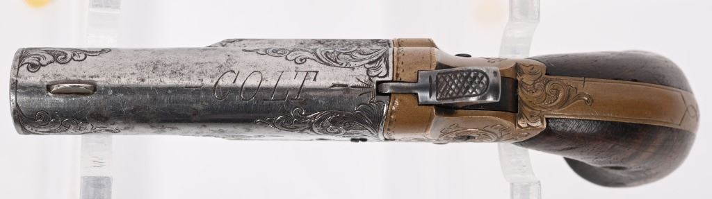 SERIAL NUMBER 4903 BARREL 2 1/2" CALIBER 41 RIM FIRE MANUFACTURED CIRCA 1880. Brass frame with iron barrel marked COLT on top. Serial numbered under grip 4903 with assembly number R60 under opposing grips. Engraved in identical format as that example p.289 "THE BOOK OF COLT FIREARMS" by Wilson & Sutherland. Nickel finished barrel with traces of silver plating in very protected areas of frame. Engraving remains crisp. CONDITION. Fine with over 70% nickel remaining, 2-3% silver remains in the most protected areas. Bore is very good and action operates properly. Grips are very good. ANTIQUE