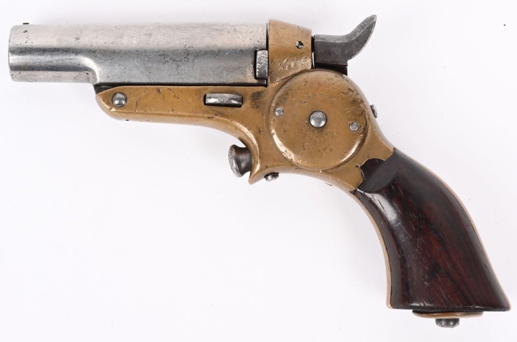 SERIAL NUMBER "E" BARREL 2 3/4" CALIBER 41 RIMFIRE MANUFACTURED 1865-69. A very few 800 estimated total production with round nickel plated barrel, manual extractor and side hammer equipped brass frame with push button trigger. Side plate marked "STARR'S PATENT 1864" Assembly mark "E" found on water table and underside of barrel. 2 piece walnut grips. CONDITION, Very good with most nickel finish remaining on barrel. Frame is a mellow mustard patina and has no indication of plating. Markings on side plate are very shallow and light. Action operates properly. Grips are very fine. ANTIQUE