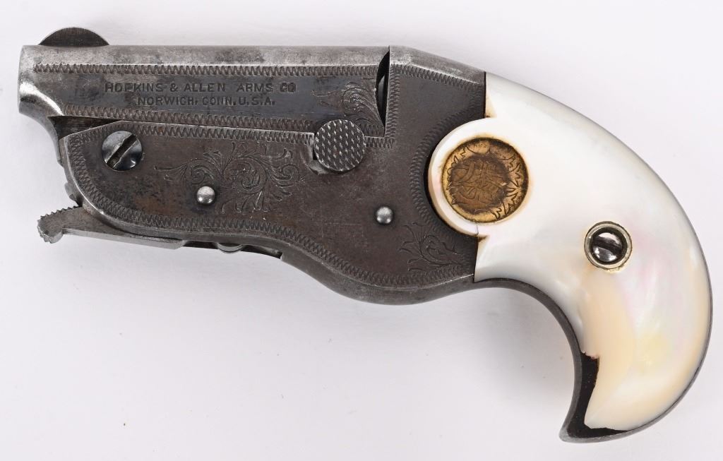 SERIALNUMBER 632 BARREL 1 3/4" CALIBER 22 RIMFIRE MANUFACTURED 1911-1915. Scarce blue finished folding trigger H&A Vest Pocket Deringer with factory Mother of pearl grips with deep dish gold medallions. Less than 1400 ever produced. Factory Hopkins & Allen address on left side of barrel serial numbered on bottom of grip. CONDITION, Good with fully functioning action. Good legible legends. Pistol retains 30% blue finish in protected areas. Left grip has repairable chip at toe. C&R