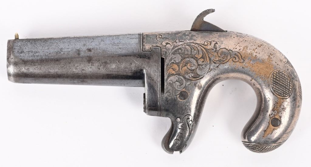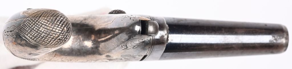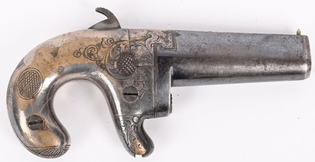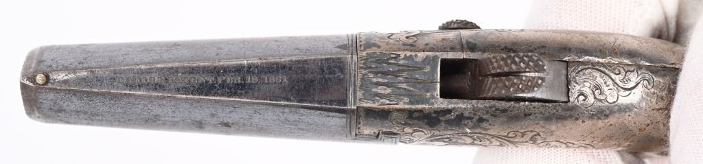 SERIAL NUMBER N/A BARREL 2 1/2 CALIBER 41 RIMFIRE MANUFACTURED 1860-65 . Iron frame with D. Moore address with 1861 Patent date on top flat of barrel Single shot spur trigger with scroll engraved frame Silver plated frame with blue finished barrel. CONDITION. Good with frame retaining 40% tarnished silver Barrel retains 60% thinning blue. Good bore and proper functioning action. ANTIQUE