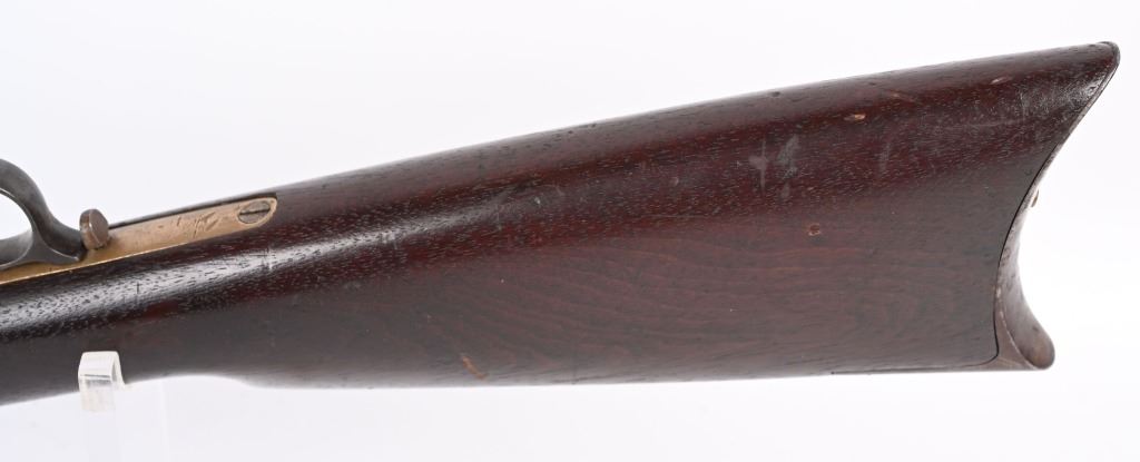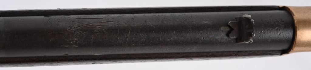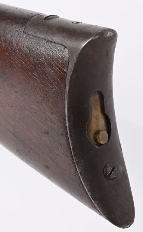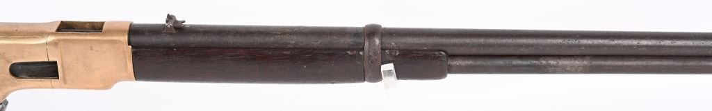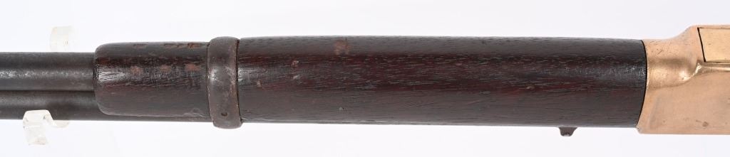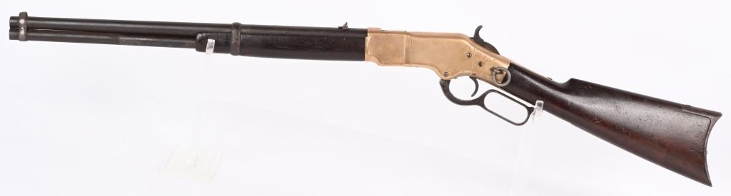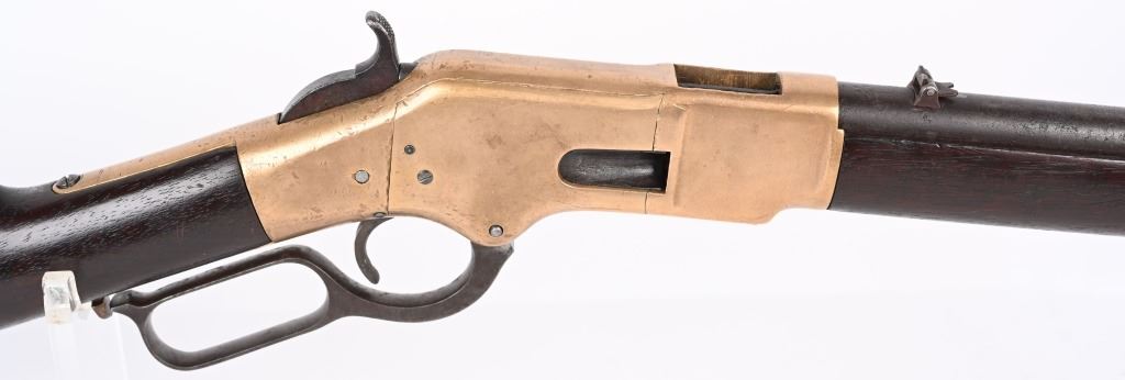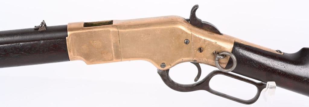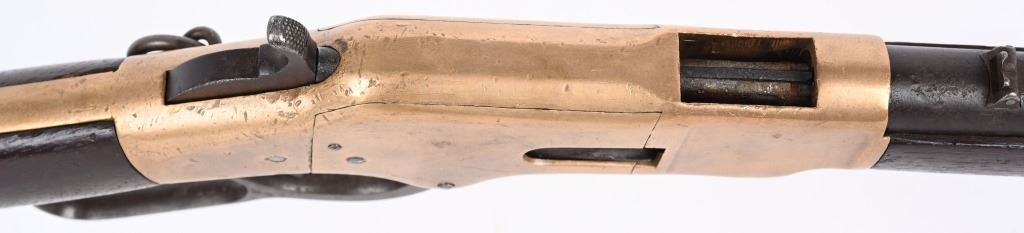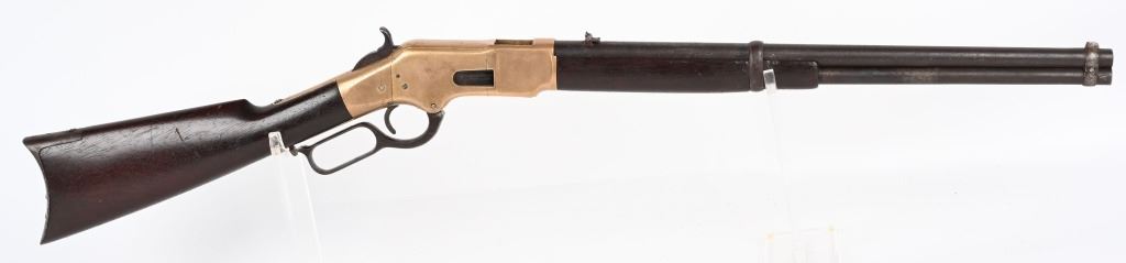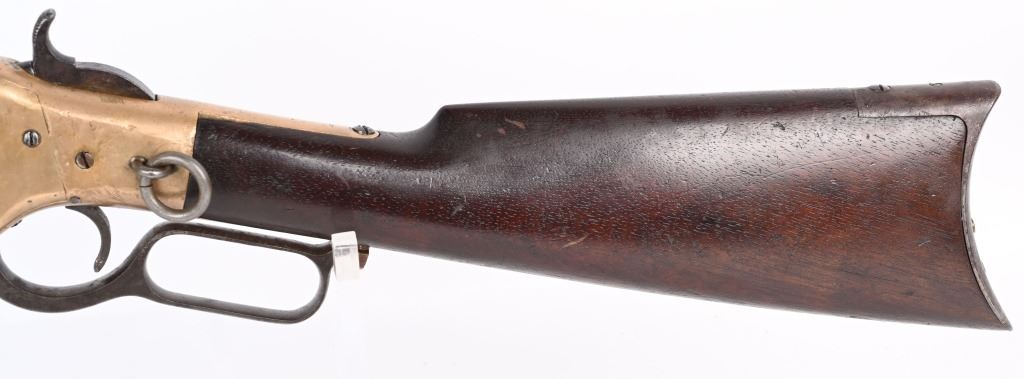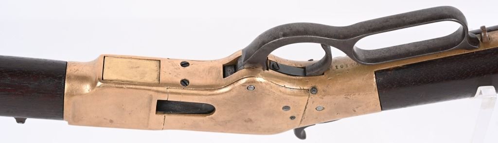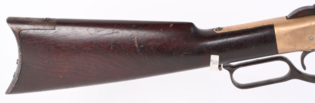 SERIAL NUMBER 101547 BARREL 20" CALIBER 44 HENRY MANUFACTURED 1872. Gun metal brass receiver with 20" round barrel with 2 position folding rear sight and front band integral front sight. Straight grain American walnut forearm with matching butt stock with steel crescent butttplate with trap for cleaning rods. Classic Yellow Boy carbine of western lore and fame. CONDITION. Fair with barrel and magazine tube being a dark plum brown patina. Stocks are very good and full sized with no serial numbers in mortise. Brass receiver has numerous period impressions and abrasions. Bolt has evidence of pitting but remains in original rimfire configuration. Lower tang butt stock screw is modern replacement as is trigger return spring. Action operates properly. Bore is very dark. ANTIQUE