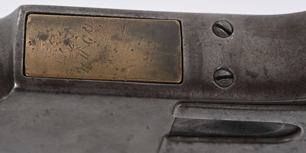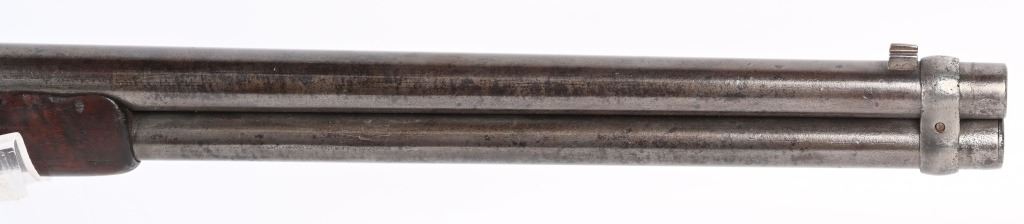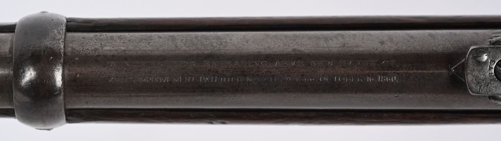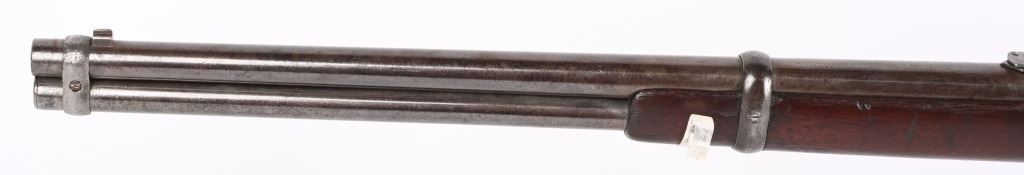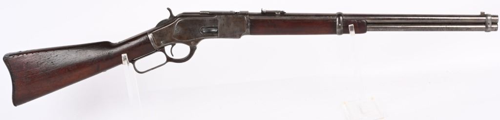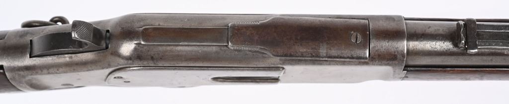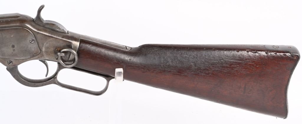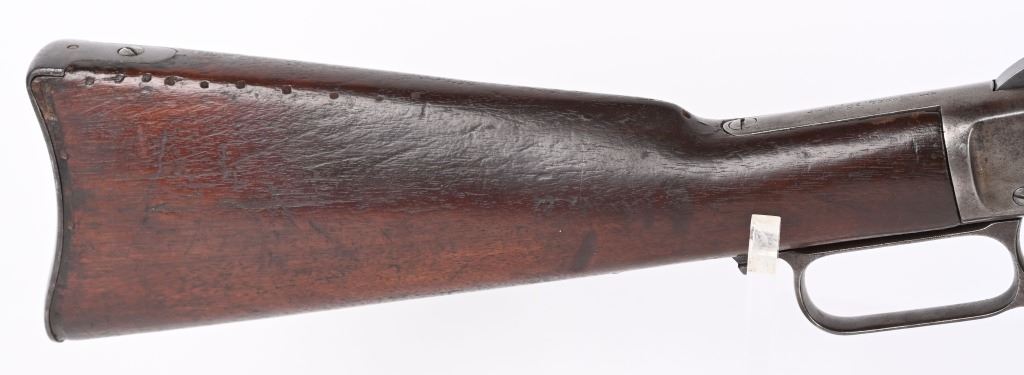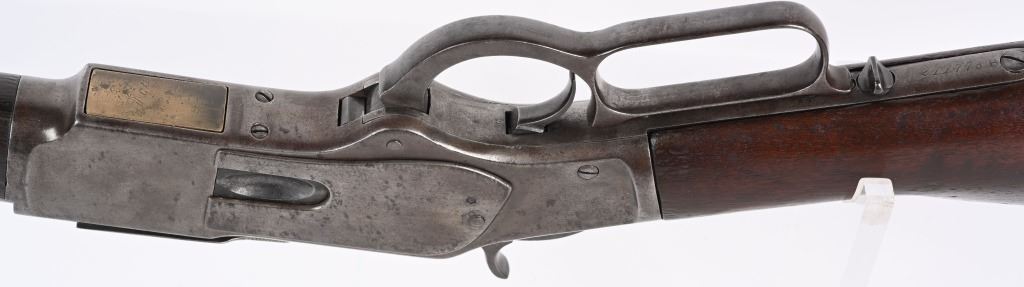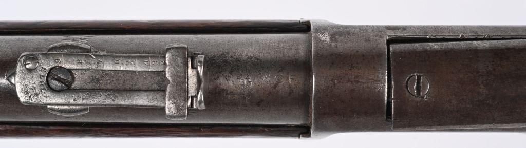 SERIAL NUMBER 211778B BARREL; 20" CALIBER 44-40 WCF MANUFACTURED 1886. Blue finished steel with straight grain American walnut 2 piece stocks with steel carbine butt plate with trap for cleaning rods. Barrel mounted post front sight with 1873 marked ladder rear sight. 2 line Winchester New Haven barrel address with chamber marked 44 WCF at top. Brass cartridge lifter marked 44 CAL, CONDITION, Good with exterior metal being a soft grey and mottled plum patina. The bore is good with strong rifling and frosted lands and grooves. The stocks are worn with slight material loss but remain full sized and attractive. ANTIQUE