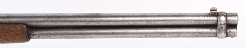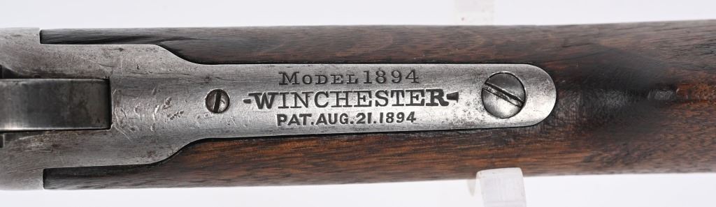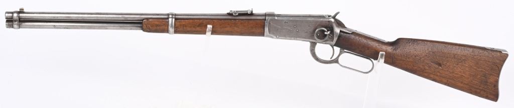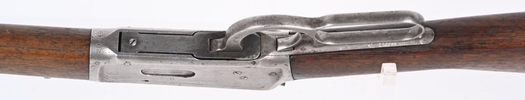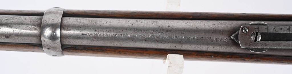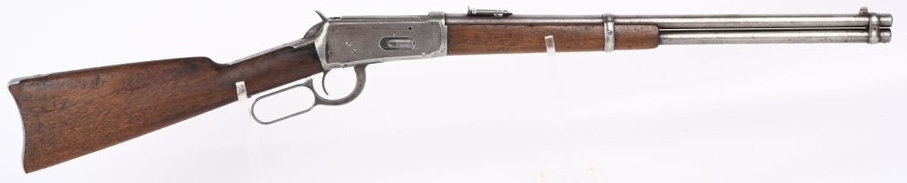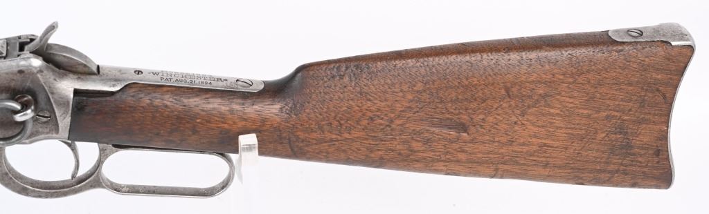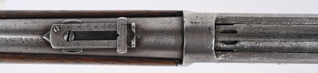 SERIAL NUMBER 42401 BARREL 20" CALIBER 38-55 WCF MANUFACTURED 1898. 20" round barrel with post and blade front sight and ladder adjustable carbine rear sight. Oil finished straight grain American walnut stocks with steel carbine butt plate. 2 line Winchester New Haven barrel address. Chamber marked 38-55 . CONDITION. Good with barrel and magazine retaining 20% blue finish with balance turning plum and silver. Receiver has lost all its finish with use and age. The bore is worn with visible rifling. The stocks are good , full sized and serviceable. ANTIQUE