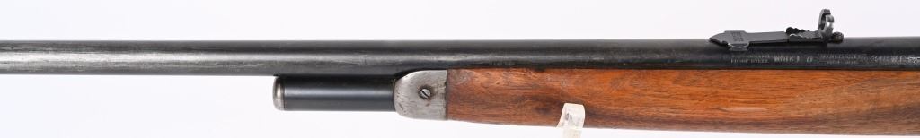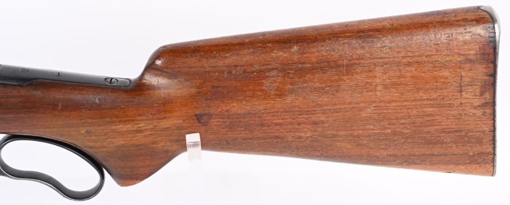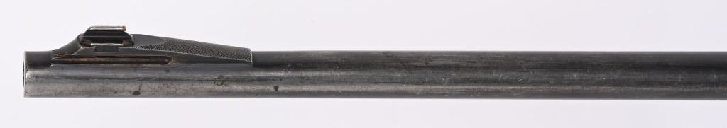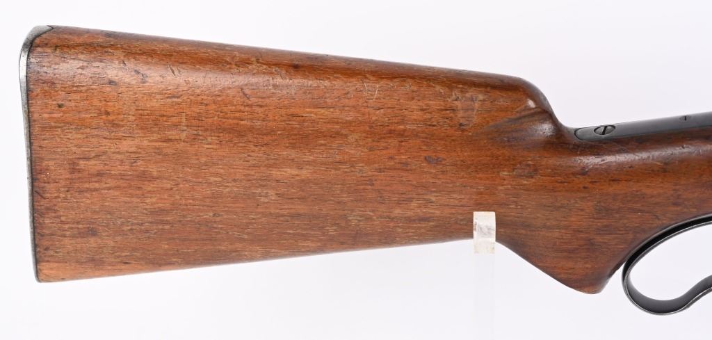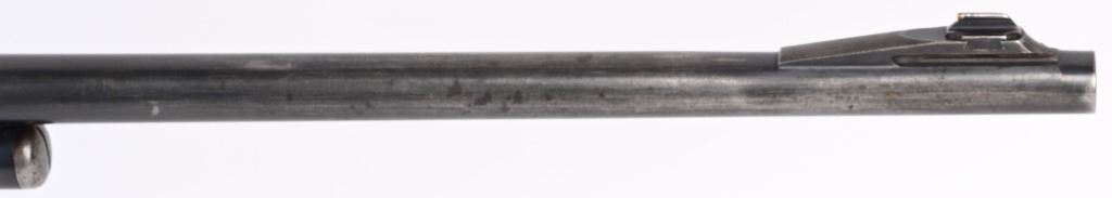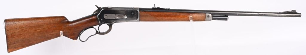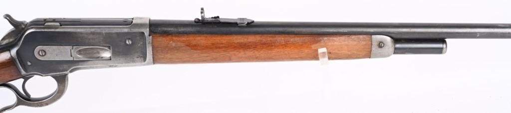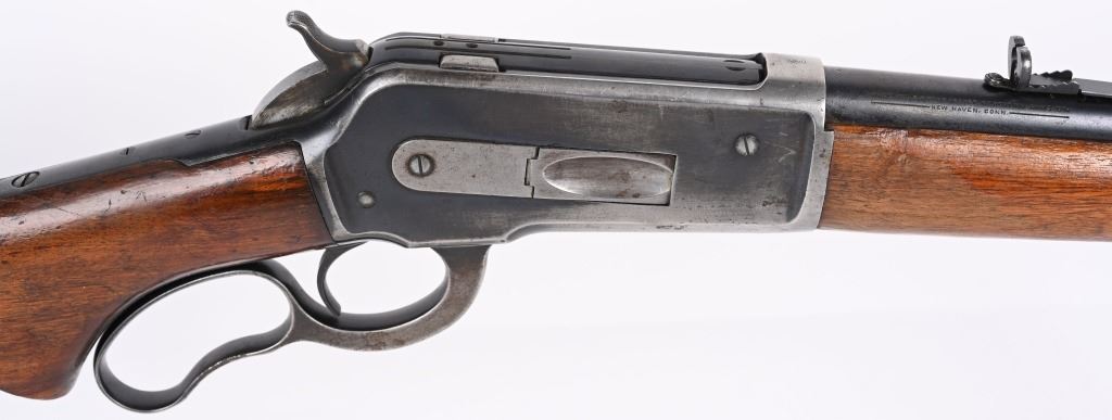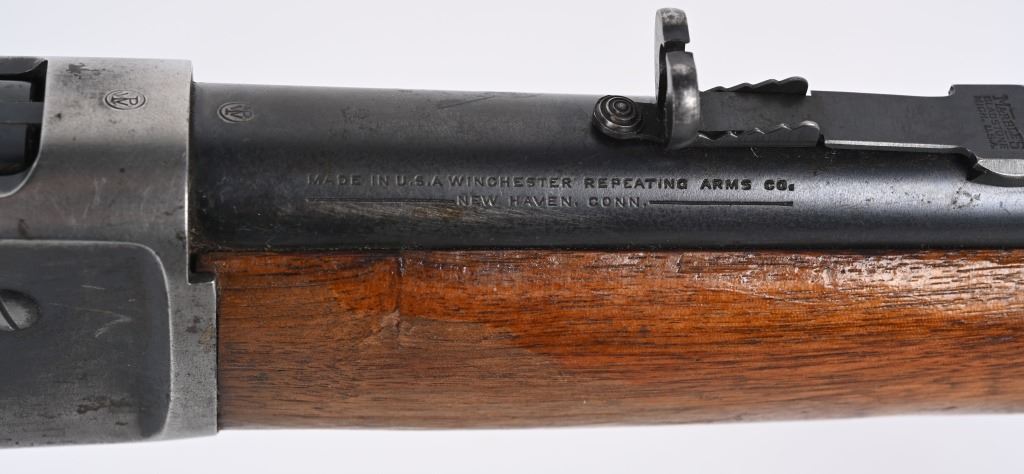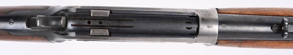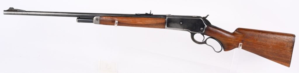 SERIAL NUMBER 8743 BARREL 24" CALIBER 348 WCF MANUFACTURED 1936. Introduced as an updated and improved model 1886 Winchester rifle. Chambered in the powerful 348 Winchester cartridge it quickly became a favored big game rifle in the Northern regions of North America. Round barrel with 1/2 magazine with semi-beavertail forend and smooth pistol grip stock with steel checkered butt plate. Ramped blade front sporting sight with elevation adjustable sporting rear sight. Rifle is machined to accept the Bolt Peep that is now missing. CONDITION. Good with 30% blue finish remaining on barrel and magazine. Receiver retains 40% blue finish with balance worn from carry use. Bore is very good with sharp rifling. The action operates properly. The stocks have been refinished at a prior period. C&R