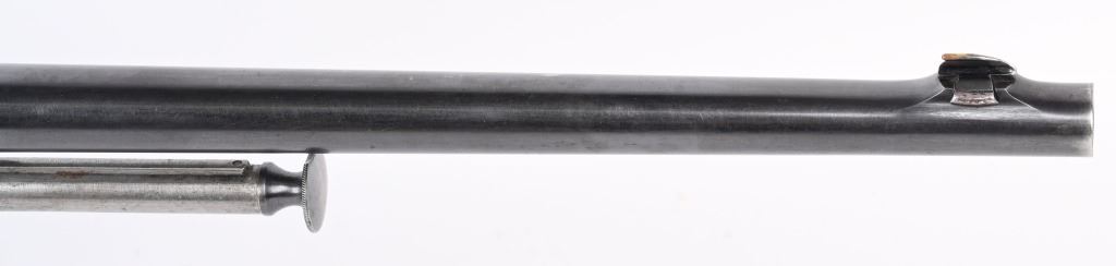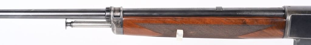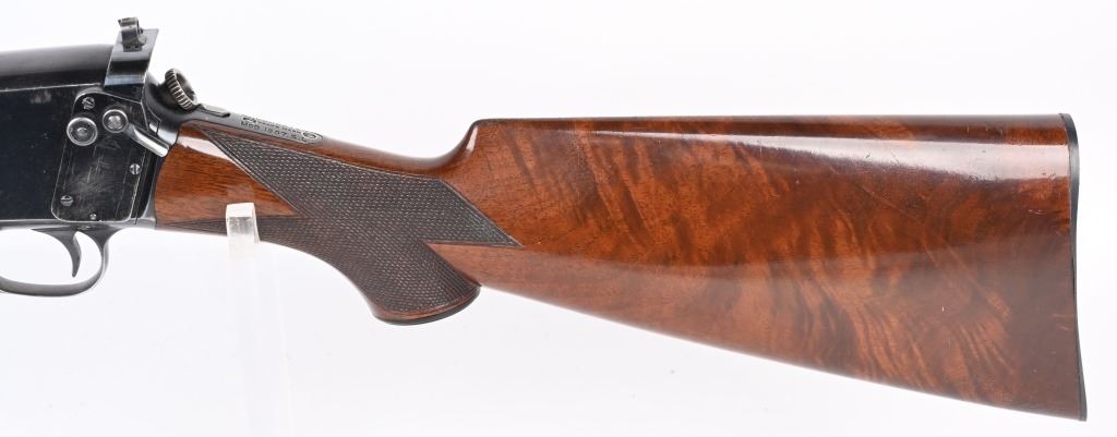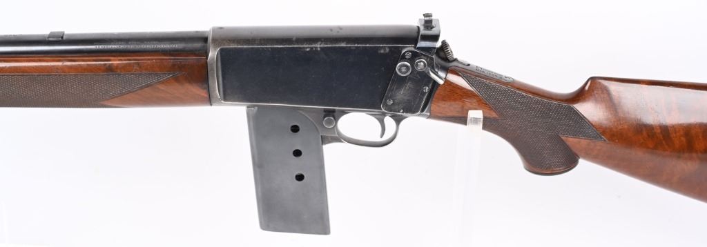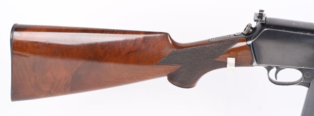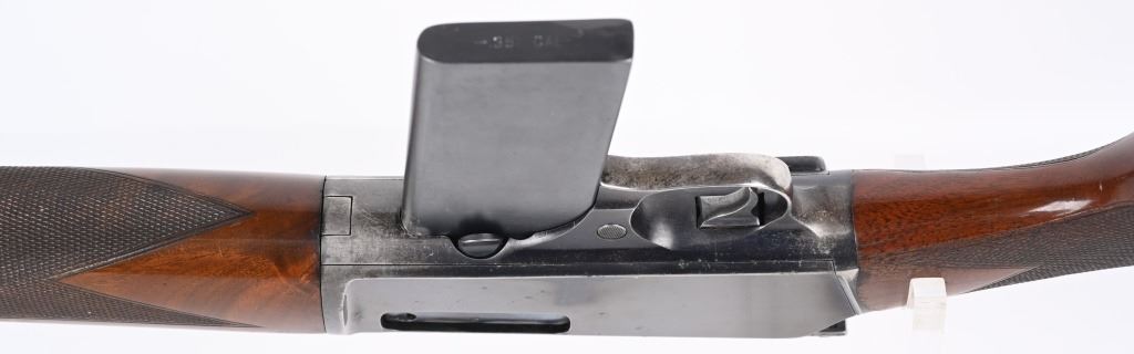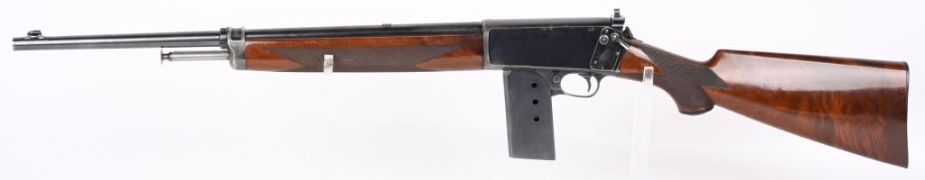 SERIAL NUMBER 9914 BARREL 20" CALIBER 351 SELF LOADING MANUFACTURED 1907. Produced by Winchester as the first truly successful big bore semi-automatic rifle. Used by police agencies and even purchased by foreign military units during WW1. Deluxe versions are rarely encountered. High polished blue finish with highly figured deluxe American walnut with a piano varnished finish checkered in the "H" pattern at forearm and pistol grip. 10 round extended factory magazine and factory fitted with the Lyman side sight. Previous owner at some time had a custom steel butt plate made that is relief engraved of the American Big Horn sheep. Rifle also has the original gutta percha Winchester butt plate. CONDITION. Very fine with over 95% of the high polish blue remaining. The bore is excellent bright and sharp. The deluxe finished stocks are very fine with some very minor period of use impressions and bruises. The action operates properly. C&R