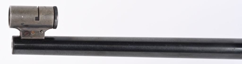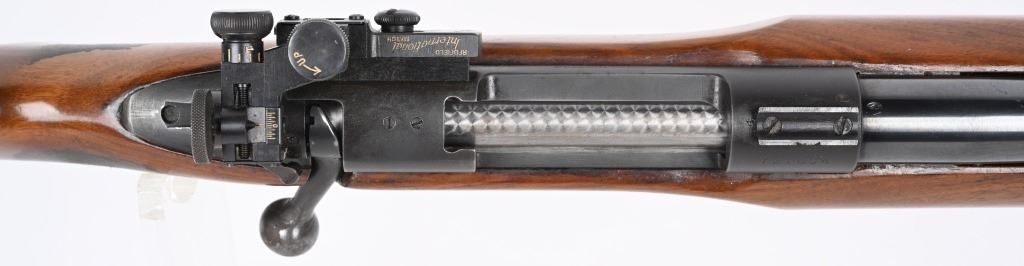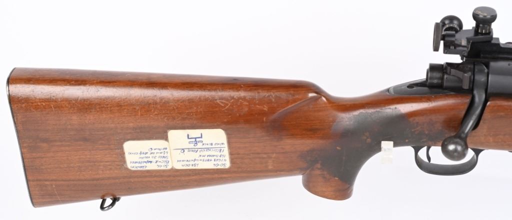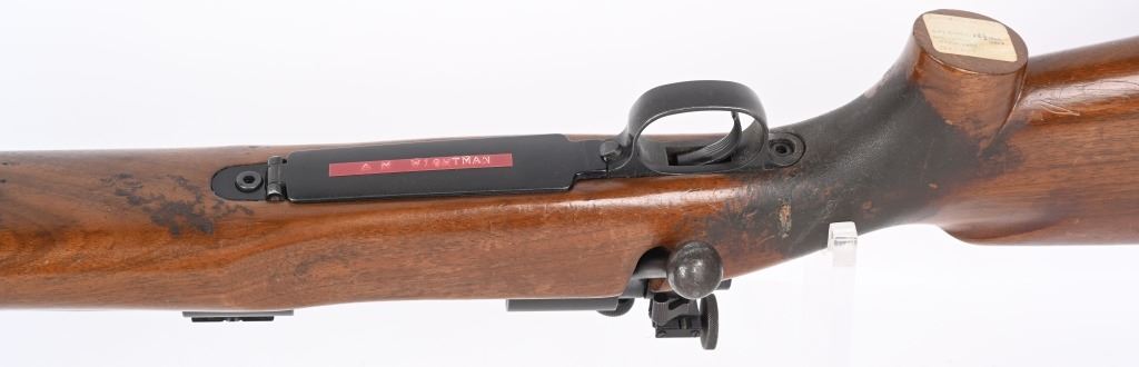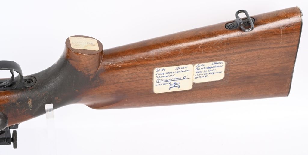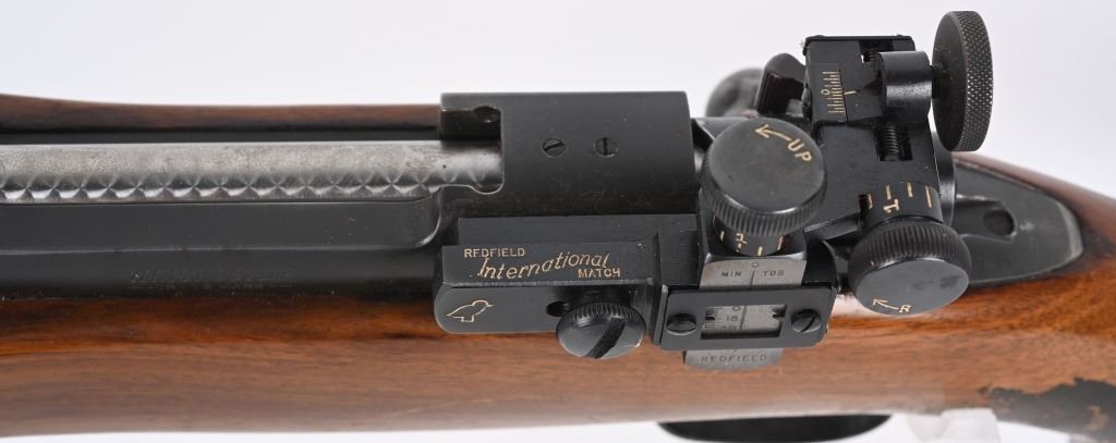 SERIAL NUMBER 721604 BARREL 24" CALIBER 30-06 SPRINGFIELD MANUFACTURED 1964. Blue finished Model 70 Winchester with 24" factory Winchester marked Heavy barrel with Redfield International globe front sight and Redfield International Match rear micrometer rear sight. Winchester over sized varnished target stock with checkered steel butt plate and adjustable hand stop in forearm. Rifle has the previous competitors name attached to the magazine floor plate "A.M.WIGHTMAN" The shooters range "Dope" is still attached to the right side of the butt stock. CONDITION. Good with excellent bright bore. Action operates smoothly Rifle has some finish losses on barrel and edges from use. Stock has typical range wear and impressions. C&R
