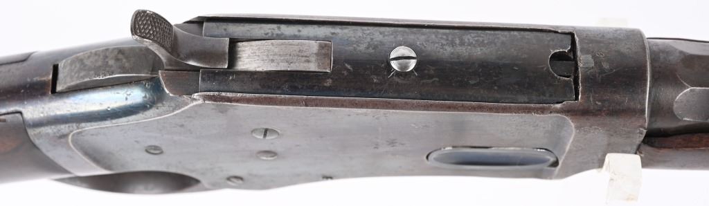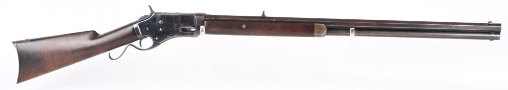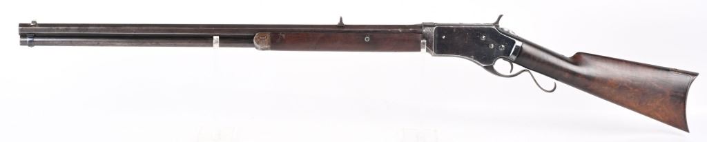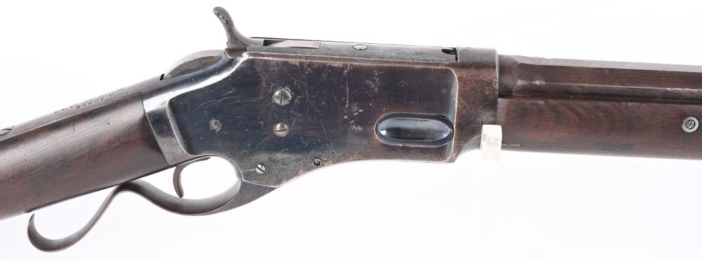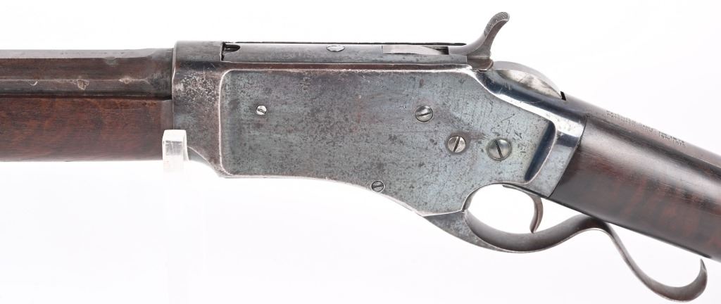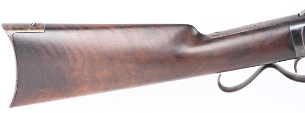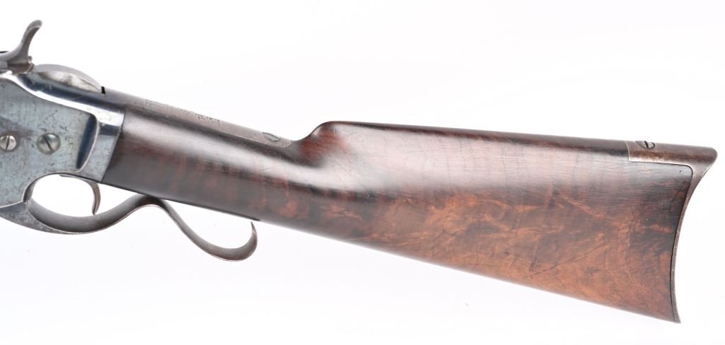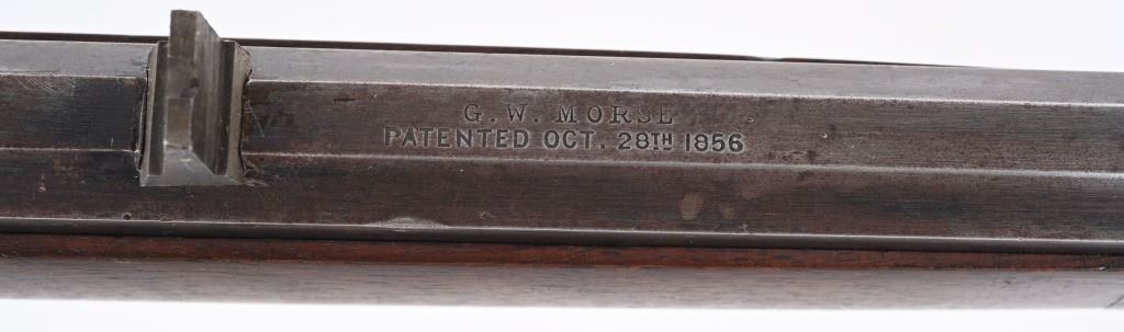 SERIAL #163 . BARREL 28". CALIBER 45-70. Less than 1500 made in both models, 1st models being very rare. Made 1878-1882. Barrel stamped G.W. MORSE with patent date of 1856. Tang stamped A. BURGE (no ss) with 1875 patent date. Large frame, large caliber early repeater pre-dates the 1881 Marlin, Features a full octagon barrel, full magazine, knife blade front sight, single standing leaf rear sight, early S-lever, walnut stocks with non-trap butt plate. Frame has early high polish blue finish. Condition. Frame retains at least 75% of the high polish blue, Peacock blue on loading gate and frame screws. Barrel retains generous flashes of blue mixing soft patina with razor sharp legends. Stock is excellent. Fore-arm has a tight 3.5" hairline. Barrel breech has couple of small chuck marks. Forward frame sides have some light denting from small hammer. Bore is sharp. Very handsome seldom seen big bore lever. ANTIQUE