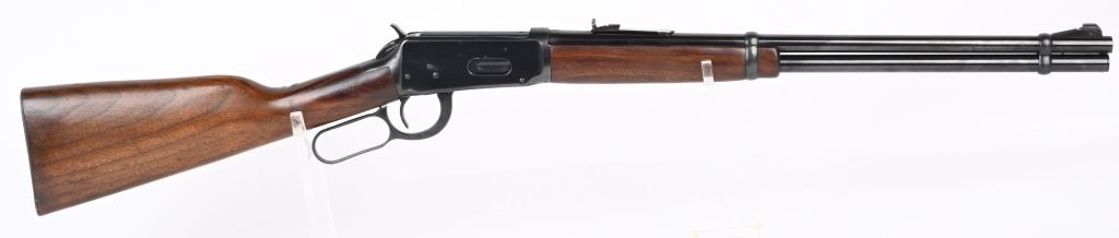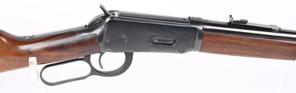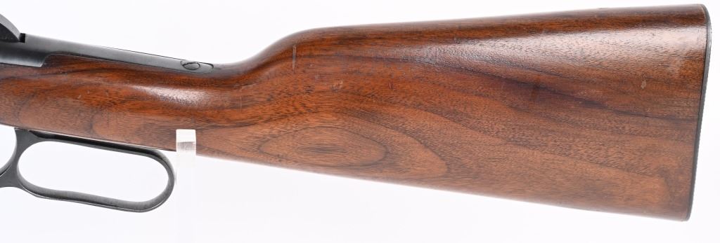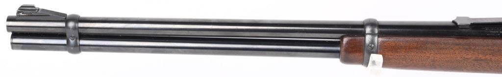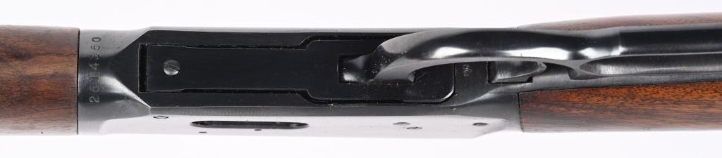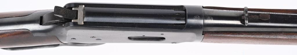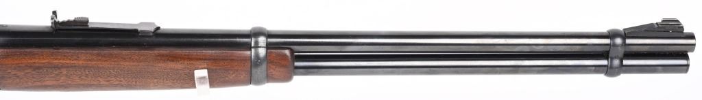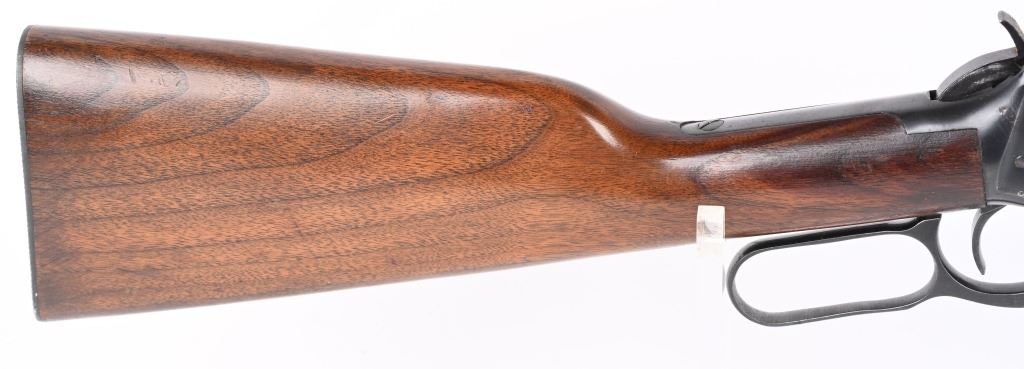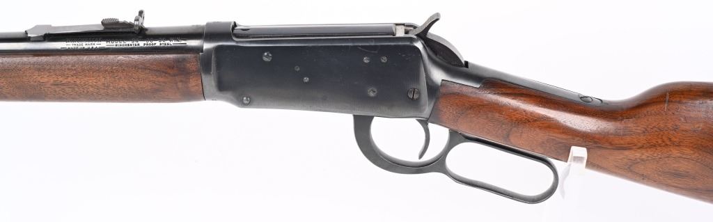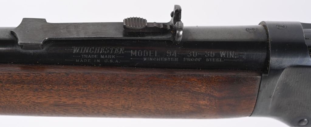 SERIAL NUMBER 2514350 BARREL 20" CALIBER 30 WCF ( 30-30) MANUFACTURED 1962, The American rifle the Winchester 94 with blue finish and varnished walnut stocks. Full length magazine. Ramped blade front sight with elevation adjustable sporting rear sight. Checkered steel butt plate. CONDITION. Very fine with excellent bright bore and carbine retains over 98% blue finish with slight edge wear. Stocks are excellent with a few period of use impressions and bruises. C&R