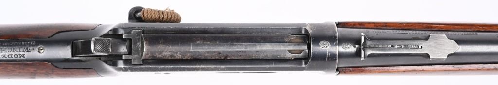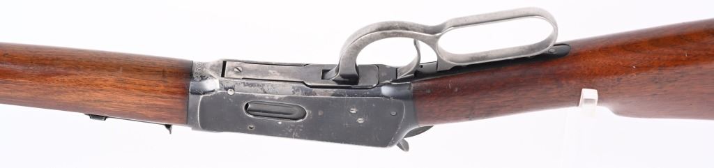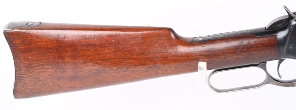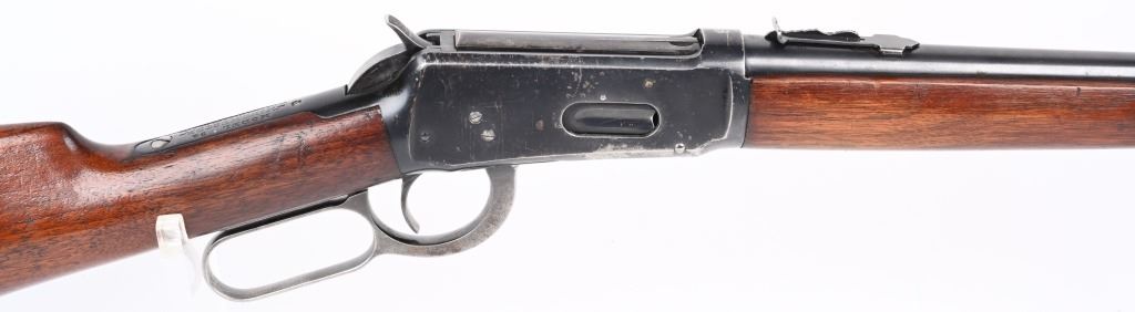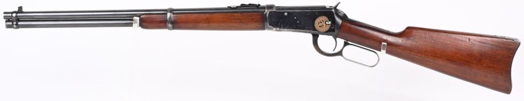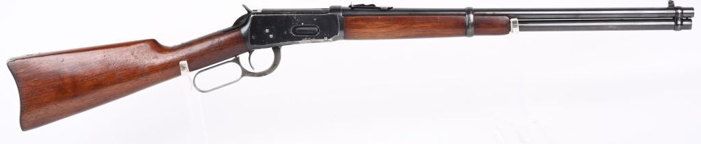 SERIAL NUMBER 957166 BARREL 20 " CALIBER 32 WINCHESTER SPECIAL MANUFACTURED 1923. The Saddle ring carbine in not commonly found in the .32 Winchester Special Cartridge. Mounted with 20" round barrel, staple mounted blade front sight with elevation adjustable sporting carbine rear sight. Oil finished walnut stocks with carbine steel butt plate and fitted with saddle ring stud and ring on left side of receiver. CONDITION. Good with barrel and magazine retaining 90% blue finish Brilliant bright bore with sharp rifling. Stocks are very fine. Receiver retains 85% blue finish with losses at lower edges and balance point. Action operates properly. C&R