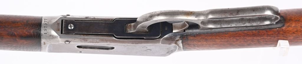 SERIAL NUMBER 197977 BARREL 26" CALIBER 38-55 WCF MANUFACTURED 1903. Blue finished with case colored hammer and lever. Round barrel with full magazine. Varnished straight grained American walnut stocks with crescent butt plate. Blade front sight with elevation adjustable sporting rear sight. CONDITION. Good with good shootable bore with oxidation in grooves. Stocks are very good , full sized and retain and abundance of factory varnish/ The rifle retains over 40% blue finish on barrel , magazine, receiver ,bolt. Hammer and lever have traces of case colors in more protected areas. Action operates properly. C&R
