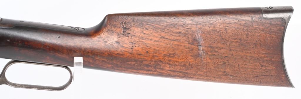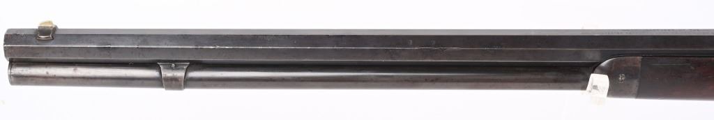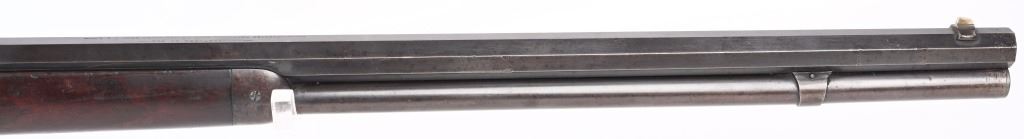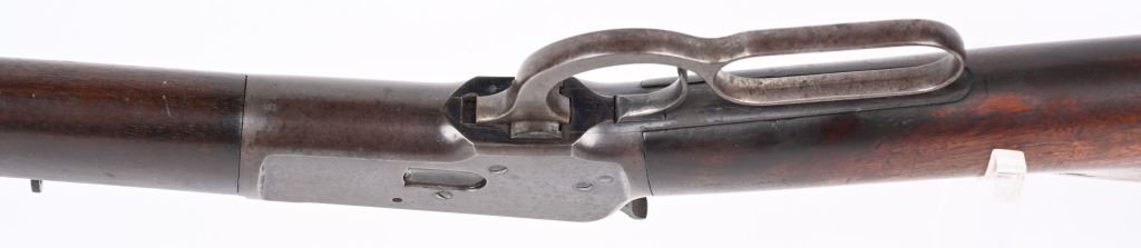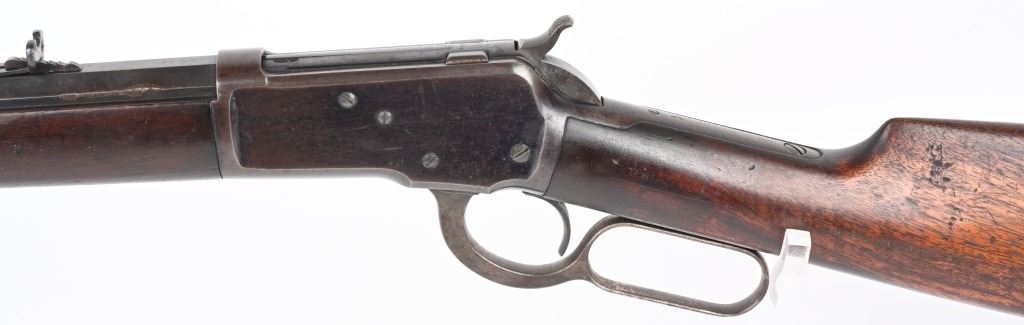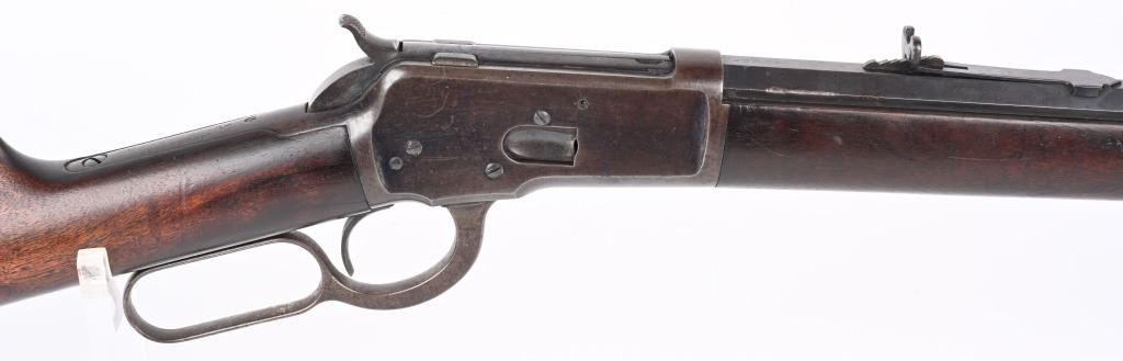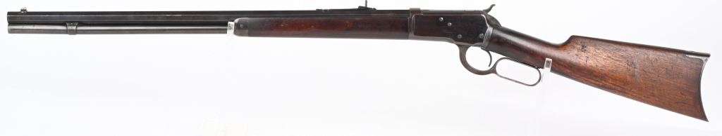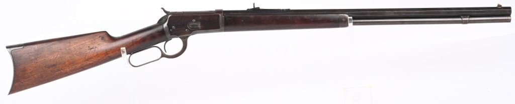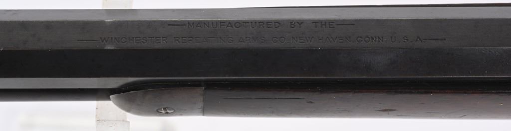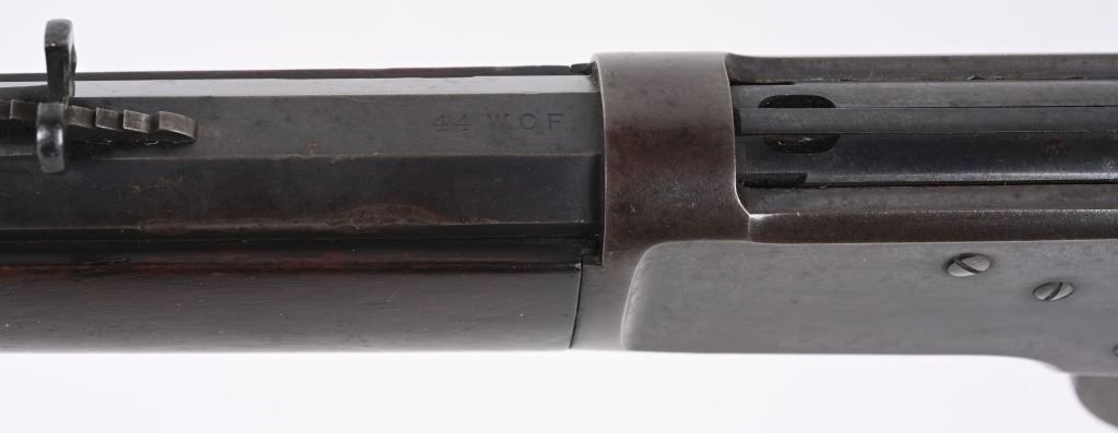 SERIAL NUMBER 571 BARREL 24" CALIBER 44 WCF (44-40) MANUFACTURED 1892. 1st year production Antique Winchester model 1892 rifle with full octagon barrel and full magazine. Blue finished with case color hammer and lever. Sporting blade front sight with elevation adjustable rear sight. Varnished straight grain American walnut stocks with crescent butt pate. Standard 2 line Winchester address on top barrel flats with top of chamber marked "44W.C.F." Serial number on belly of action "571". CONDITION. Good with rifle retaining 60 blue finish with balance turning an honest plum patina. The stocks are very good with period of use impressions and bruises. Hammer and lever retain traces of case color in protected areas. The bore has strong visible rifling with darkness in grooves. Action operates properly with solid lock-up. ANTQUE