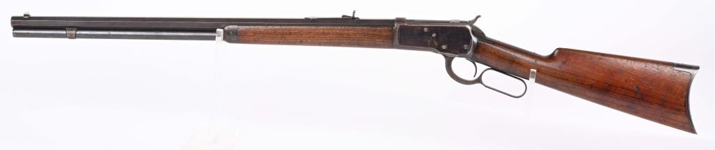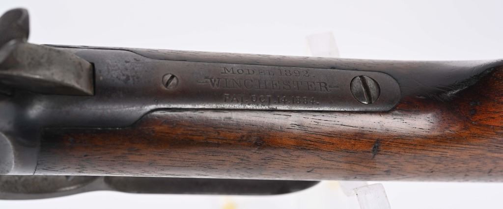 SERIAL NUMBER 25443 BARREL 24" CALIBER 38 WCF ( 38-40) MANUFACTURED 1894. Good antique range Winchester 1892 rifle with 24 " full octagon barrel and full magazine. Varnished straight grain American walnut stocks with crescent butt plate. Blue finish with case color hammer and lever. Sporting blade front sight with correct elevation adjustable sporting rear sight. Traditional Winchester 2 line barrel address with top flat of chamber marked "38W.C.F." CONDITION, Good with rifle retaining 40% blue finish with balance turning plum. Bore is dark with strong rifling. Action operates properly. Stocks are good with an abundance of original varnish and no cracks or material losses. ANTIQUE