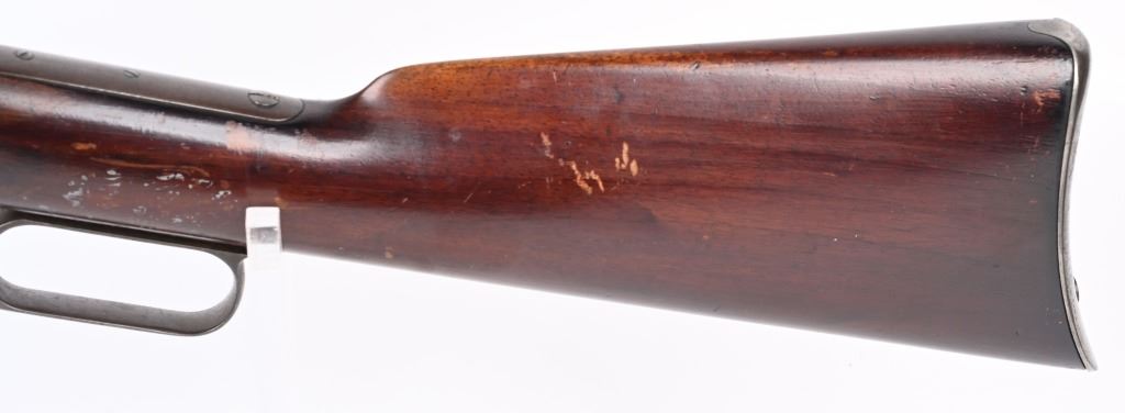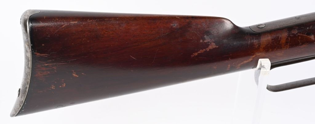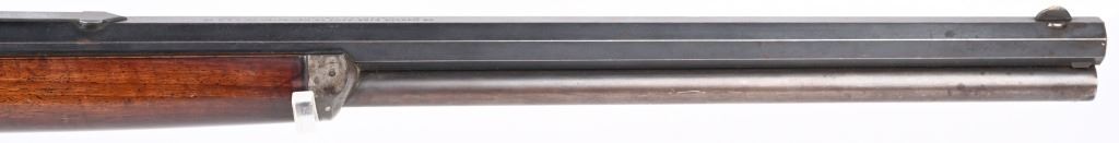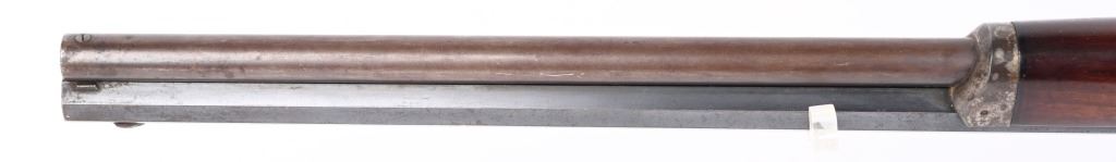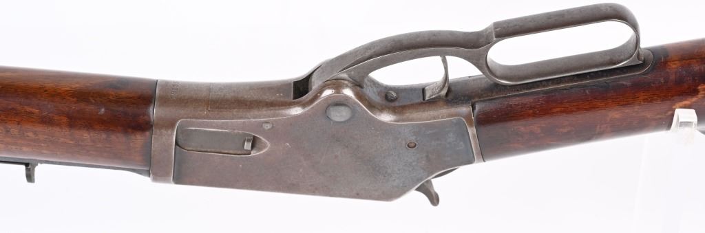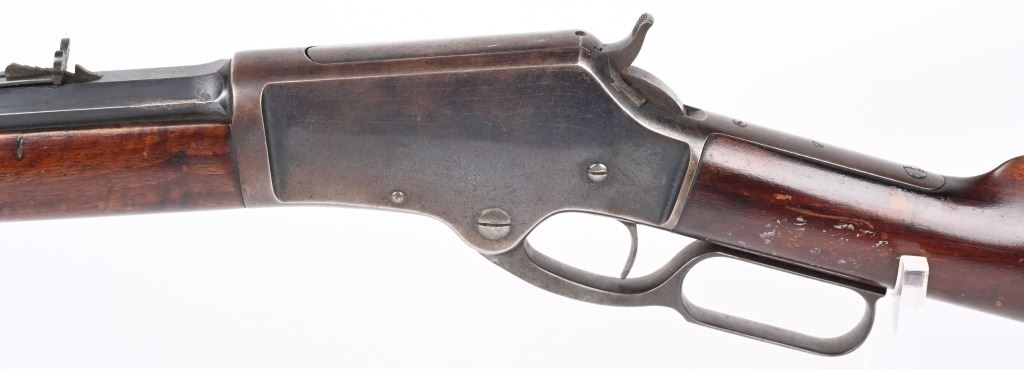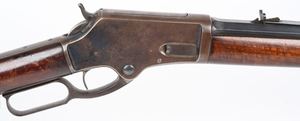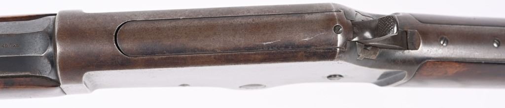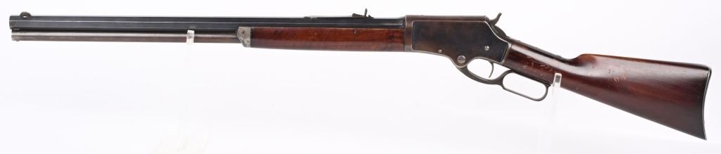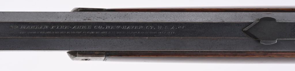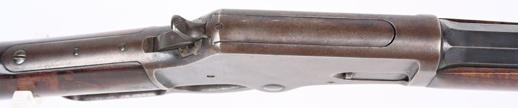 SERIAL NUMBER 18135 BARREL 24" CALIBER 40 (40-65?) MANUFACTURED CIRCA 1890. Blue finish with case color hammer and lever. 2 piece walnut stocks with crescent butt plate. Octagon barrel with Marlin address on top flat. Sporting blade front sight with elevation adjustable rear sight. Chamber marked "40 CAL.". CONDITION with rifle having over 50% blue mixed with patina. Brilliant bright bore with sharp rifling. Action operates properly. Stocks have addition varnish added. Barrel has scratches from being grasp with wrench. ANTIQUE