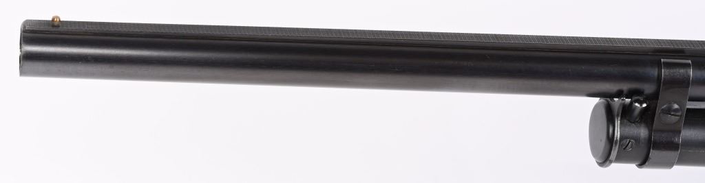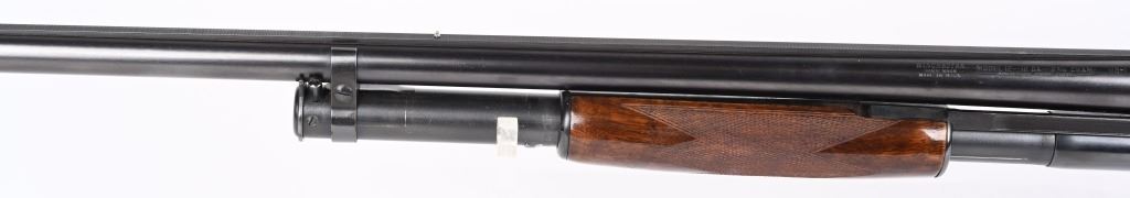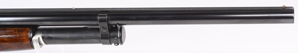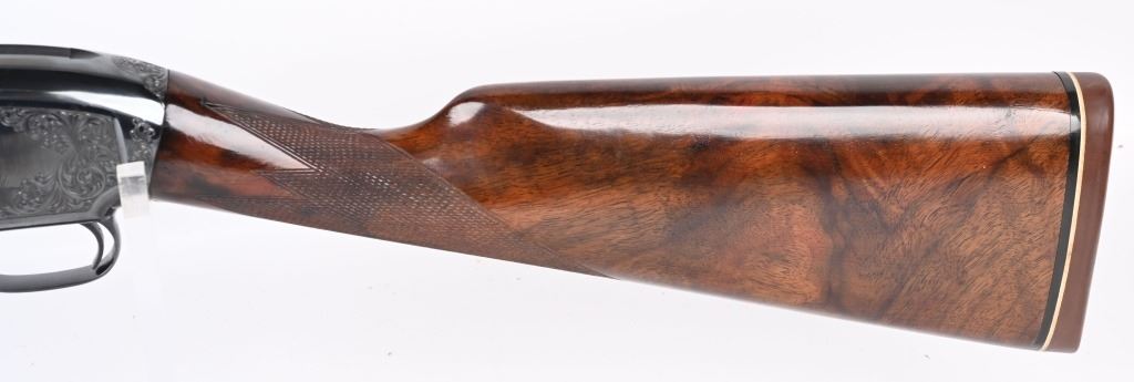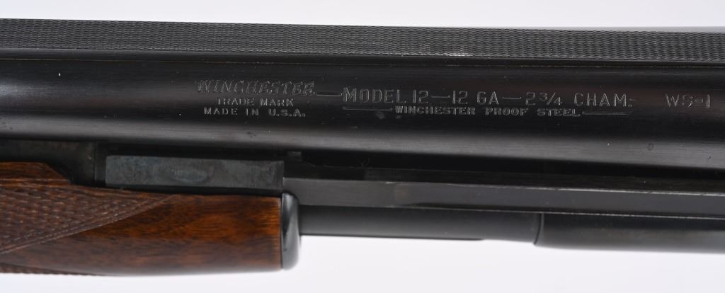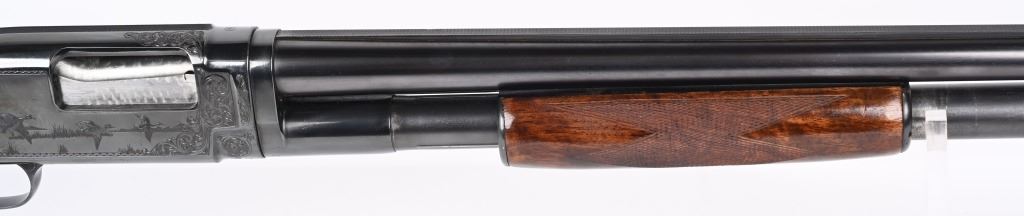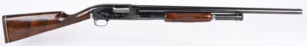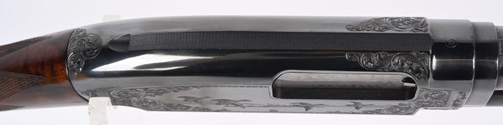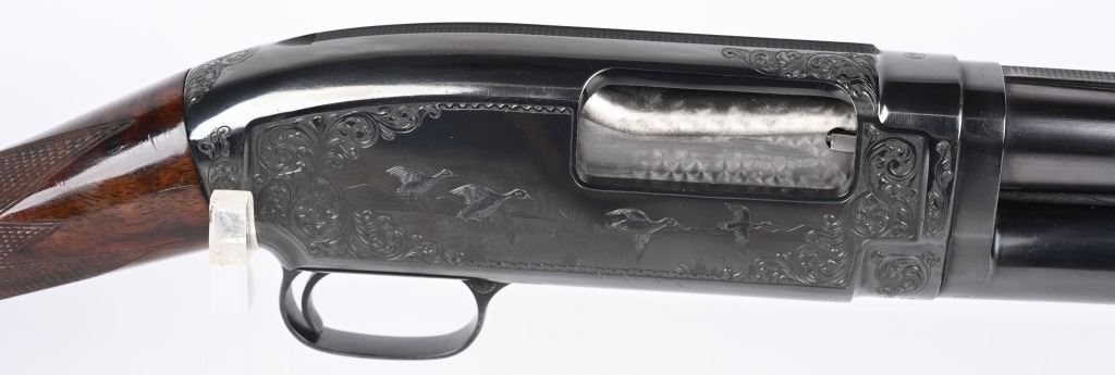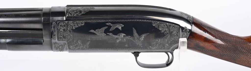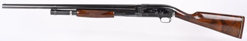 SERIAL NUMBER 1593078 BARREL 26" CALIBER 12 GAUGE MANUFACTURED 1958. Winchester Model 12 Skeet with solid rib and choke WS-1 with Straight stock and slim fore arm . Shotgun has been engraved by Master engraver John Adams who later became a Colt custom shop engraver. Originally working for R.L. Wilson in his engraving shop. Shotgun is masterfully engraved with 2 full coverage game scenes of flushing waterfowl over wetlands with chiseled borders and scrolls on trigger guard and top of receiver. Stocks are Winchester deluxe checkered straight stocks with polished varnish finish over thin Pachmayer rubber recoil pad. CONDITION. Very fine as custom embellished with bright bore and properly operating action. Stocks are very fine and shotgun retains over 98% blue finish with traces of finish loss on magazine from operational use. C&R