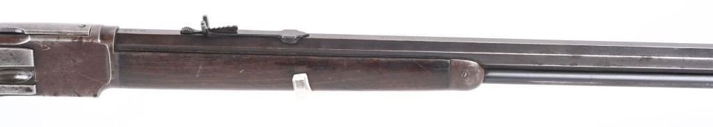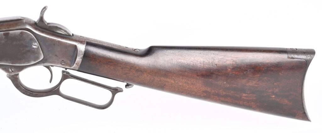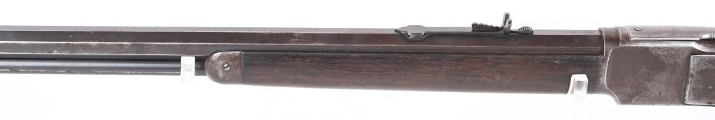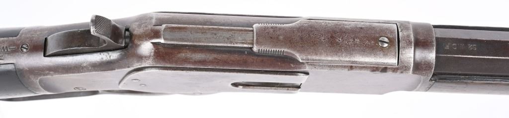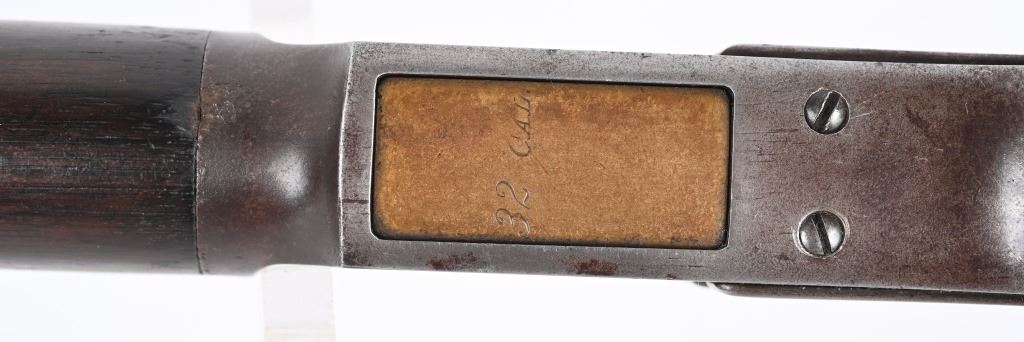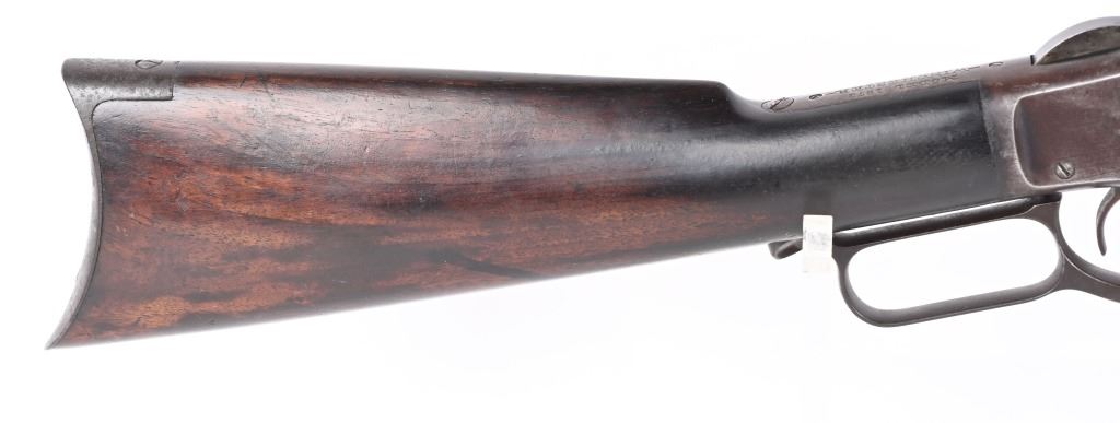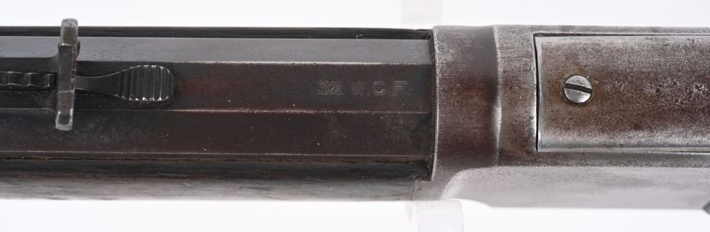 SERIAL 589372. BARREL 24". CALIBER 32-20. MADE IN 1905. Features full octagon barrel & magazine, Winchester semi buckhorn rear sight, blue finish, walnut stocks, rifle butt plate with no trap. Condition. Flashes of bright blue on barrel and tube turning patina. Frame has no original finish Stock is excellent , proud to metal with overall darkening from oil. Forearm has a few minor dings. Bore is excellent. Barrel legends strong. C&R