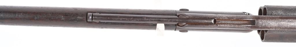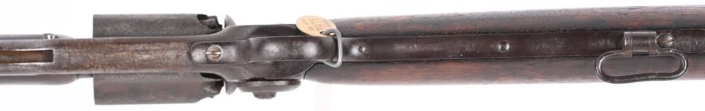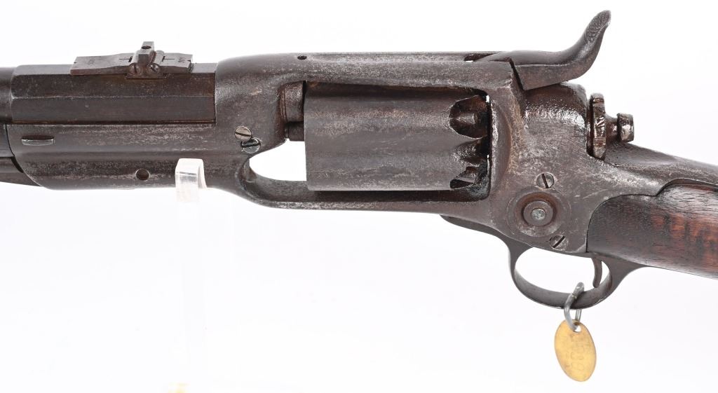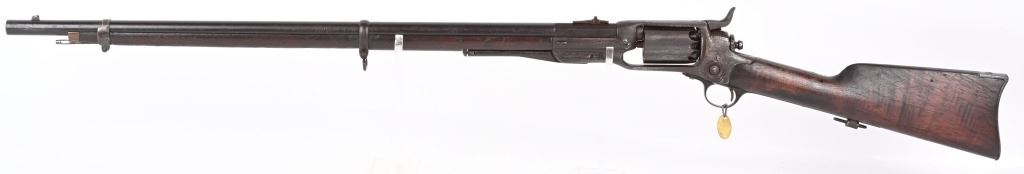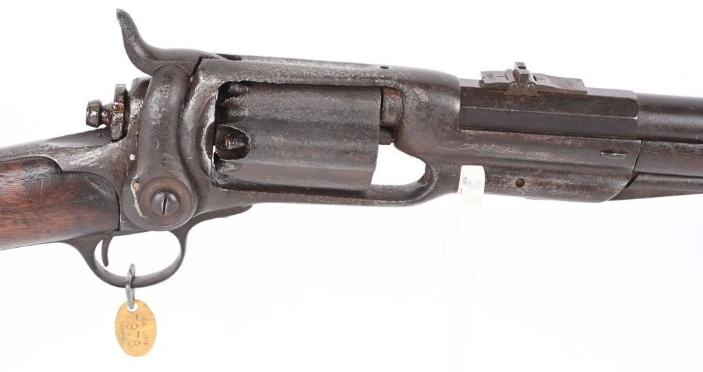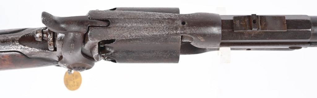 SERIAL 3634. BARREL 31". CALIBER .56. MADE 1856-64. Five shot, single action, exposed hammer, revolving cylinder, full length walnut forearm, walnut stock with steel carbine butt, folding leaf rear sight, sling swivels, brass fore-arm tip, replaced cleaning rod. Has brass J.M. Davis MEMORIAL Collection, OKLAHOMA, The largest privately-held firearms collection in the world . Top strap stamped COLT'S PT/ HARTFORD CT USA. Fluted cylinders. two band. Condition . Good, metal is deep brown with some scattered salt and pepper finish on frame. Barrel smooth patina. Stocks very good with usual dents and impressions with light hairline at upper wrist. Rifling is visible but shows corrosion. Cylinder spins but needs a hand as it does not index. Decent example of a rare Colt. ANTIQUE
