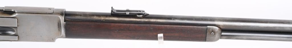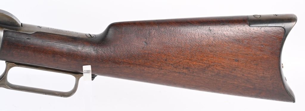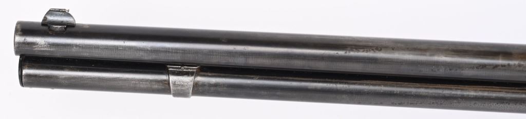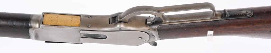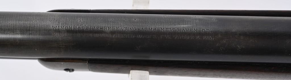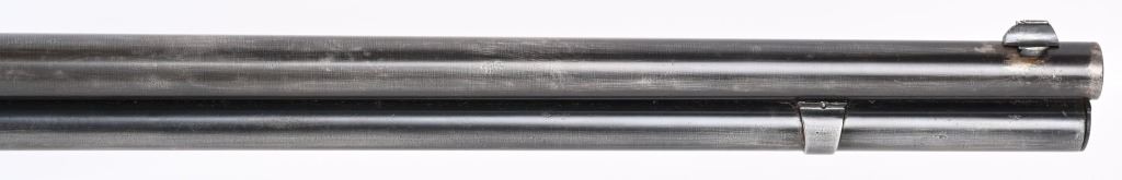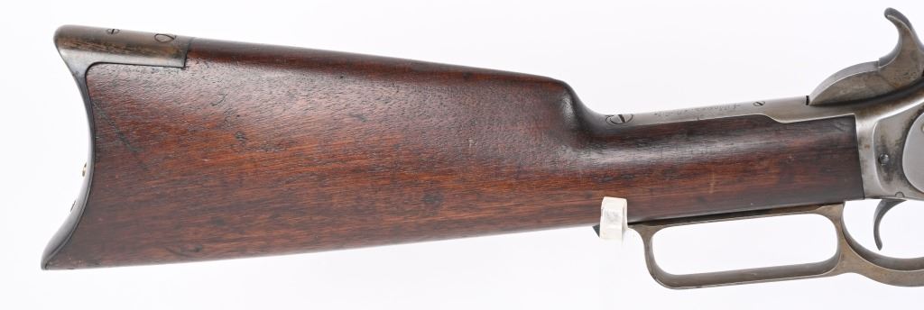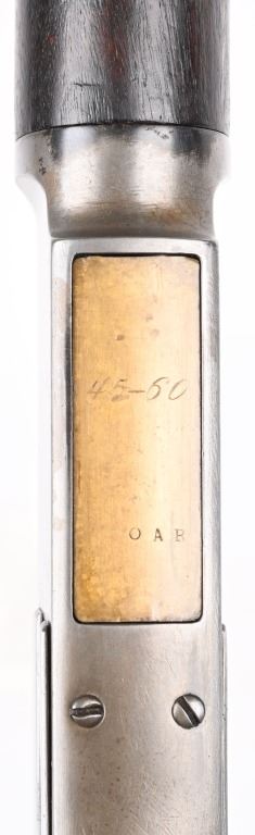 SERIAL 26199. BARREL 28". CALIBER 45-60. MADE IN 1882. Features full round barrel & tube, 1876 dated ladder rear sight, walnut stocks with rifle butt plate, blue finish with case color hammer and lever. Condition. Wood is excellent with one small hairline left wrist. 30% blue on barrel & tube blending to soft patina with sharp barrel legends. Frame has been cleaned with flashes of blue. Bore is excellent. ANTIQUE