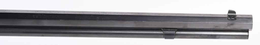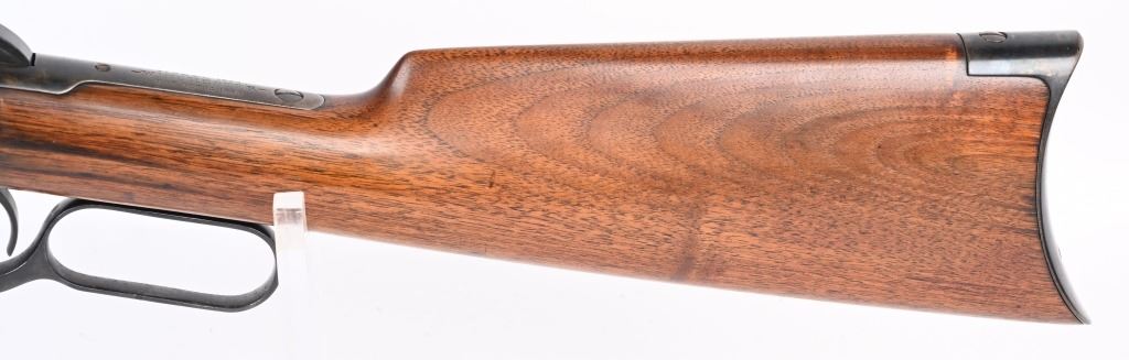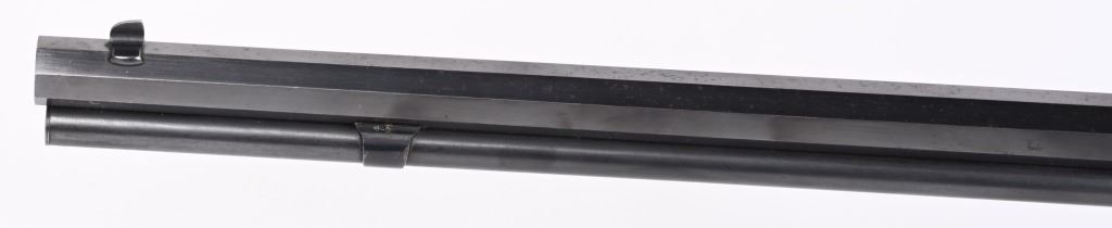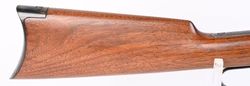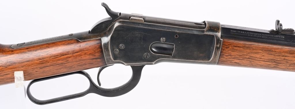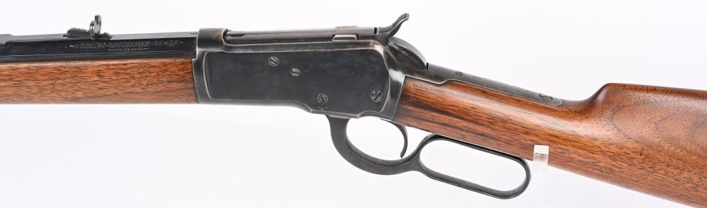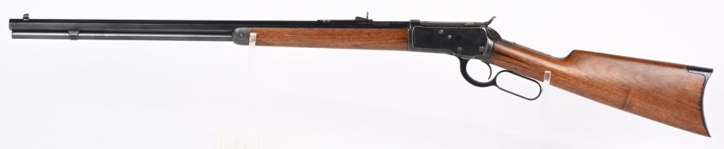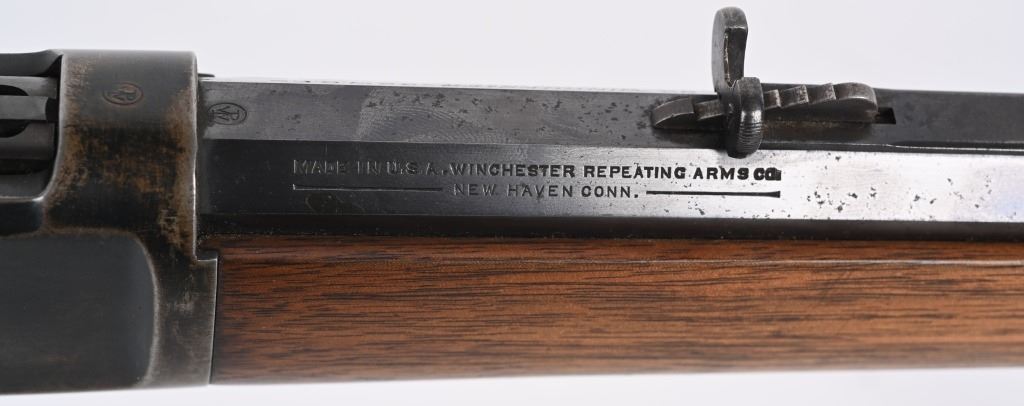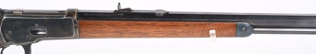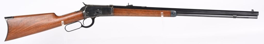SERIAL 129634. BARREL 24". CALIBER 32-20. MADE IN 1896. This gun went back to factory for new barrel with later address style, not 1895. PW proofs on barrel and frame with sporting sights, walnut stocks with blue finish and case color hammer & lever. Features full octagon barrel & tube,walnut stocks. The PW (post 1901) stamps indicate gun was shipped back to factory where new barrel was installed. Condition. 90% blue on frame mixing plum. 95% barrel and tube. Stocks are excellent as refinished. Bore is near mint. ANTIQUE