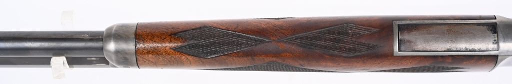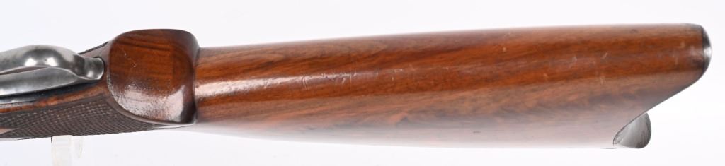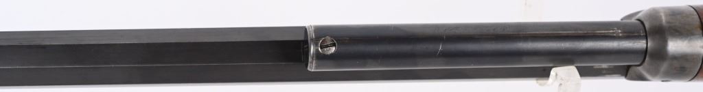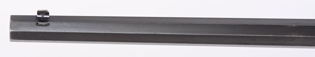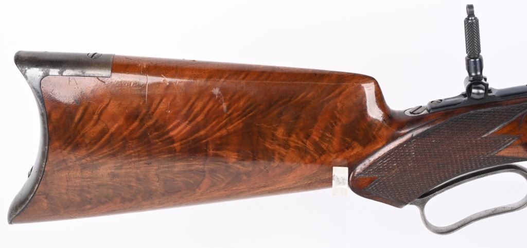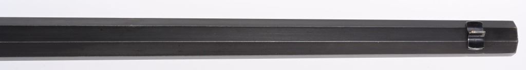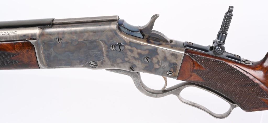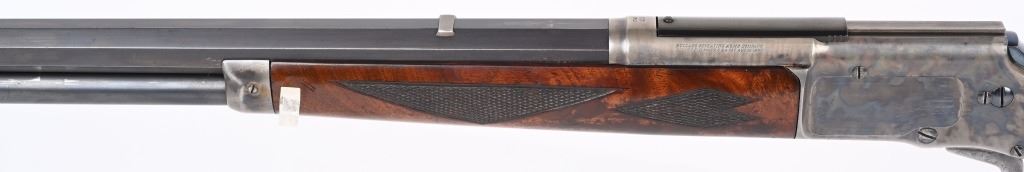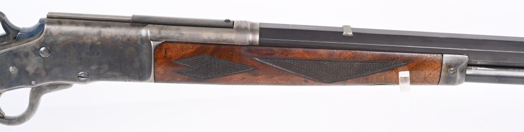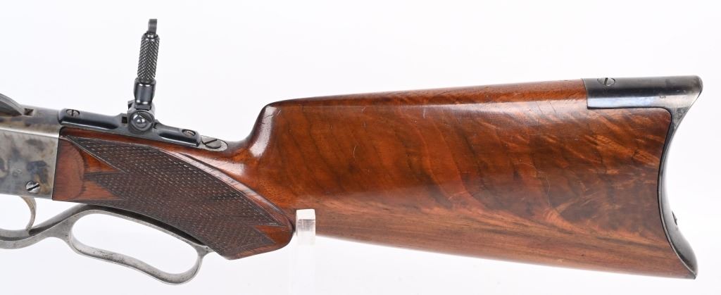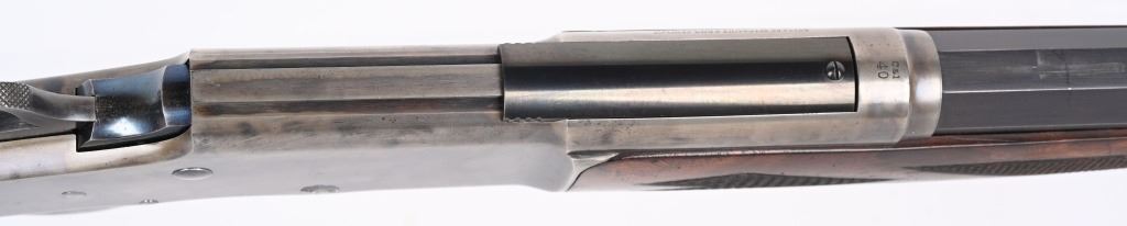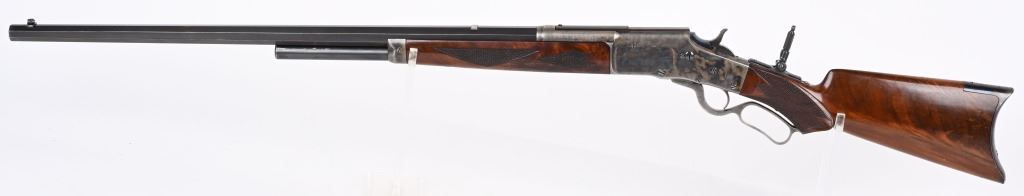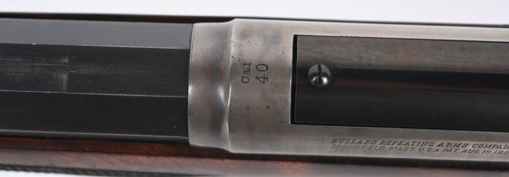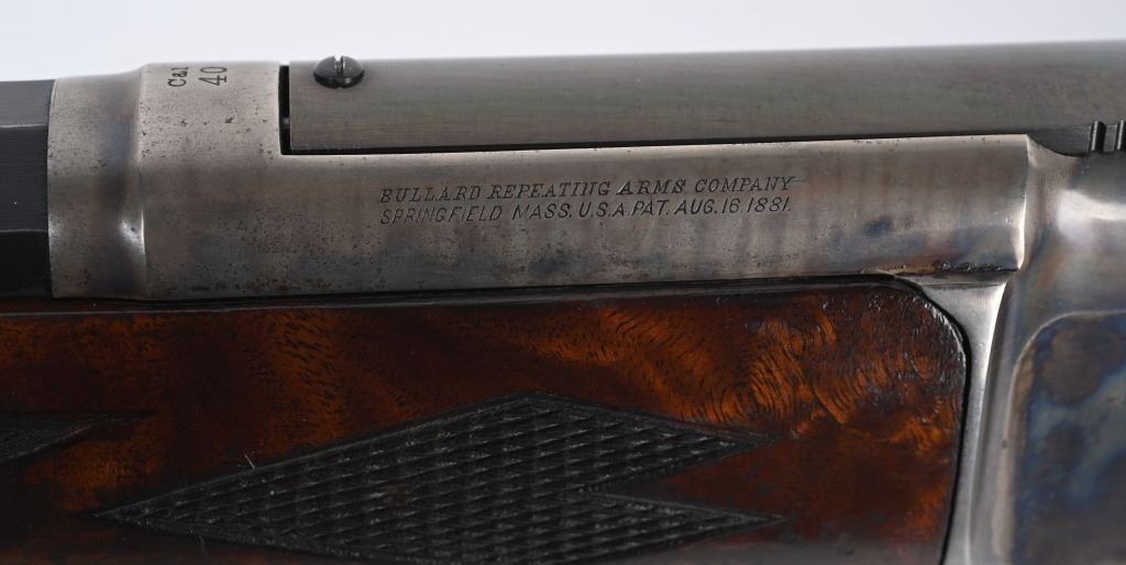 SERIAL 575. BARREL 28". CALIBER .40-75. . MADE 1886-1890. Arguably, the finest lever action rifles made during that era. There really was no standard model as you could order whatever you wanted but the deluxe versions were shipped with deluxe grain walnut, hand checkered pistol grip stock and fore-arm and then any feature you wanted. This example has the very scarce full octagon barrel with half magazine. The Bullard address is stamped on the left side of frame with caliber stamped on bridge. The frame , along with the lever and hammer are case color. The block is peacock blue. The rear sight has a filler and rifle sports a tang sight with standard bead front sight. Butt plate is blue rifle style. Due to the high price of manufacturing and the special attention to each and every rifle priced them out of the market in less than five years. Condition. One of the nicer examples you will find. Barrel retains 97% blue with sharp edges. There is a wear line where rear barrel sight was removed. The frame retains virtually all the case colors, most still bright. The hammer retains most of its original color as well. Lever shows some color on the sides. Butt plate still retains at least 75% of the high polish blue finish. Most of the screws still have generous blue and only a couple are lightly deformed. The wood is excellent with minor bruising. The bore is mirror bright. It's action is probably the smoothest of it's type ever built. A screamer high condition large frame. Even the dust cover retains virtually all the original high polish blue finish.. The nose cap also retains majority of case colors. ANTIQUE