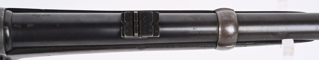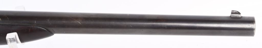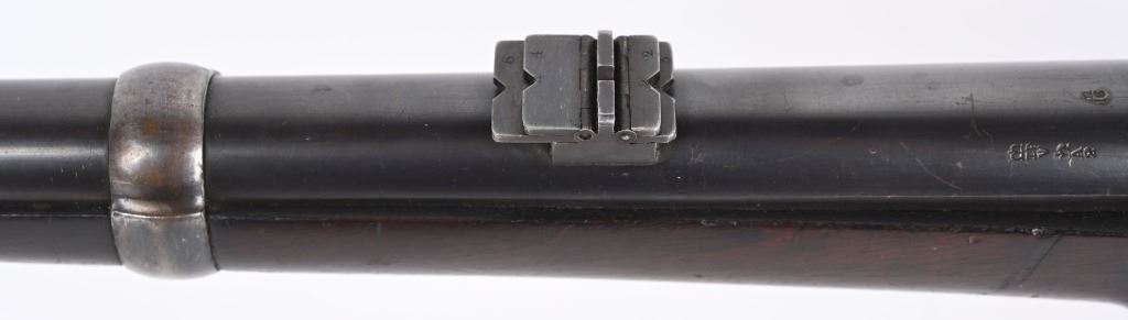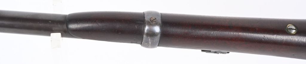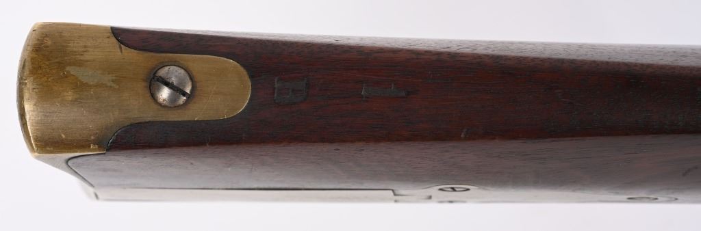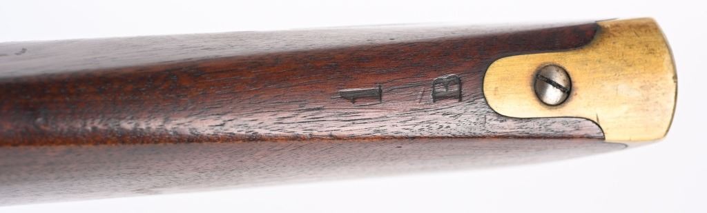 SERIAL 23471. BARREL 19". CALIBER .577 PERCUSSION BREECH LOADING CARBINE. Rare gun is almost unused museum state. Features round blue barrel with British proofs on barrel. Has 1845 date on patent Maynard tape primer door. Patch box and butt plate are brass. Walnut stock. Four folding leaf rear sight blades. British crown proof stamps on tang and barrel breech. Blue finish barrel with case color frame, hammer, lever. Slant breech. Short 3" saddle bar and ring on left side. Blue steel barrel band. Screw heads are true. Peacock blue breech block with undamaged nipple. Condition. Bright bore. Stock has crisp as new cartouche on right side and aside from a few minor impressions, is near mint. Case colors are almost completely intact and bright. Barrel retains 90% blue that is blending butter smooth patina base. Even the barrel band retains 70% blue. Only 6000 produced during the middle of the Crimean war. It would be almost impossible to find a nicer example anywhere. Brass is nicely toned. ANTIQUE