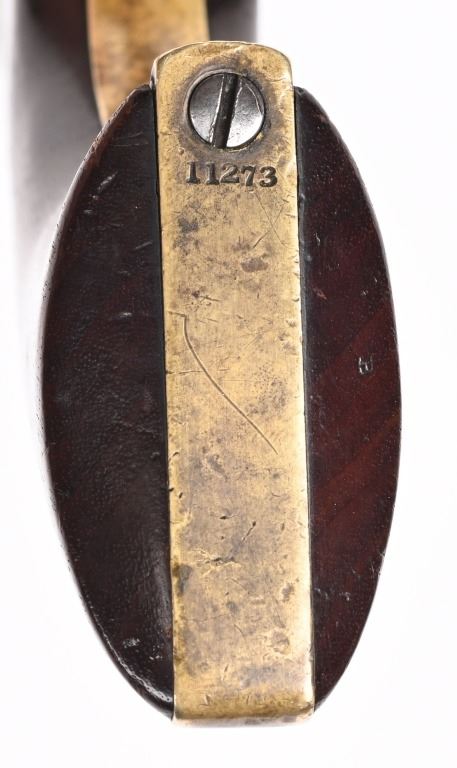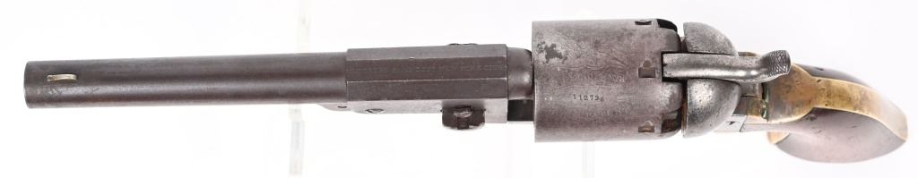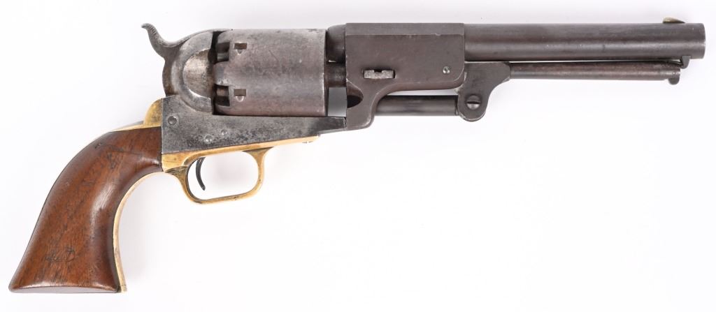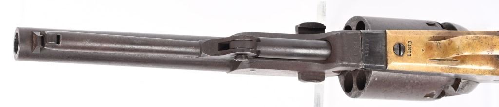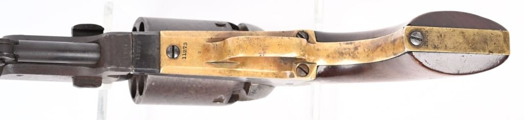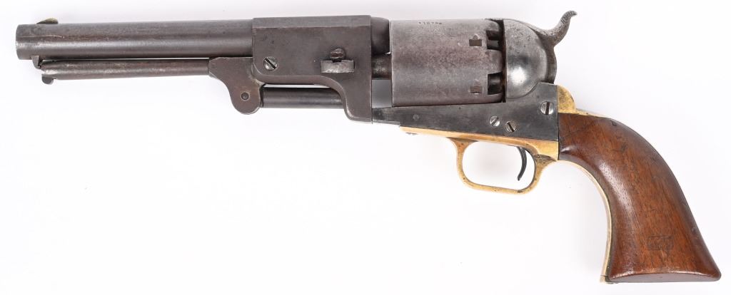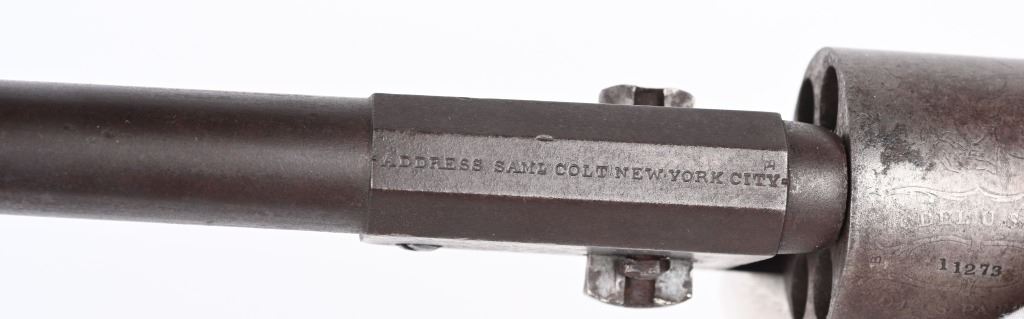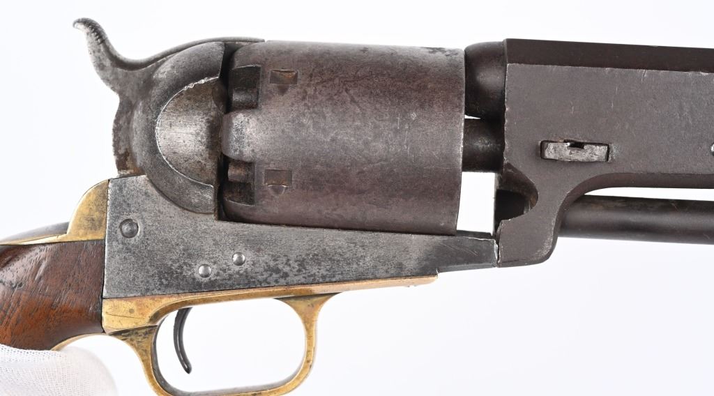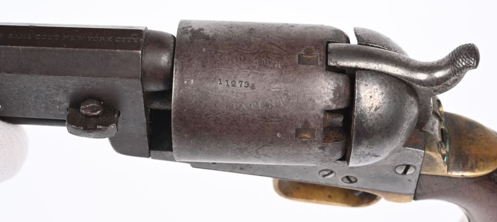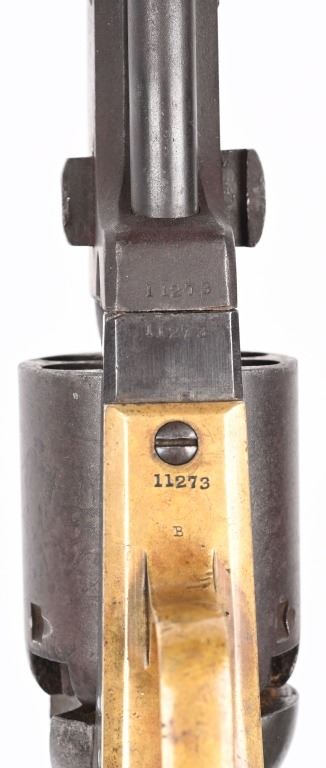 SERIAL NUMBER 11273 BARREL 7 1/2" CALIBER .44 BLACKPOWDER MANUFACTURED 1851. Blue and case color finished with Martially inspected / cartouched one piece walnut grips. One of the 2000 purchased by the US Gov't in 1851. German silver front blade sight with notched hammer ear sight. Oval brass trigger guard, vertical loading lever latch. Non-fluted cylinder is marked "U.S.M.R." with rolled Ormsby, Ranger and Indian battle scene. US inspected on left side of frame below Colt's markings. Varnished one piece walnut grips are cartouched with US inspectors markings on both sides. All primary parts are sub-inspector marked ie: Hammer, loading lever, cylinder, frame , barrel, backstrap and trigger guard. Revolver is all matching numbers including wedge. CONDITION. Fine with exterior having an untouched plum brown patina. Bore is very good and action operates properly. Several screw heads are slightly fouled from period of use disassembly. Grips are very fine with strong cartouches. Brass has toned to a mellow mustard color. ANTIQUE