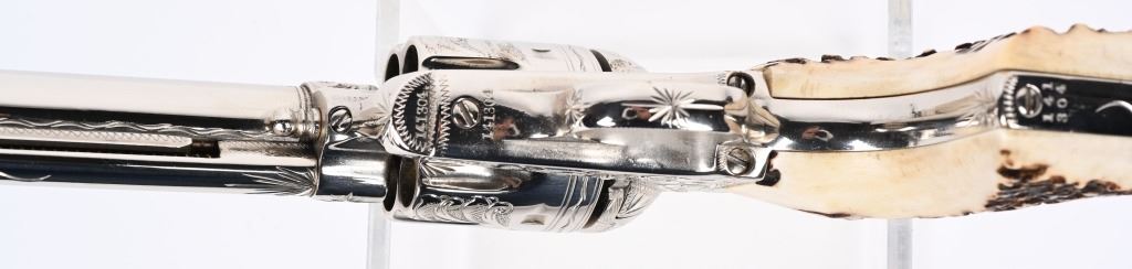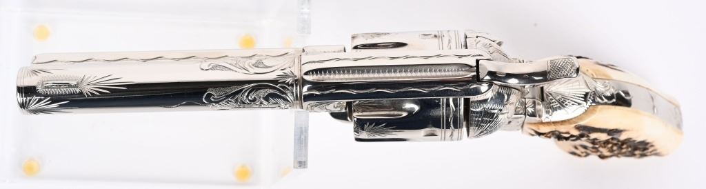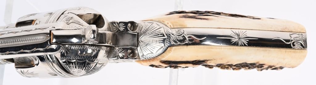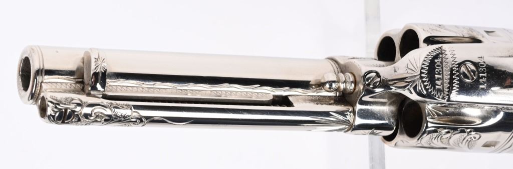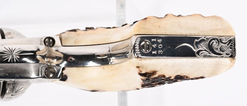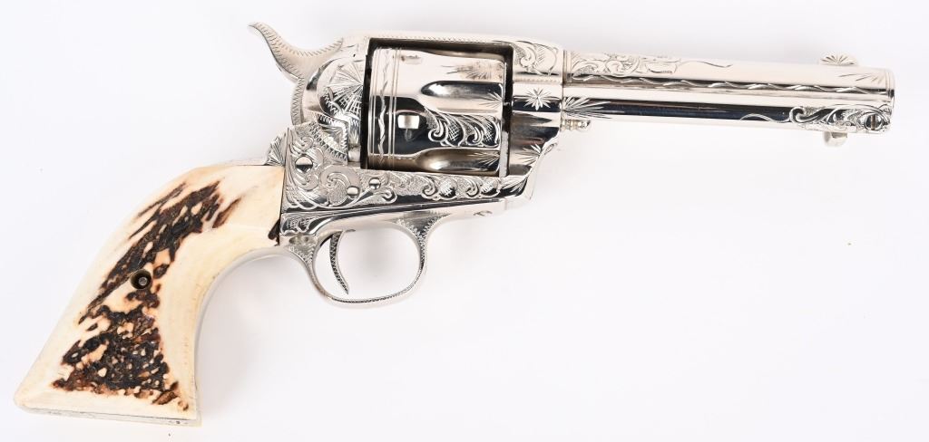 SERIAL 141304..BARREL 4 3/4". CALIBER 38-40. MADE IN 1891. Class three engraved in bank note American scroll , full nickel plated, genuine stag grips, matching numbers on frame, trigger guard and backstrap, black powder frame. Condition. Gun appears in as new unfired condition since the work was performed. There is not a single exposed part of this gun that does not show engraving, even the sides of the trigger. The engraving is flawless and master class quality. All legends are bold but there is no two line address on barrel and original front sight was taken down a bit in its previous life. Edges are sharp. Action feels like a new gun. Bore is strong but there is some frosting. Grips are like new, richly grained. An absolutely stunning old Colt that does not need any paperwork. ANTIQUE