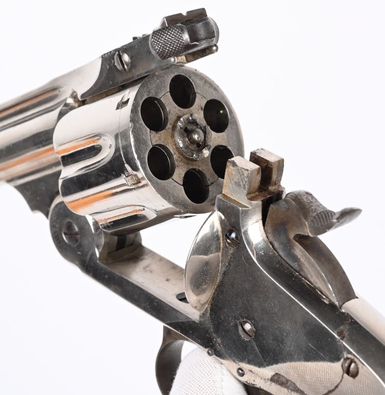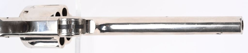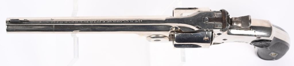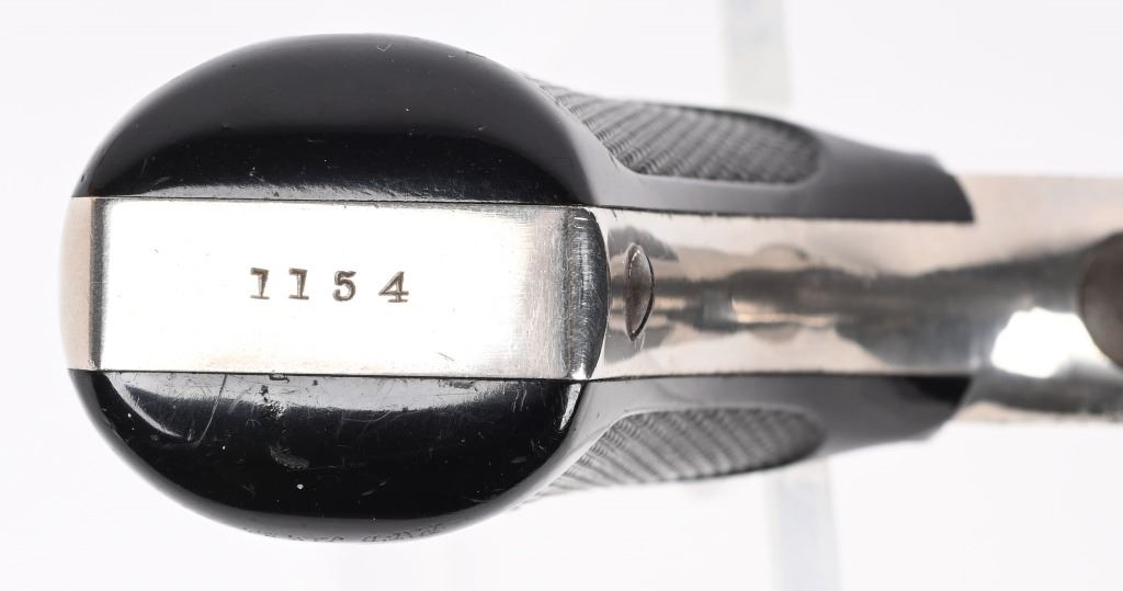 SERIAL 1154. BARREL 6.5". CALIBER .38-44. Very early example in scarcer 38 caliber. Features Paine style front target sight, target rear leaf sight, nickel finish, case color hammer & trigger guard with monogram gutta percha grips. The rear strap is engraved with the Cogswell & Harrison London retailer address. The screw are fire blue rather than nickel as is the trigger. Gun has all matching numbers to include frame, barrel, cylinder as well as etched into the right grip panel. Condition. There is a minor flake on right side of frame and side plate, one on cylinder, a light drag line and a couple on barrel and one small spot on right side of frame. Straps retain almost all the nickel finish and the entire gun is at least 95%. Strong case color on hammer and traces on the guard. Grips are near mint. Action locks up like new. Bore is strong with light frosting. Wonderful condition with rare British retailer engraving. ANTIQUE