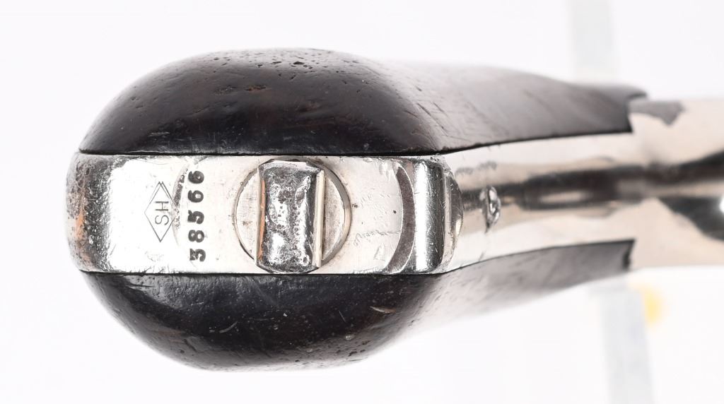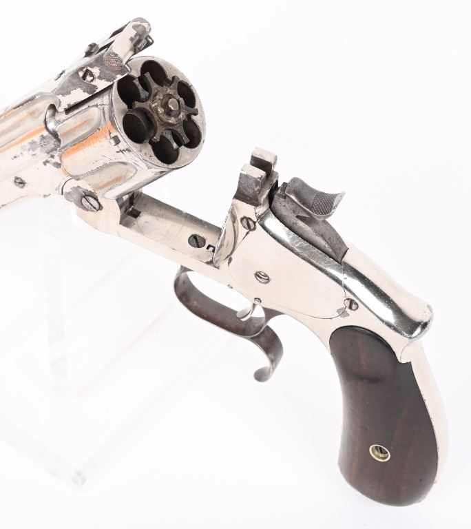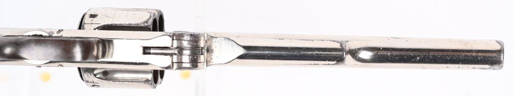SERIAL 38566. BARREL 7". CALIBER .44 RUSSIAN. The Russian style features the barrel address on rib that ends with RUSSIAN MODEL. the rear of the frame as the abrupt knuckle, larger grip frame with two piece walnut grips, factory swivel in butt and sash hook on trigger guard. Nickel finish with case color hammer and guard, half moon front sight. Matching assembly number 235 on cylinder, barrel and latch. Matching serial number stamped inside right grip panel. Condition. There are some scattered small dings, minor wear along barrel sides, some scratches on cylinder, with a couple of small age spots with flaked finish but overall, a very fine 85% gun with excellent grips, mirror bore and strong action. Colors are basically patina. Very famous and easily recognizable six gun popular in the old west. This type of gun was used by Charlie Pitts in the Northfield raid. ANTIQUE