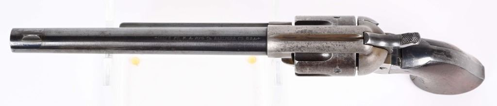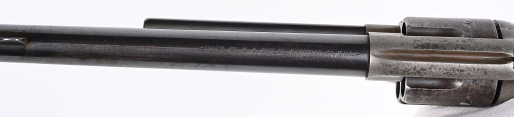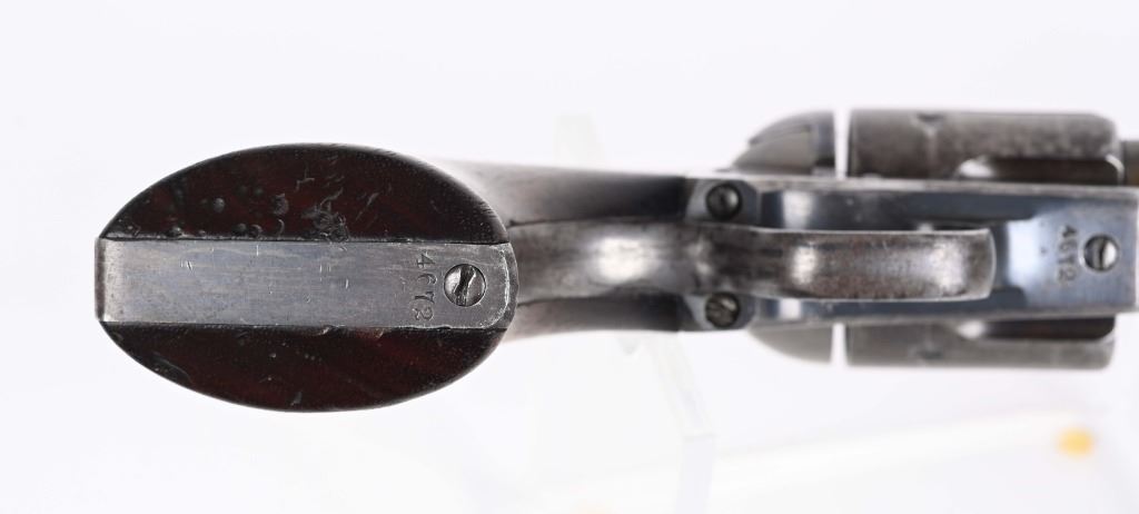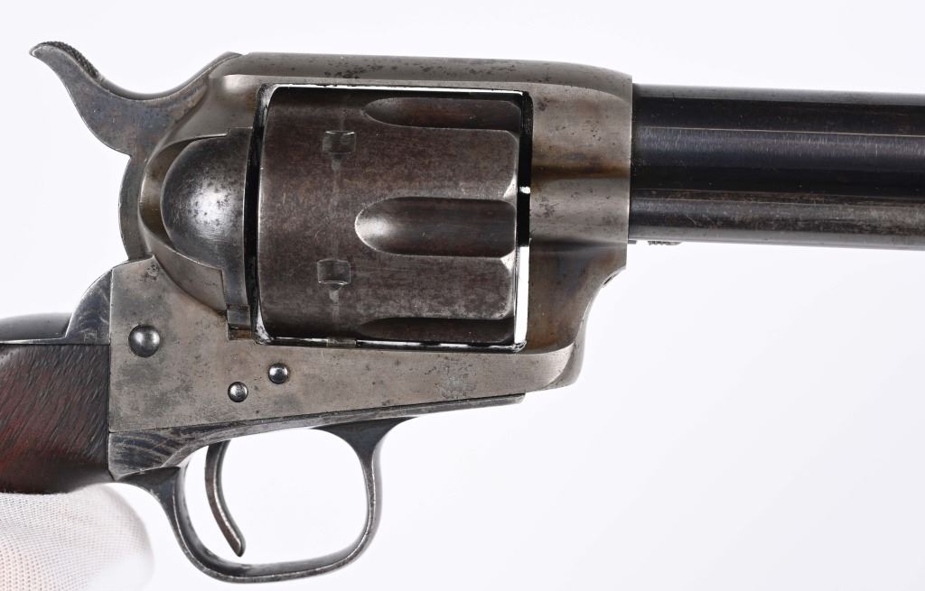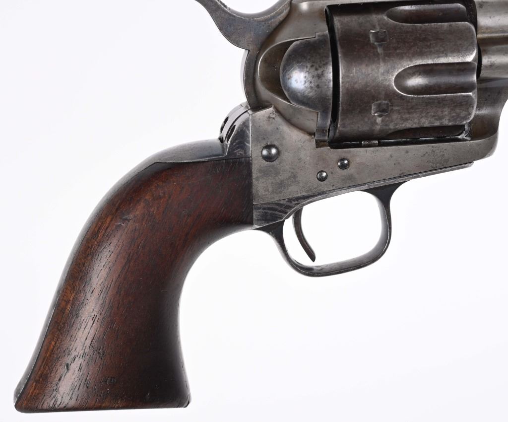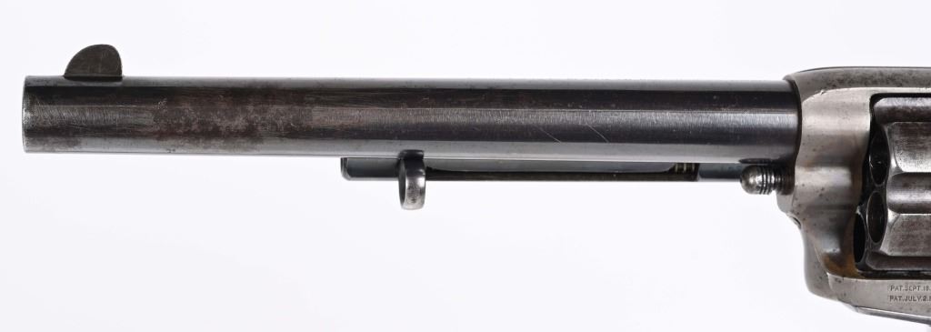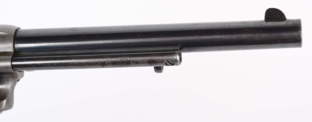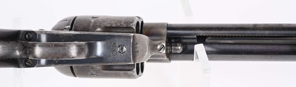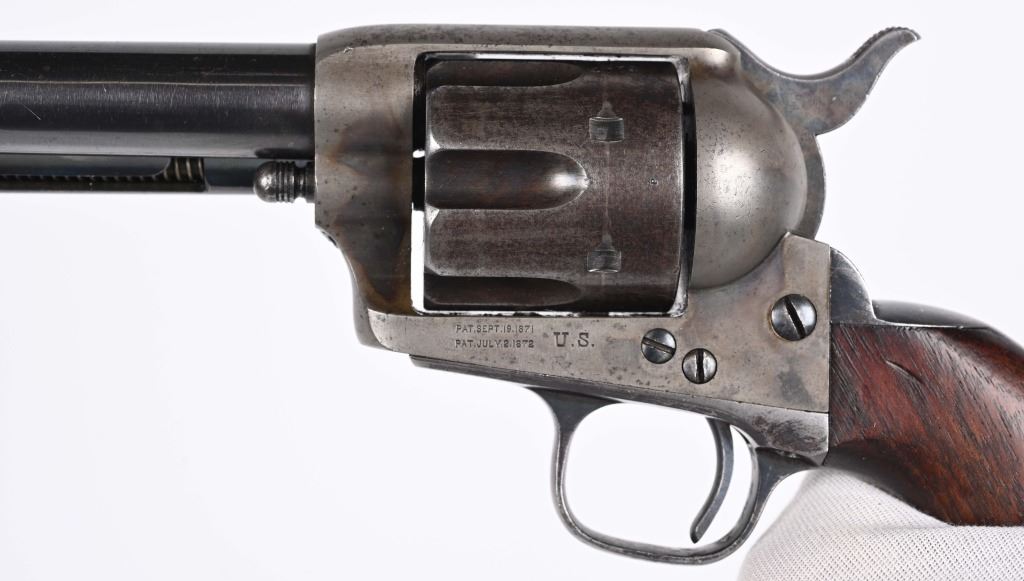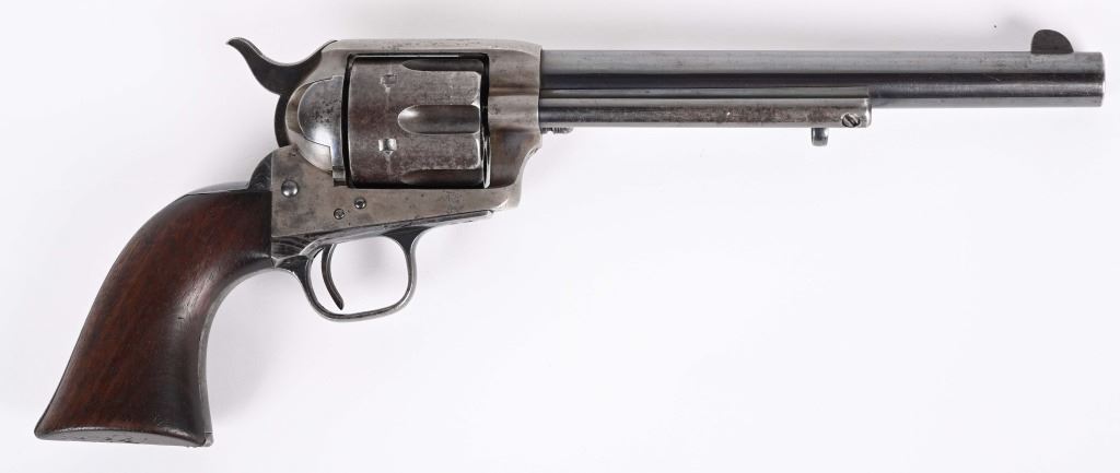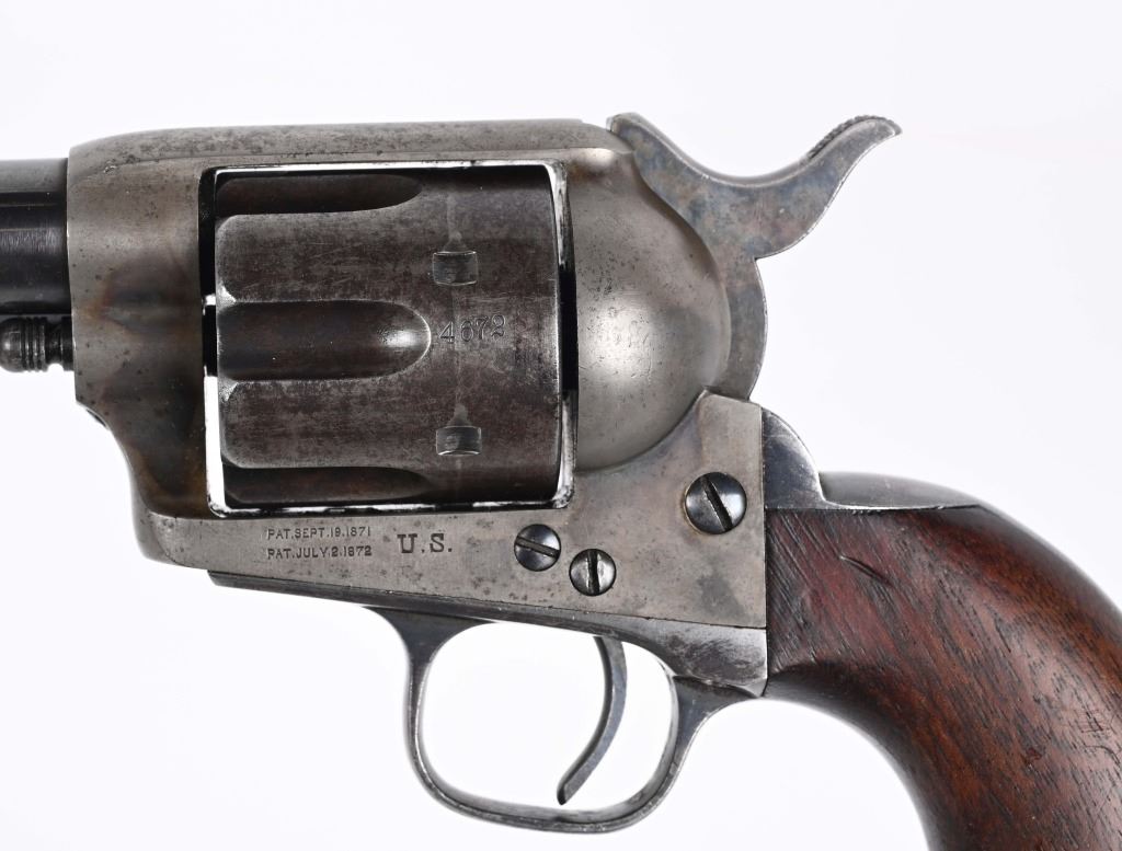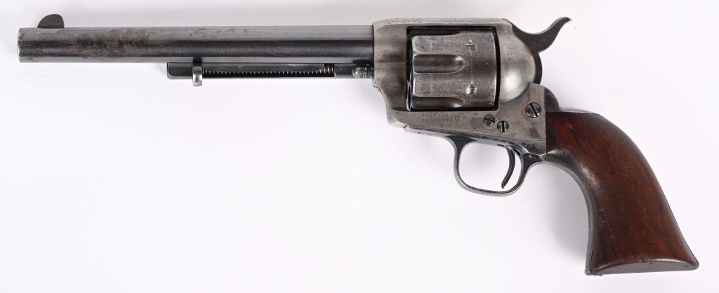 SERIAL 4672. BARREL 7.5". CALIBER .45 COLT. MADE IN EARLY 1874 WITH EARLY 2-LINE ADDRESS ON FRAME. Documented 7th cavalry Custer serial range guns run from 4500 thru 5504. Orville W. Ainsworth inspected Colt SAA revolvers for the government only in 1873-74. It is a standard issue .45 with proper slant barrel address, US on left side of frame, blue and case color. You will find the Ainsworth A stamped on the barrel with a P, backstrap, trigger guard, cylinder. Matching serial number on frame, barrel, trigger guard, back strap, ejector housing and cylinder. One piece walnut6 grips have no visible remaining cartouche but 4672 is written inside grip channel. Proper donut head ejector rod head Correct case color hammer. Blue screws. Front sight is full height. Condition. Frame has sharp legends with case color remaining in protected areas with balance patterned out. Hammer has 70% or better dulling color. Grips are excellent with minor impressions. Barrel retains 85% blue with balance homogenous patina, mostly on a 2" area left side of barrel. Housing has nearly all the blue on underside and scalloped upper with patina on side from holster. Cylinder is basically soft patina. Barrel address crisp. There is generous amounts of blue on protected area of straps. Most of the blue remains on screws but most have been tightened at one time and there is general disfiguration. Bore is sharp and mirror bright with no cancer. The half cock is worn so only 3-clicks. Cylinder locks up and indexes like a vault. Asuperior 2nd year Ainsworth Colt SAA. ANTIQUE