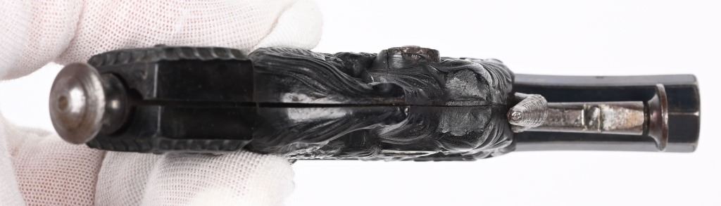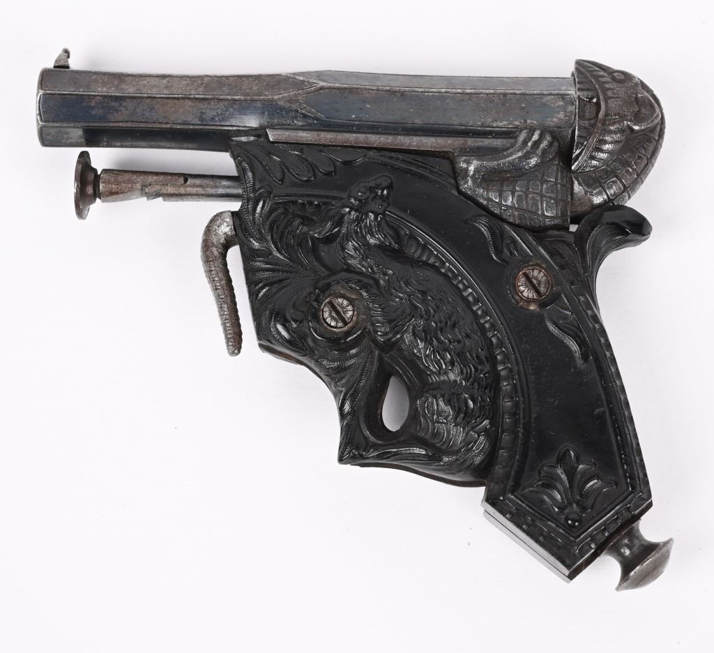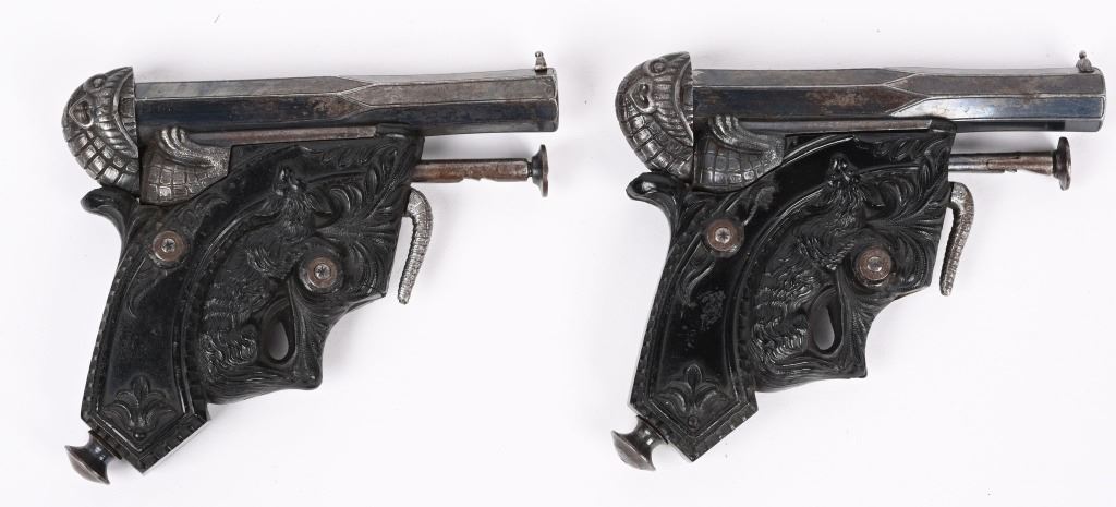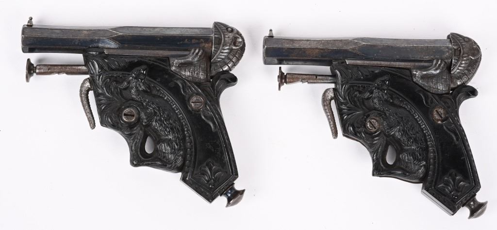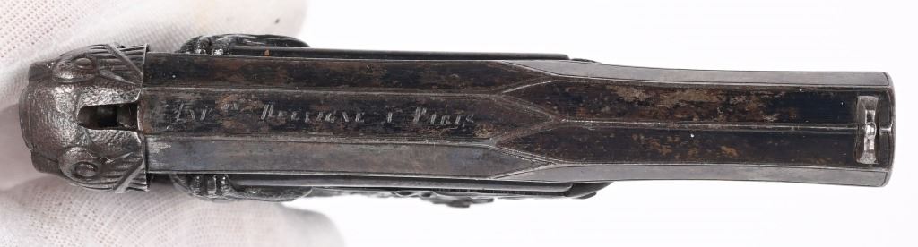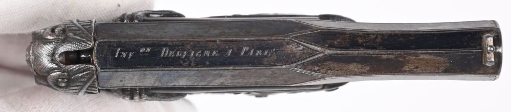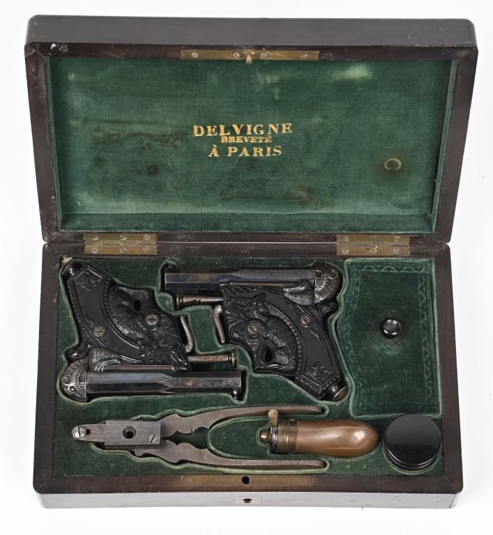SERIAL NUMBER N/A BARREL 3 1/4" CALIBER 38 PERCUSSION MANUFACTURED CIRCA 1850. Magnificent pair of Parisian "Souris" (mouse) Pistols" elaborate Bakelite handle depicting a Mouse biting the edge and a Gargoyle with elongated tail is cast as the hammer and tail operates as the trigger. Blue finished octagon barrel marked on top flat DELVIGNE PARIS" A plunger lever under the barrel cocks the hammer and the Gargoyles tail operates as the trigger. A removable loading rod is concealed in the butt. This pair of Muff pistols are housed in their original French fitted , velvet lined presentation case with mechanical conical single cavity mold, powder flask, nipple wrenches and keys. The lid is marked in gold "DELVIGNE BREVETE A' PARIS" This is the only cased PAIR known as these pistols are found singularly but never known to be found as a pair. CONDITION, Superb with the pistols retaining most all of their factory blue finish with excellent bright bores and properly operating actions. All tools and accessories are very fine. The case is excellent. The Bakelite handles remain fully intact and without damage. An extremely rare pair of early ornate muff pistols. ANTIQUE