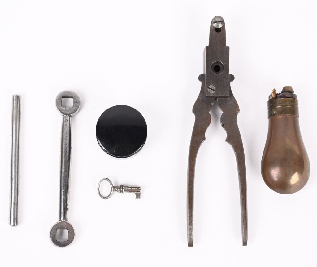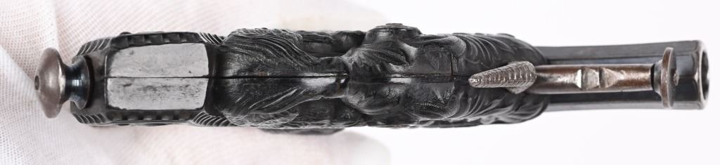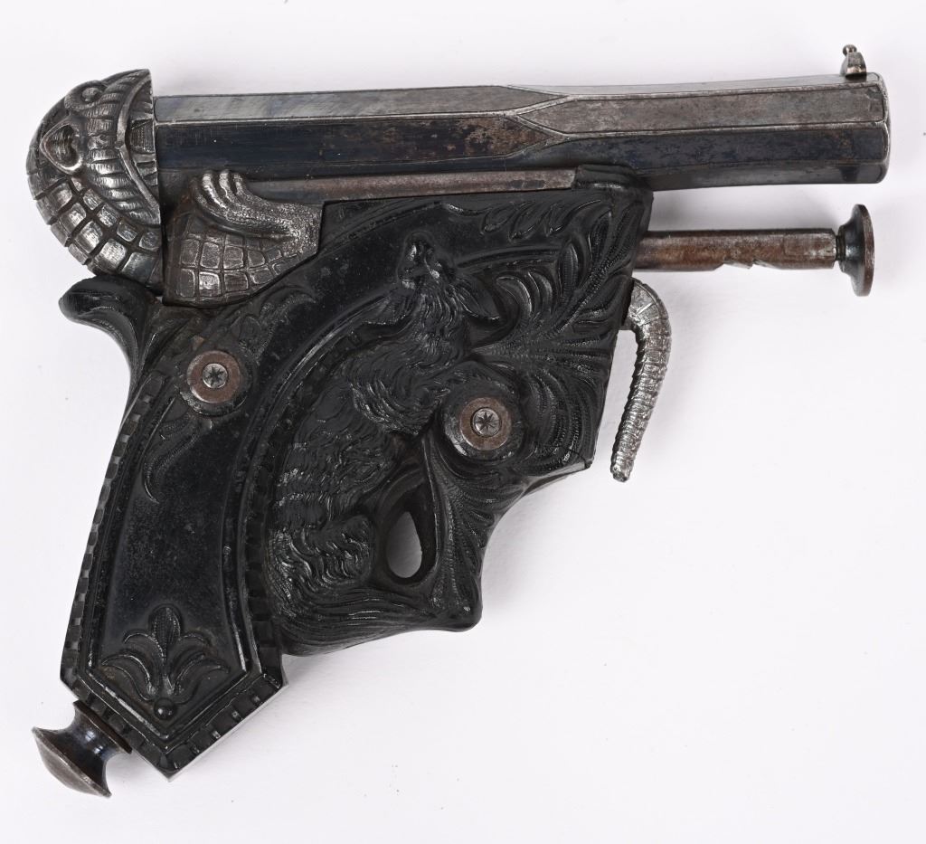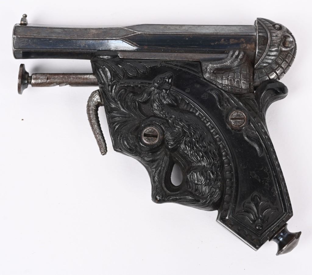 SERIAL NUMBER N/A BARREL 3 1/4" CALIBER 38 PERCUSSION MANUFACTURED CIRCA 1850. Magnificent pair of Parisian "Souris" (mouse) Pistols" elaborate Bakelite handle depicting a Mouse biting the edge and a Gargoyle with elongated tail is cast as the hammer and tail operates as the trigger. Blue finished octagon barrel marked on top flat DELVIGNE PARIS" A plunger lever under the barrel cocks the hammer and the Gargoyles tail operates as the trigger. A removable loading rod is concealed in the butt. This pair of Muff pistols are housed in their original French fitted , velvet lined presentation case with mechanical conical single cavity mold, powder flask, nipple wrenches and keys. The lid is marked in gold "DELVIGNE BREVETE A' PARIS" This is the only cased PAIR known as these pistols are found singularly but never known to be found as a pair. CONDITION, Superb with the pistols retaining most all of their factory blue finish with excellent bright bores and properly operating actions. All tools and accessories are very fine. The case is excellent. The Bakelite handles remain fully intact and without damage. An extremely rare pair of early ornate muff pistols. ANTIQUE