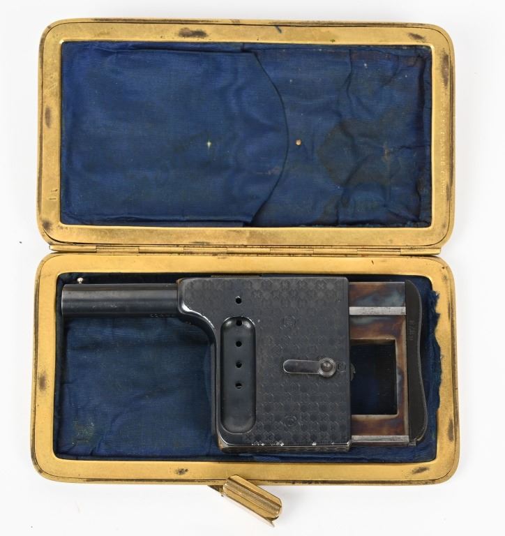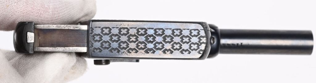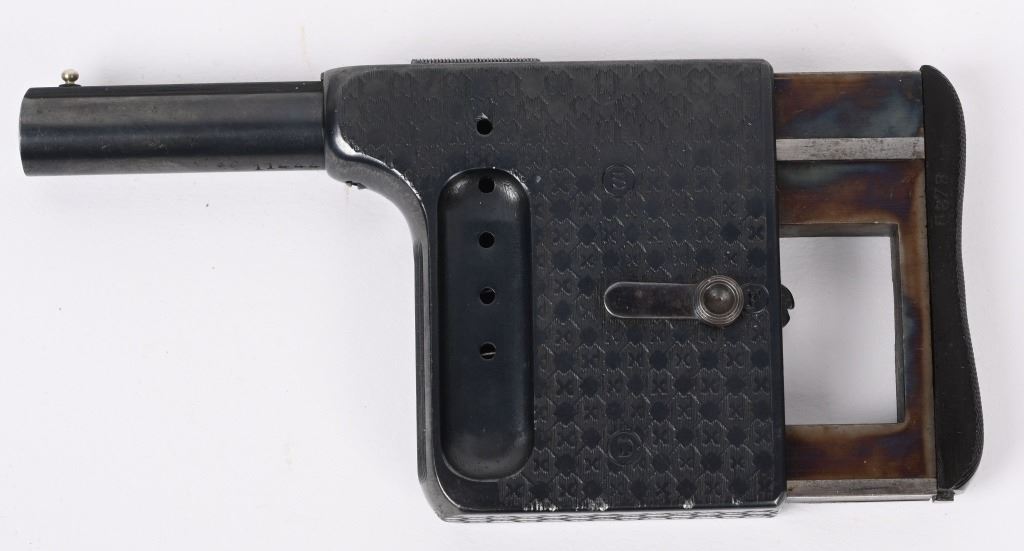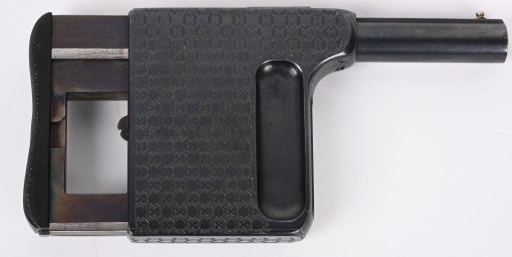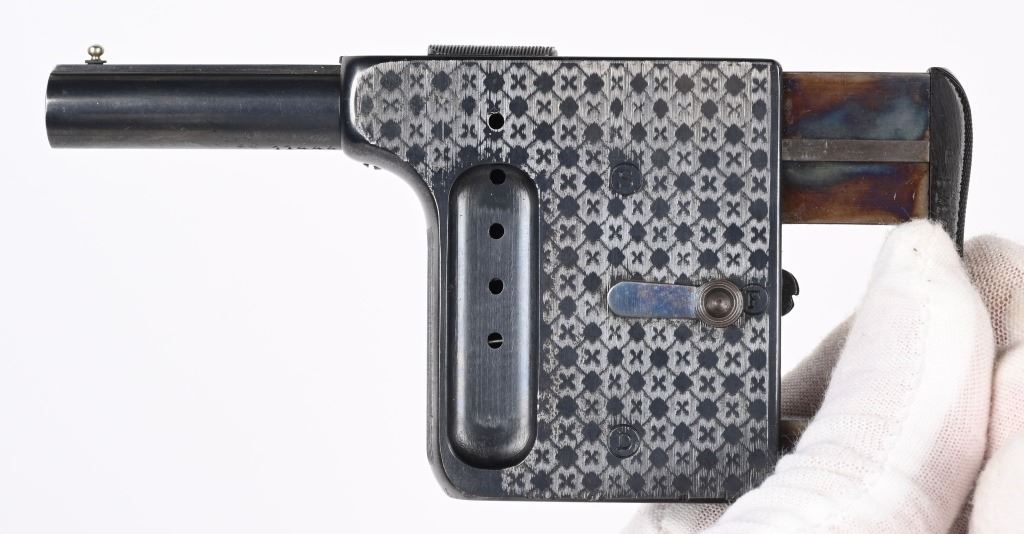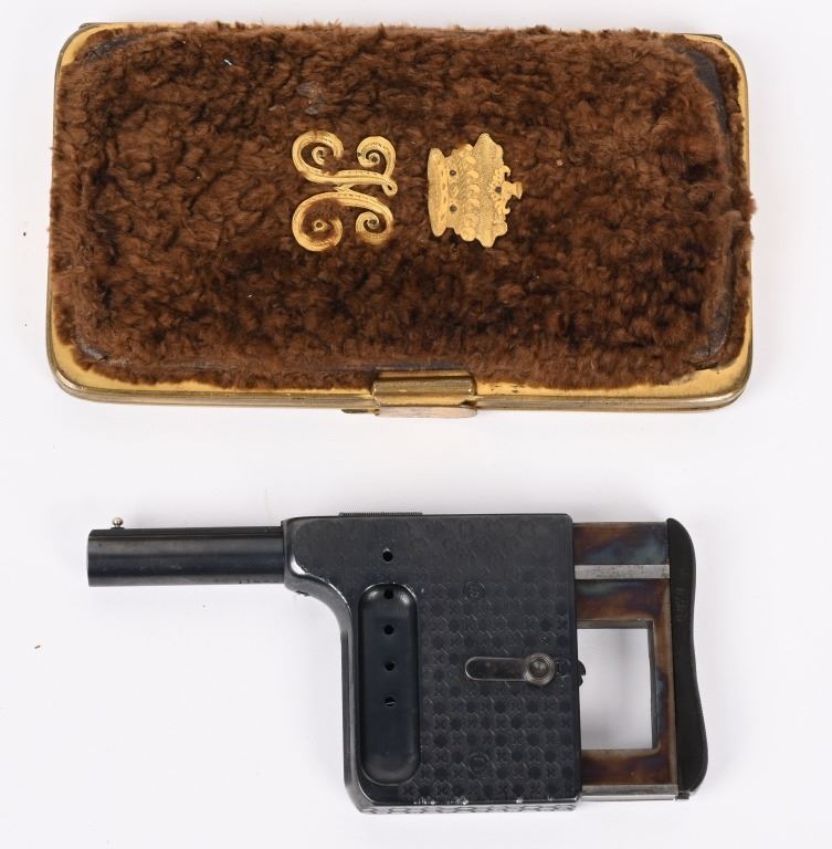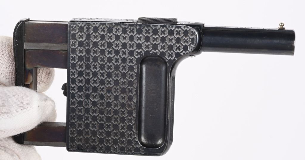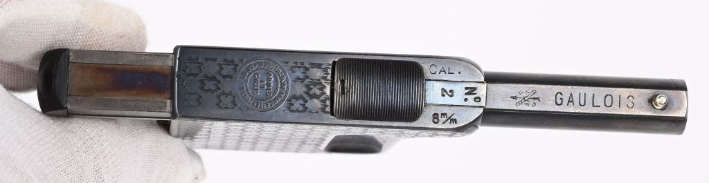 SERIAL NUMBER 11444 BARREL 2" CALIBER 8MM CENTER FIRE MANUFACTURED CIRCA 1890. Blue finished with etched blue finished frame. Barrel marked "GAULOIS" Chamber top marked "CAL, 8mm" No 2" Case colored squeezer mechanism with black bakalite grip panel. Matching numbers internal with internal fixed 5 round magazine. Left side has toggling safety.. Top has sliding dust cover to prevent debris and dirt from entering mechanism. Pistol is housed in "Cigar" folding case with brown fur exterior and gold crown and script "M". CONDITION, Very fine with excellent bore and properly operating action. Pistol retains most all blue finish and retains vivid case colors. Case is very fine with slight edge wear to exterior fur. Clasp and frame are very good and functional. A unique pistol and case from a bygone era. ANTIQUE
