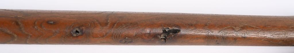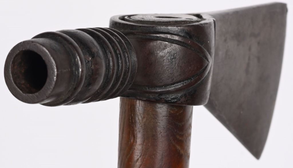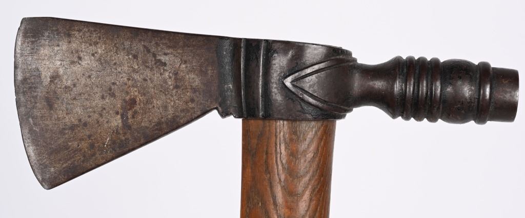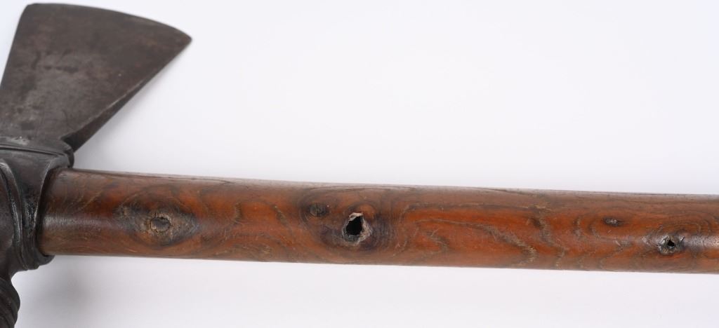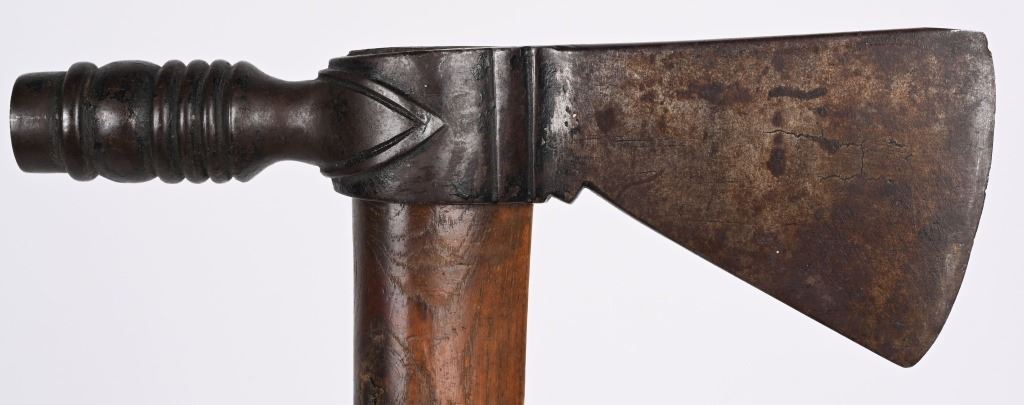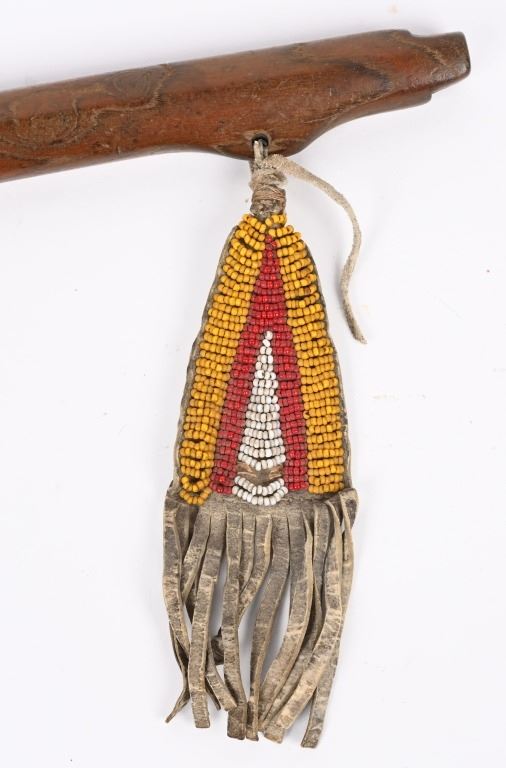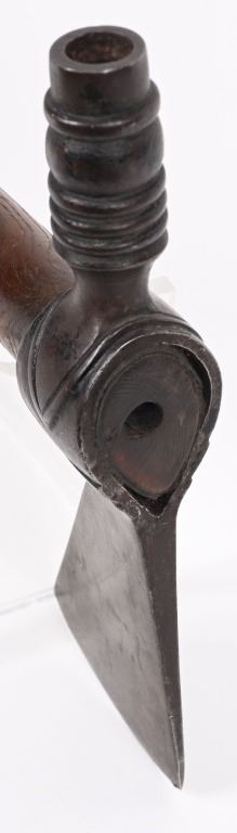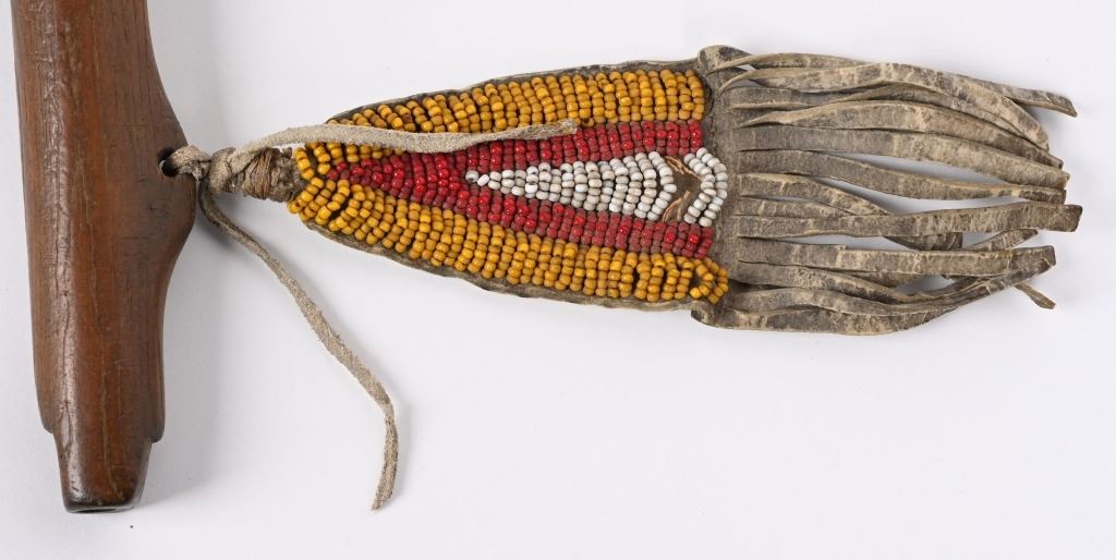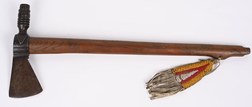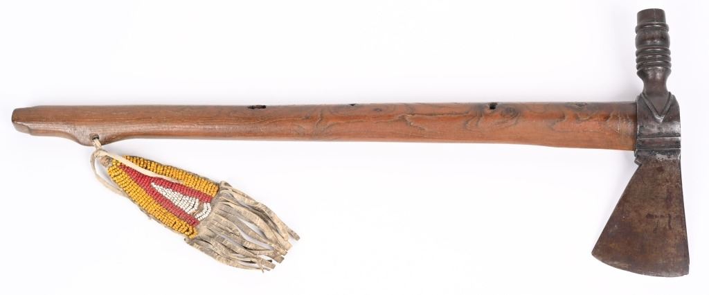 Fine authentic pipe tomahawk with a 2.5" wide blade, the original carved wood shaft and a red, yellow and white glass beaded tobacco bag attached. An item dating to these Plains Indian tribes is rare.