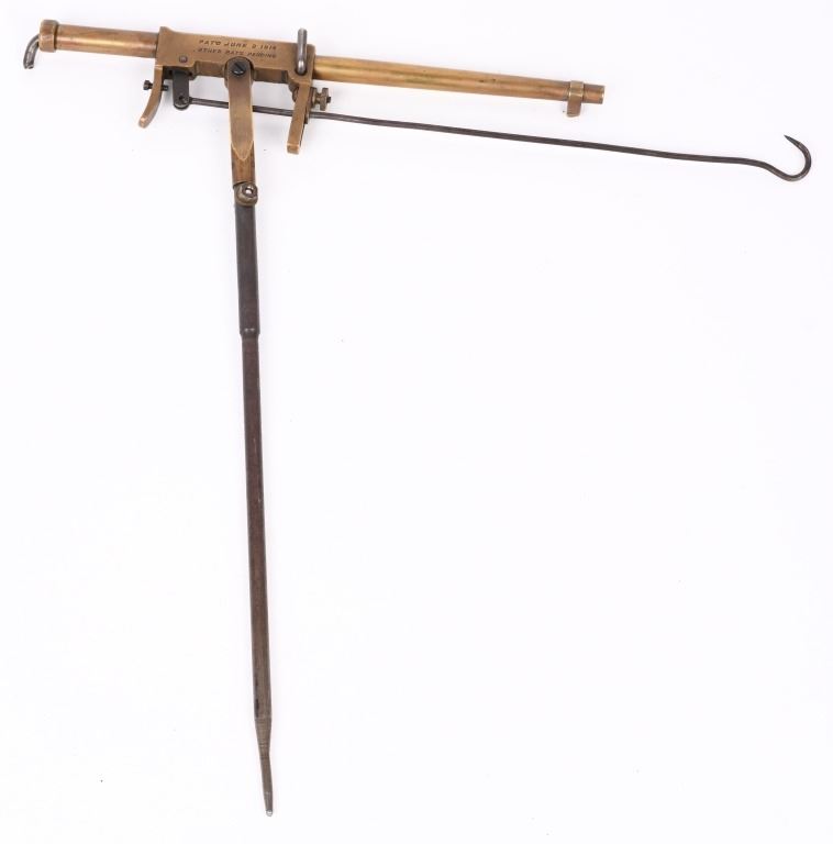 Metal ground stake and bait hook. Offered in 1920's catalogs as being able to kill any fur game up to fox size without damaging the pelt. Very desireable item for both trap collectors as well as gun enthusiast that favor oddities. Fine aged brass. C&R