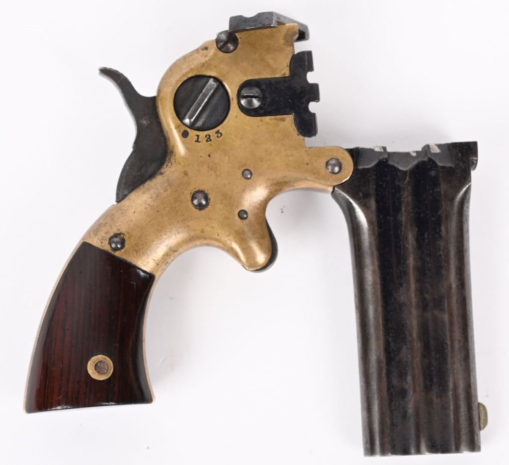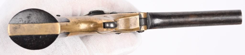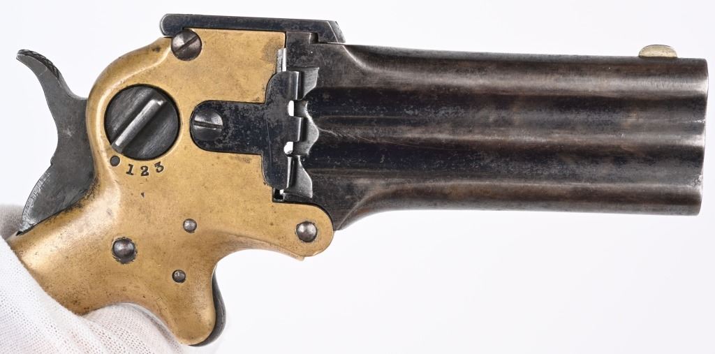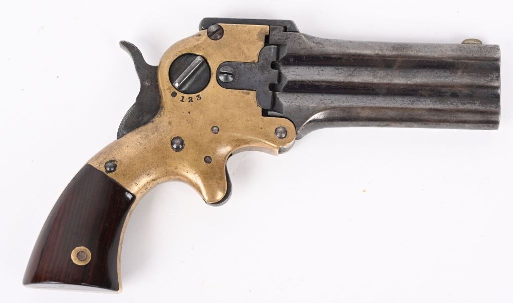 SERIAL 3035. BARRELS 3 1/8". CALIBER .32 RF. MADE 1864-72 Standard legends on left side of the frame with "IMPROVED 1864." A firing detail 1-2-3 on right side. The barrel base, both grip panels are matching. Features full brass frame, rosewood two piece grips, blued barrels. Condition. Fine age brass, grips excellent, about 40% blue mixing plum with some bright blue still evident. Lock up is tight. Early and scarce 3-barrel. ANTIQUE