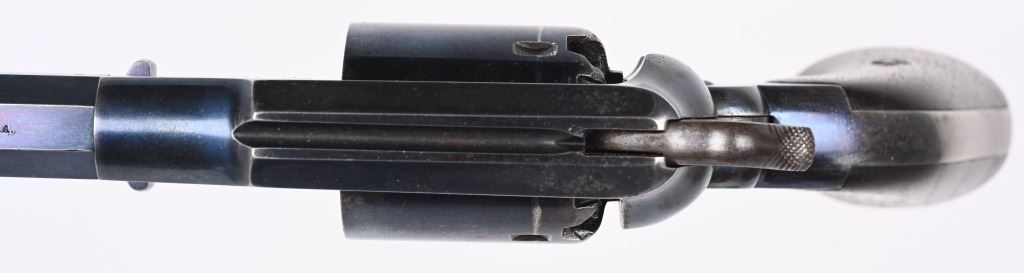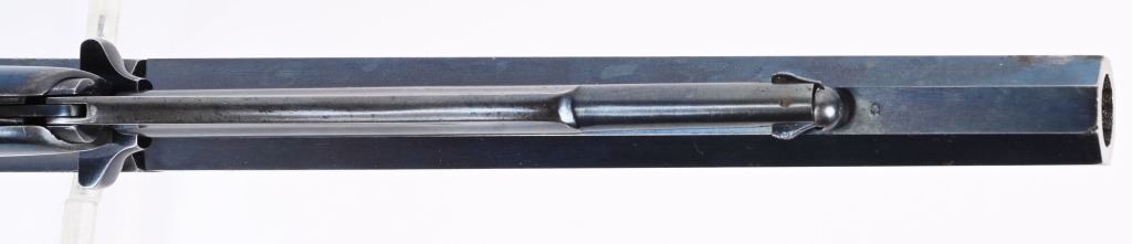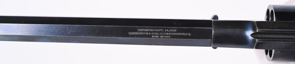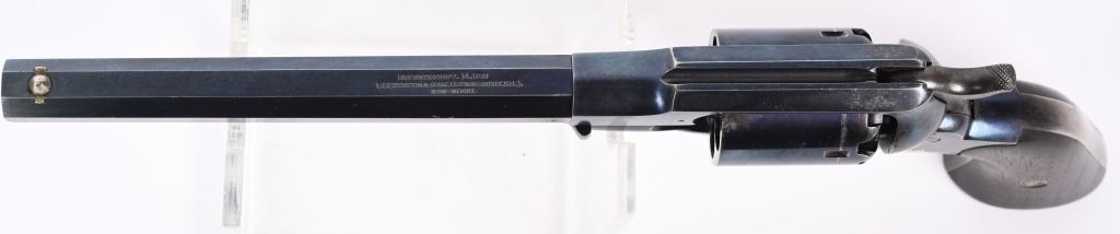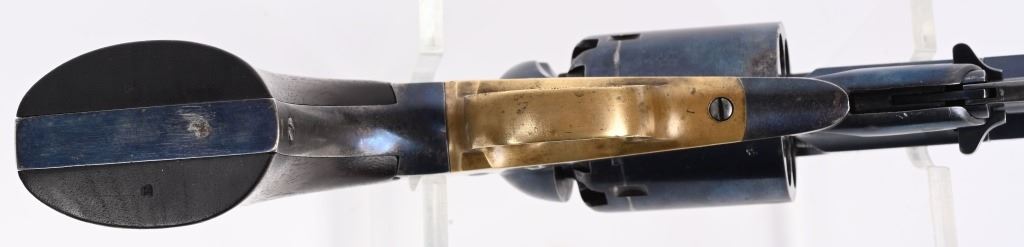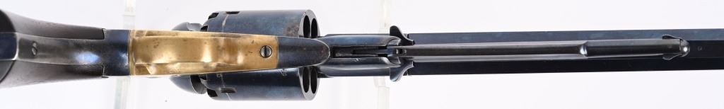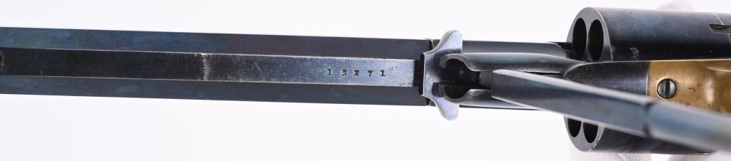SERIAL 13271. BARREL 8". CALIBER .44. Several sub inspector stamps includes "S" on lever, barrel and frame, "C" on lower left frame, "A" on upper left frame, "B & S" on cylinder, cartouche on left grip. Features octagon barrel, brass trigger guard, two piece walnut stocks, bead front sight, case color hammer, high polish blue finish. Condition. Outstanding, 95% bright blue, razor sharp barrel legends, near mint grips, toned brass, dulling case colors on hammer, crisp action and a near mint bore. Worthy of a case. ANTIQUE
