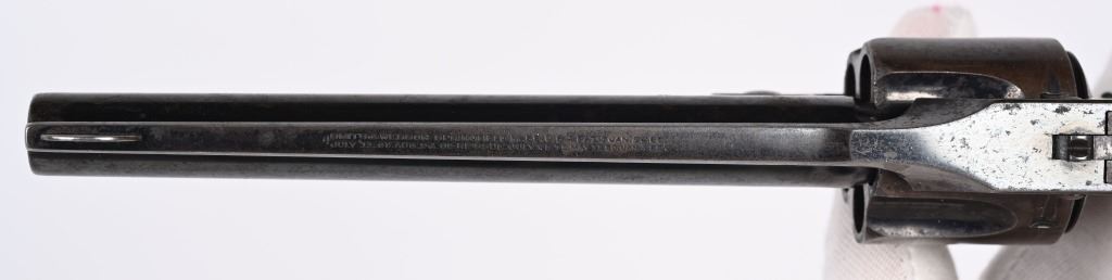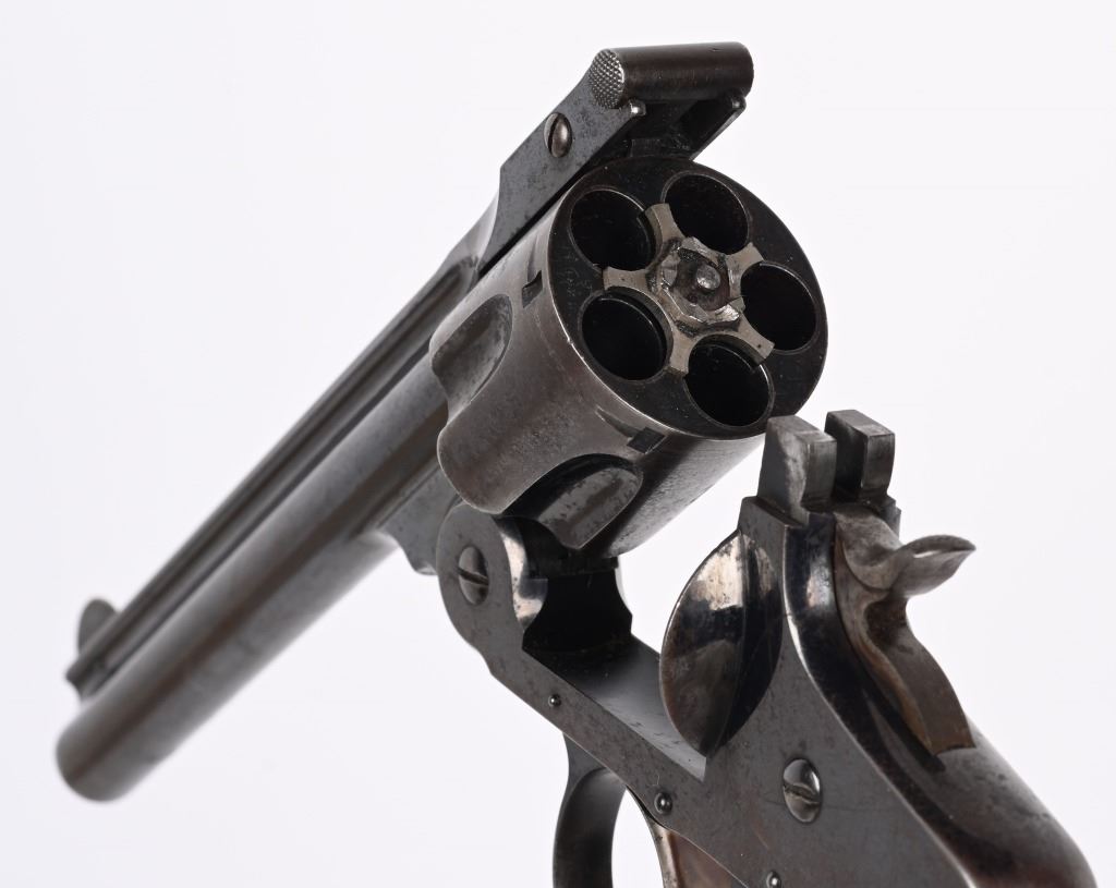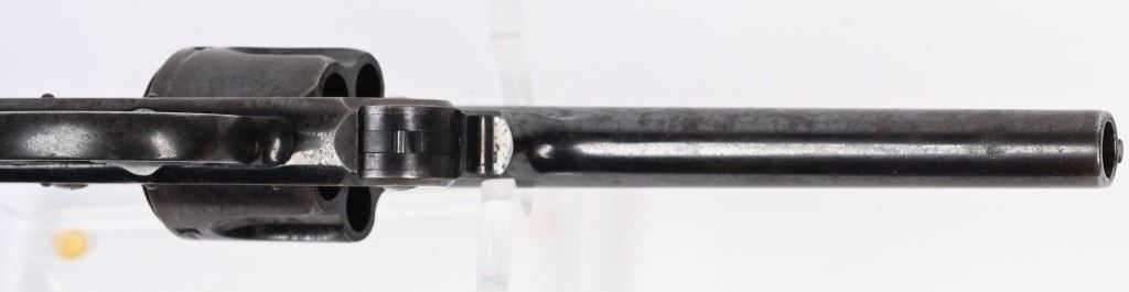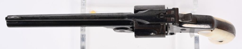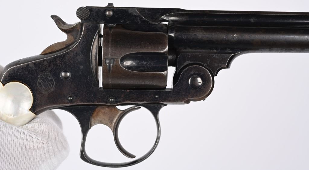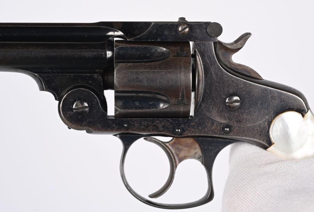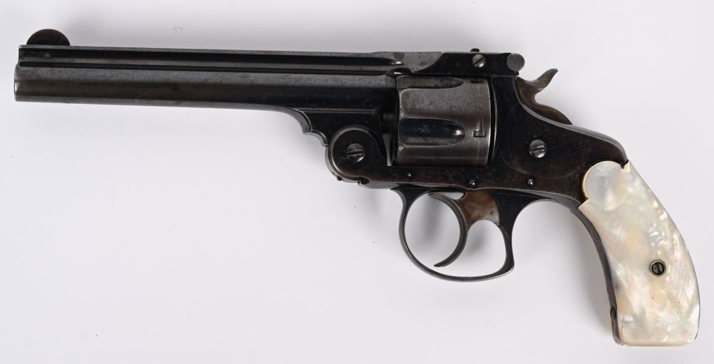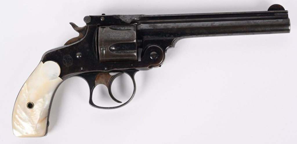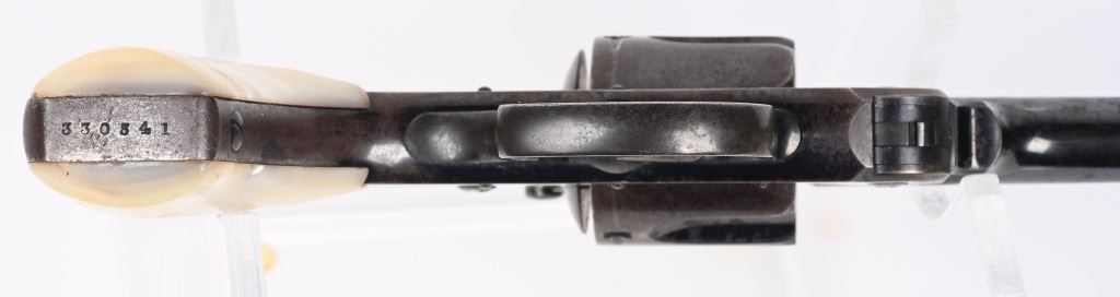 SERIAL NUMBER: 330541. BARREL: 5". CALIBER: .38 S&W. MANUFACTURED: 1890'S. Standard two line company address and patent dates on the barrel rib. Monogram is on the right side of the frame. Five shot fluted cylinder. Matching serials on the cylinder, butt and cylinder latch. Pinned half moon front sight and v-notch rear. Factory blued finish and case colored hammer/trigger. Period mother of pearl grips. CONDITION: Metal is good overall, with a mottled brown patina forming on the barrel. Some scattered brown patina on the frame and grip straps. Grips have light scratches. Bore has a few minor pits, being otherwise clean. Mechanically fine, with a tight hammer and cylinder. Functioning fine in both double and single action. ANTIQUE