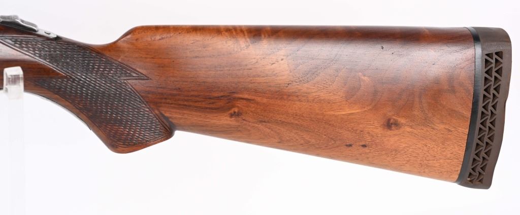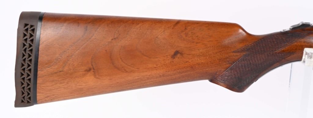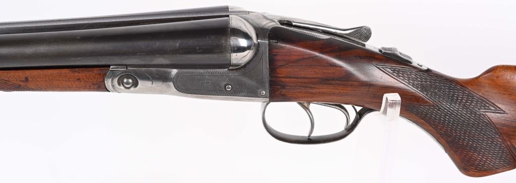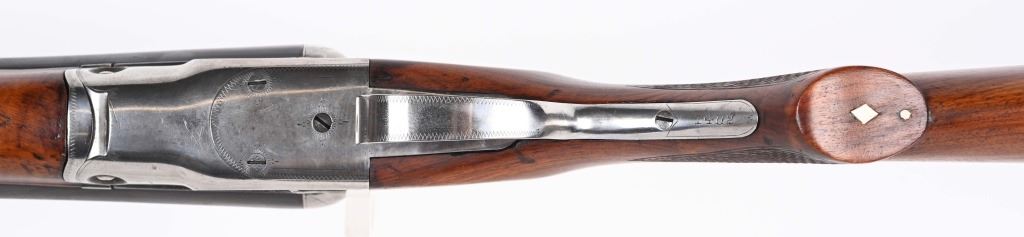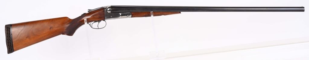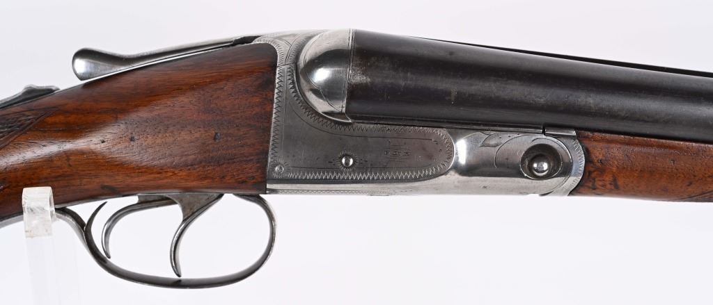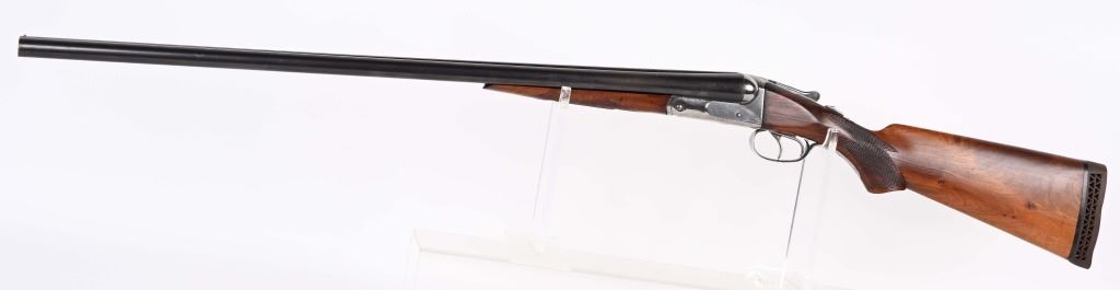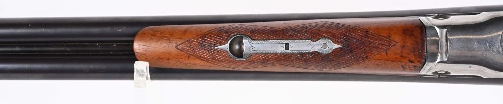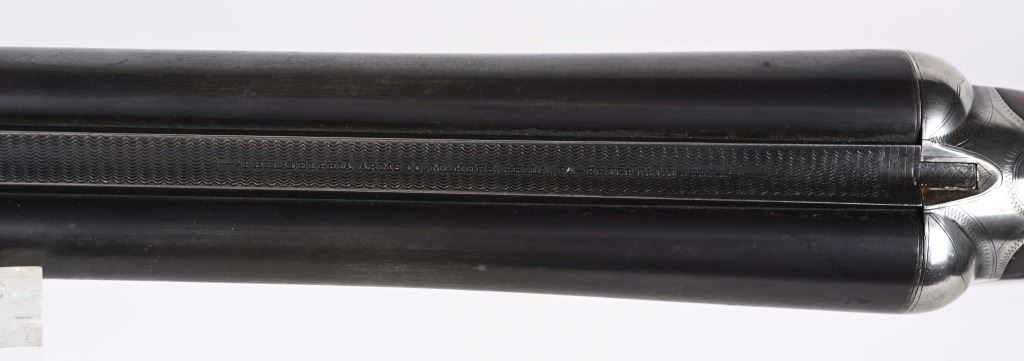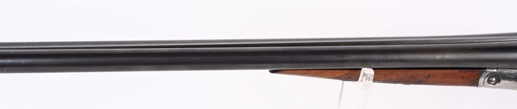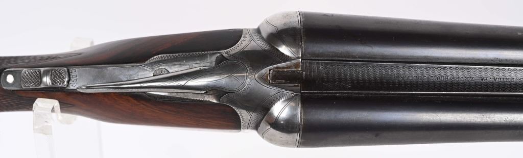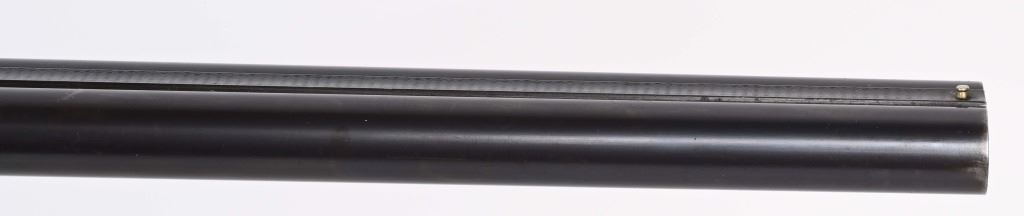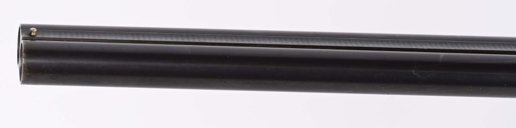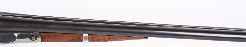SERIAL NUMBER: 1402. BARREL: 30". CALIBER: 12 GAUGE. MANUFACTURED: Circa 1905. Made by the "PHILADELPHIA ARMS CO. MAKERS PHILA. PA-KRUPP FLUID STEEL", as marked on the barrel. "PAT. AUG 16 1904" on the water table. Matching serials on the frame, barrel and hand guard. "FOX" marked on each side of the frame, with light border engraving. Barrels are blued, with a solid matte rib and bead front sight. Double trigger and tang safety. Case colored frame has worn to a bright finish. Some case coloring is visible on the water table. Wood has been sanded and oiled, and a brown rubber recoil pad added. Checkering still present on the forearm and wrist. 2-3/4" chamber. Chokes measure roughly at full/full. LOP is: 14-3/4". CONDITION: Metal is good to very good overall, with 75% bluing remaining on the barrels. Although frame lacks case coloring, the polished finish is consistent. Some scratches on the bottom of the frame. Wood has light handling marks, scrapes and scratches. Small repaired crack on the right side of the wrist. Added plastic inlay on the bottom of the grip. Bores both have a shine, with no pitting. Lockup is tight. C&R