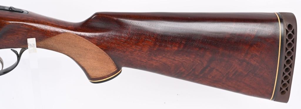 SERIAL NUMBER T-00921 BARREL 28 1/2" CALIBER / GUAGE 12 MANUFACTURED CIRCA 1970'S. Produced in Soviet Russia commercially with over under box lock action, single non-selective trigger. Chambered 12 Ga, 2-3/4" chamber with ejectors. Vent rib barrel choke Full & Modified with brass bead front sight. Balance point marked IJ-27-E1C USSR. Oil finished checkered Pistol grips stock with plastic grips cap. 14-1/2" LOP. Receiver has a relief engraved waterfowl scene on left side with a silver inlaid border. Right side has a flushing grouse scene with same silver border. Rubber recoil pad marked "BAIKAL" barrels are Tula arsenal proofed. Shotgun is housed in a Canvas padded travel luggage case marked Ugartachia inside with a pair of nickel snap caps. CONDITION. Very fine with over 98% blue finish remaining. Breech faces show slight use. Action operates properly and ejectors are in time. Stocks are very good with a few very minor impressions. MODERN