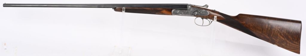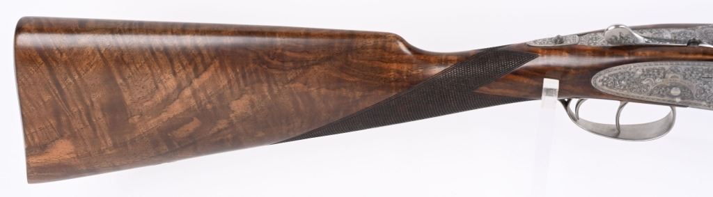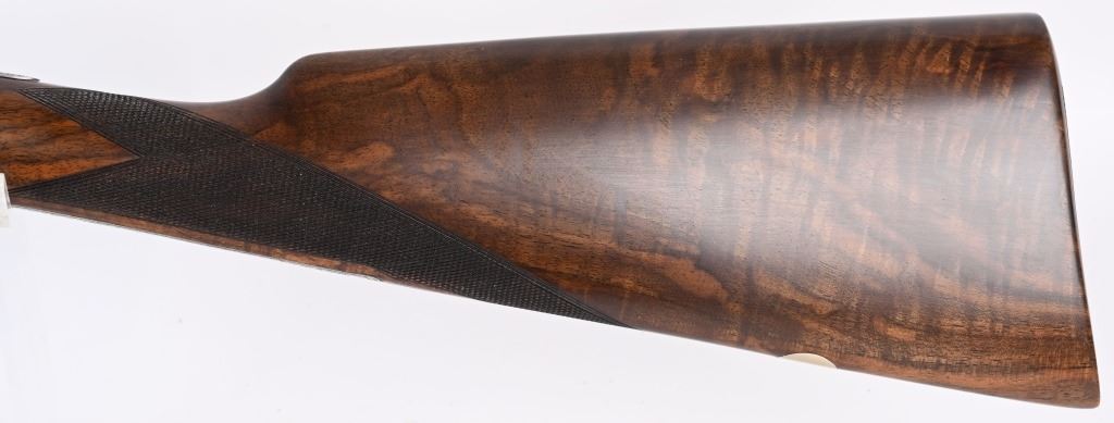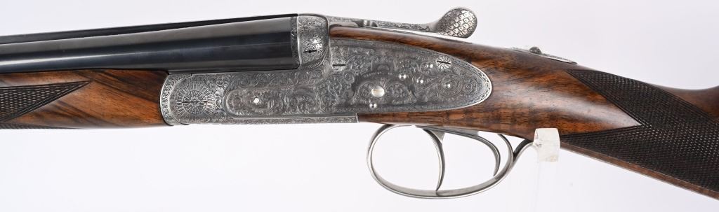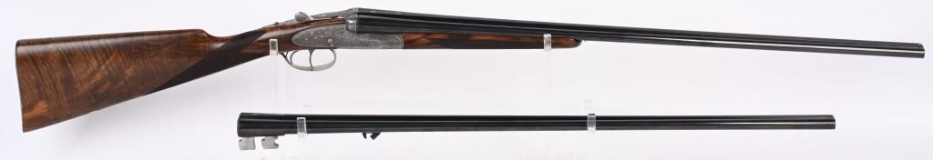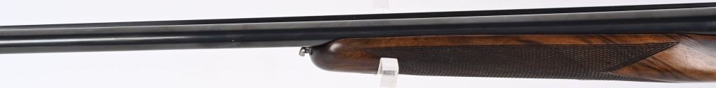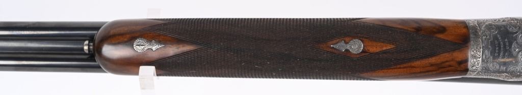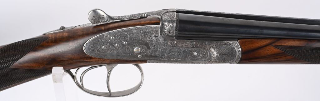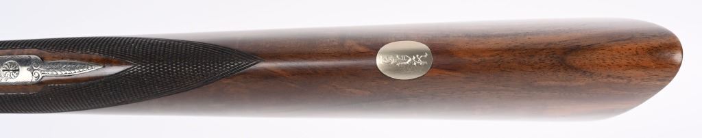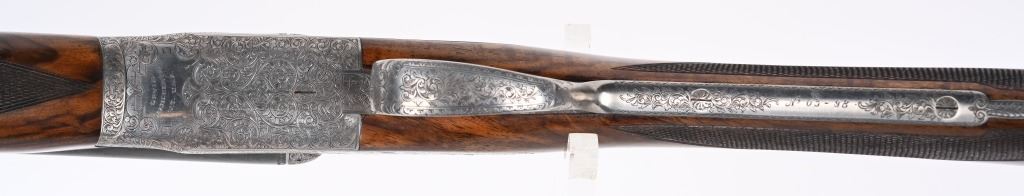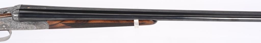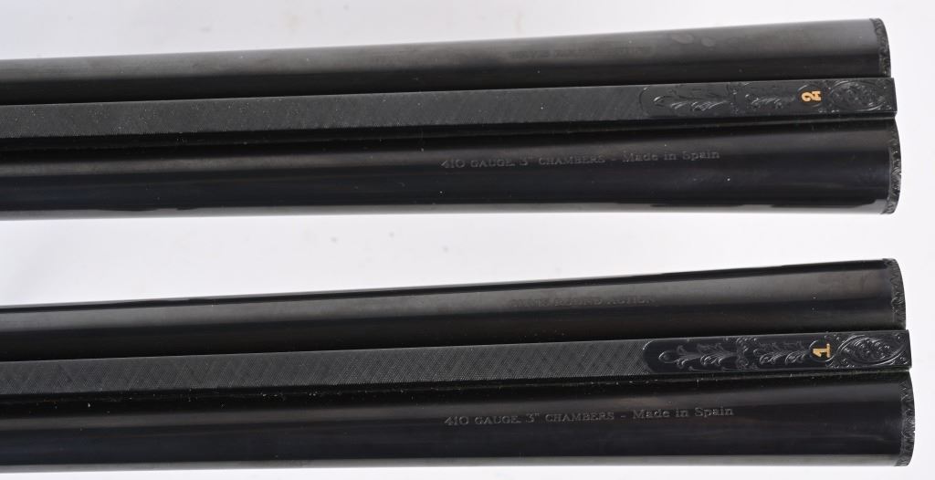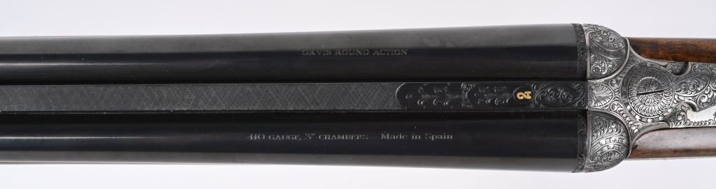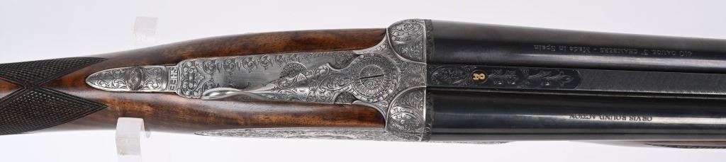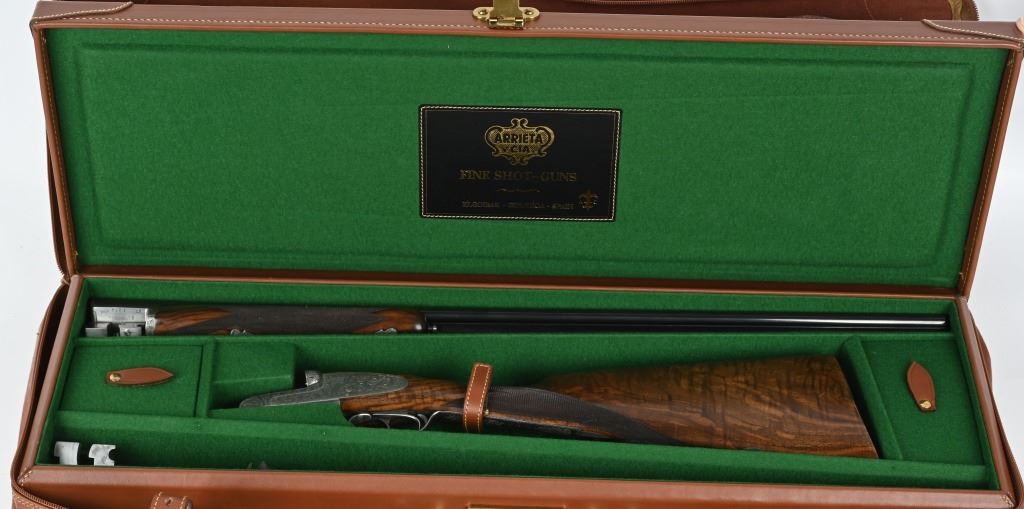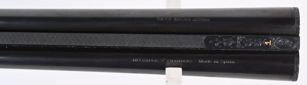 SERIAL NUMBER 57-03-03-98 BARRELS 28" (BOTH) CALIBER / GUAGE 410 MANUFACTURED 1998. Produced by Arrieta in Spain to be marketed by Orvis. 7 pin side lock round body double shotgun with double triggers and ejectors. Superb quality round body side lock with profuse tight scroll & vine engraving on the coin finished receiver and trigger guard. Barrels are numbered 1 & 2 and are choked (1) improved cylinder & modified (2) Full & Modified. Highly figured oil finished walnut straight stock with splinter forearm checkered finely at wrist and forearm. Shotgun is cased in its Oak & Leather travel case with green crushed wool line partitions and comes with a pair of nickel finished snap caps. CONDITION. Very fine with barrels retaining over 98% blue finish with bores being bright. Receiver is equally fine with no distress with a very slight witness marking on breech faces from light use. Stocks are excellent with a couple very minute impressions from handling. Action and ejectors operate properly. 14-1/2" LOP. Case is very fine with outer travel cover. MODERN