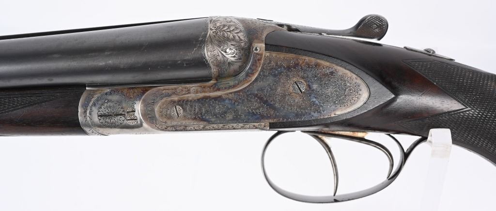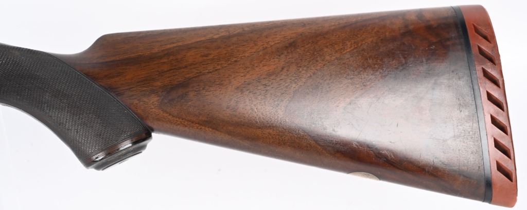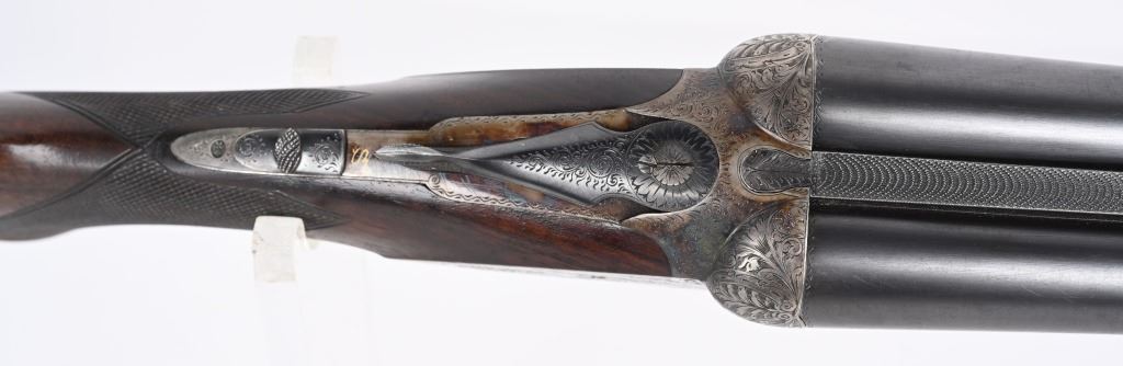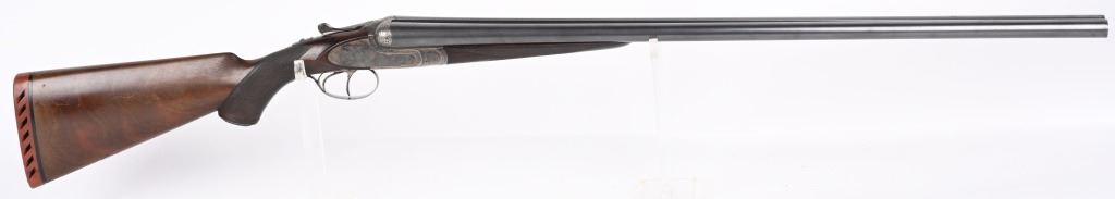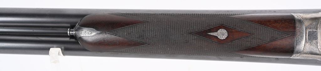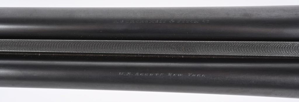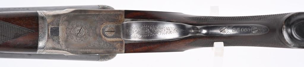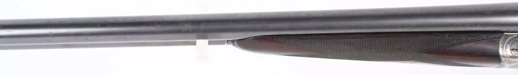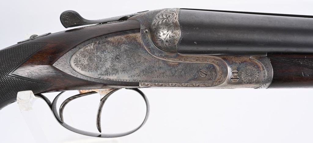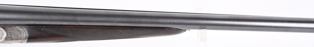 SERIAL NUMBER 88009 BARREL 30" CALIBER 12 GUAGE MANUFACTURED 1936. Fine quality side plated box lock August Francotte 12 gauge double shotgun with double triggers, 2-3/4" chambers and ejectors. 15" LOP over 1" red recoil pad with oil finished highly figured European dark walnut stocks with checkered pistol grip and splinter forearm. Barrels marked "ABERCROMBIE & FITCH CO,""US AGENTS NEW YORK" Case colored receiver with side clips with side plates engraved tight scrolls with "A.FRANCOTTE MAKER LIEGE BELGIUM" at lower edge of side plates. Rust blue finished barrels with 2-3/4" chambers numbered to frame and forearm assembly. Choked Modified and improved modified. CONDITION. Very good with bright bores and over 90% blue finish remaining with several very small areas of oxidation of barrels from storage. Action operates properly and locks solidly. Ejectors operate properly and in time. Receiver and sid plates retain over 97% case colors with a touch of finish loss at leading edges. Stocks are very good with light wear to checkering and a few light impressions and bruises. 2-1/2" drop at heel 2" drop at comb. C&R