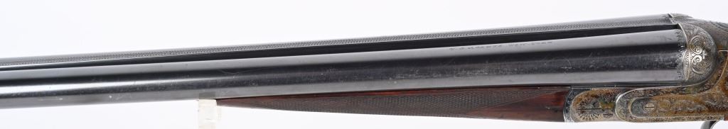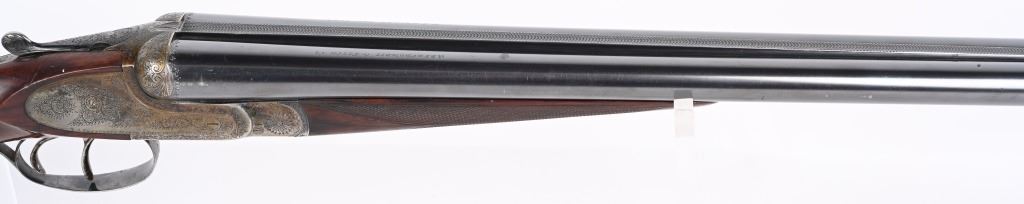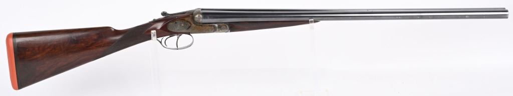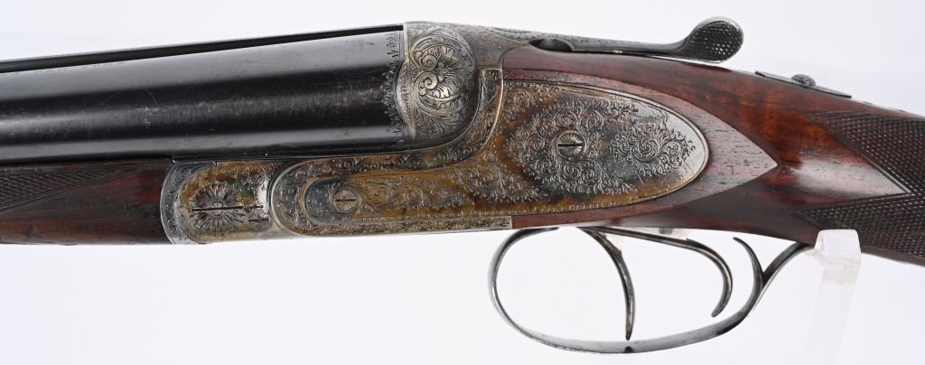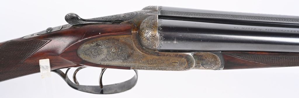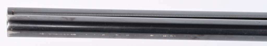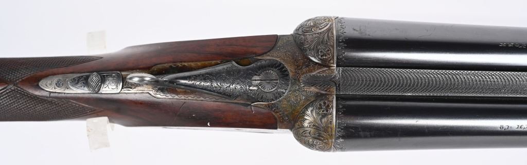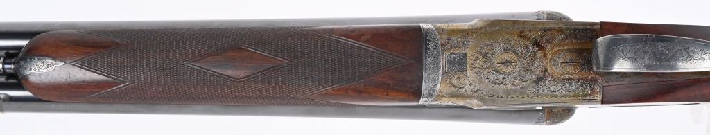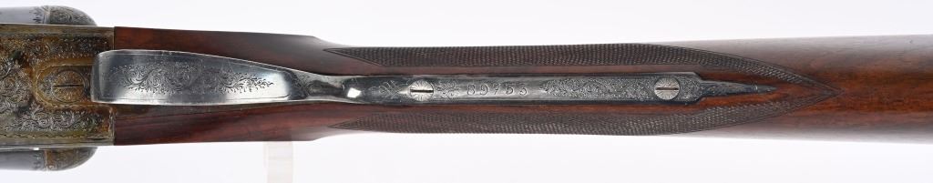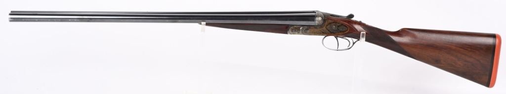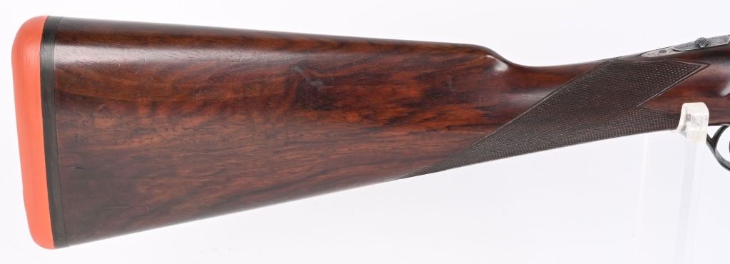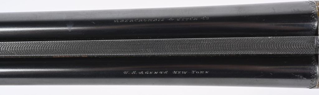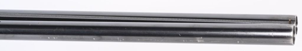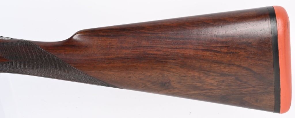 SERIAL NUMBER 79753 BARREL 26" CALIBER 12 GA, MANUFACTURED 1948. Fine quality side plated box lock with 26" ribbed barrels with double triggers, ejectors and side clipped fences. Profusely engraved with tight scrolls with the bottom edge of the side plates marked "A FRANCOTTE MAKER PATENT LIEGE BELIUM" Case color action with lacquer overcoat. Barrel are marked "ABERCROMBIER & FITCH CO," "US AGENTS NEW YORK" Matching serial numbers on water table , barrels and forearm. Choked Improved cylinder and modified with 2-3/4" chambers. 14 1/4"LOP over 7/8" rubber butt pad. Oil finished highly figured European walnut straight stock with splinter forearm checkered at wrist and forearm. CONDITION. Very fine with brilliant bright bores and in time ejectors. Barrels retain 90% blue finish with slight losses at muzzles from use and carry. Receiver retains over 75% case colors with thinning and losses at balance point and right side plate. Losses are not evident as lacquer hides most of it. Stocks are very fine with sharp checkering and a few minor impressions in the wood from use. A very minute 1/16" chip of wood is missing to rear of top tang. 2-1/4" drop at heel 1 3/4" drop at comb. C&R