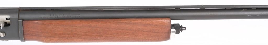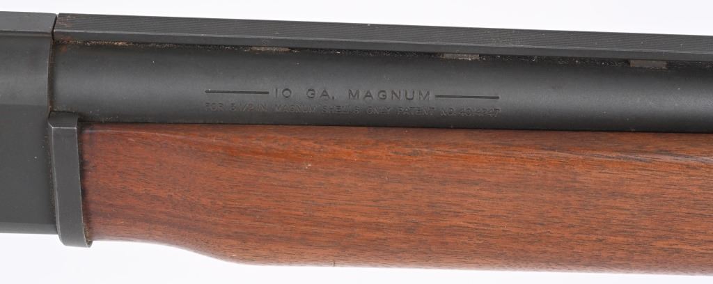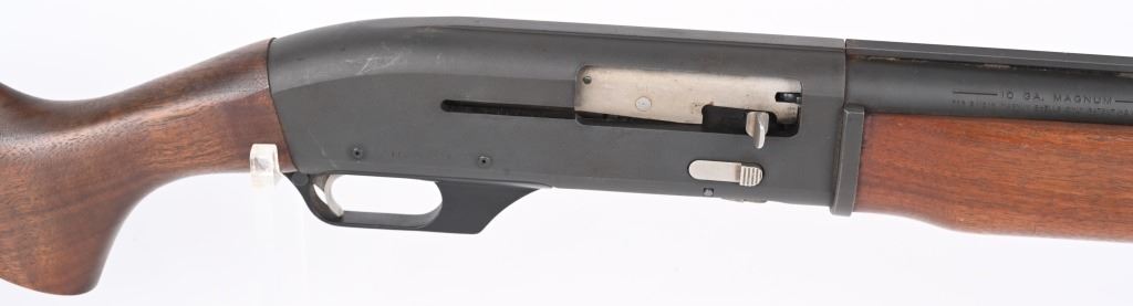 SERIAL NUMBER: 100021535. BARREL: 30". CALIBER: 10 GAUGE. MANUFACTURED: 1980'S. Vent rib barrel with bead front sight. Matte phosphate finish on the metal components. Plain oiled wood stock and forearm. Brown rubber butt pad. 3-1/2" chamber. Full choke bore. LOP is: 14-1/4". CONDITION: Metal good overall, with light wear. Some light surface rust around the vent rib. Wood is excellent overall, with a few handling marks on the butt. Bore is clean overall. Mechanically fine. MODERN