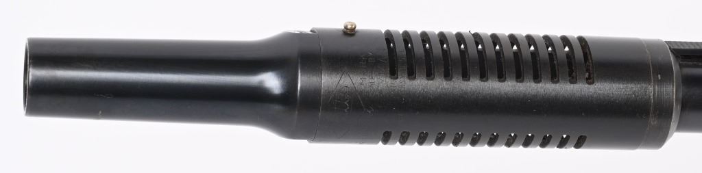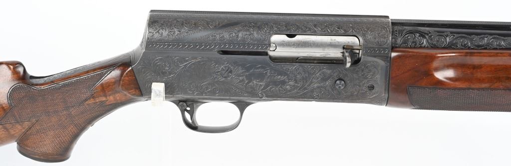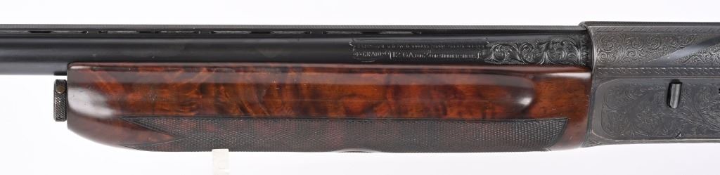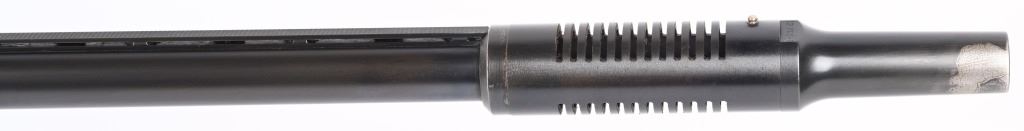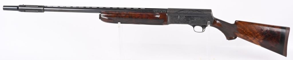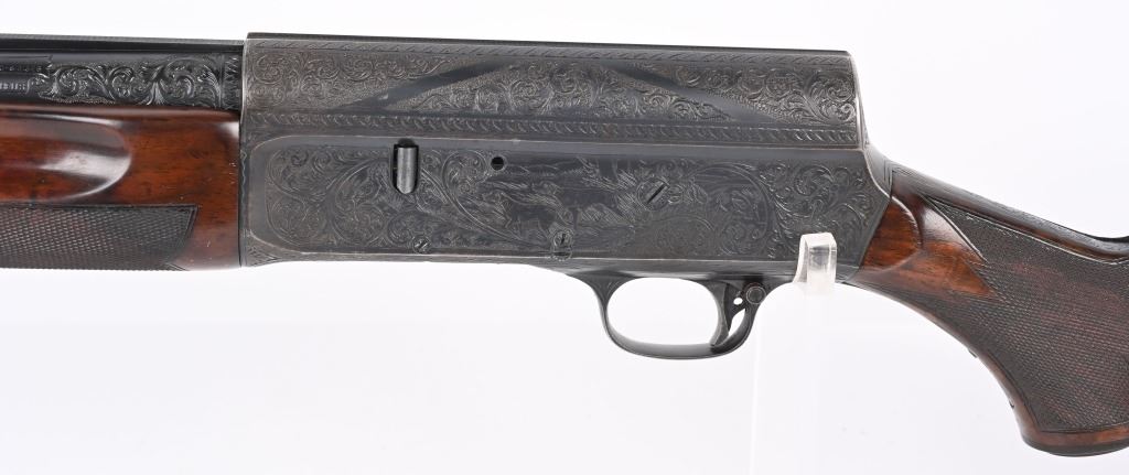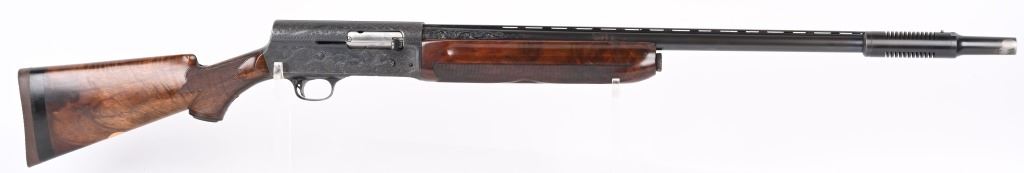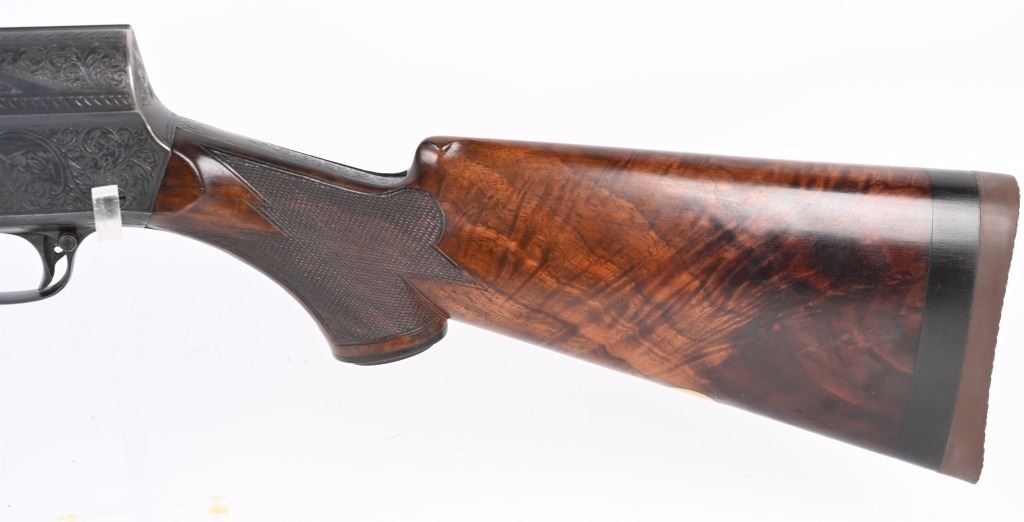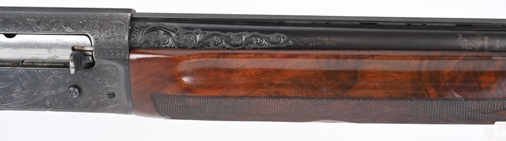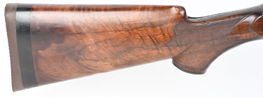 SERIAL 767042. BARREL 28.5" WITH CUTTS COMPENSATOR . GAUGE 12. CHAMBER 2 3/4". LOP 14". This is an early post WWII gun. It is stamped "F" grade on both barrel and frame. The exquisite hand engraved frame features nearly complete coverage with pointers and waterfowl on both sides surrounded by bank note scroll. The breech of the barrel also has bank note engraving. The walnut stocks display triple x grain, oil finish, hand checkered with pistol grip and cap. This stock has a 3/4" black spacer with a 1/2" pad (both after market) The barrel features a vent rib and an old Cutts compensator. The Cutts compensator was originally developed as a device that reduced recoil (35-46% depending on the load used) in large bore long guns. It later morphed into a device that also allowed for changeable chokes. As it was available before screw in chokes were commonly available this was a significant invention. The Cutts compensator was invented by Colonel Richard Malcolm Cutts, USMC. during the 1920's for the military. " THE SPORTSMAN" is stamped on the bolt. Condition. The frame shows a hint of edge finish wear, otherwise, all metal remains at least 98% blue but there is a 1" spot of freckling on right side of barrel and a spot of missing finish on end of Cutts (this part can be replaced or reblued easily) . Wood is superb with just minor handling impressions. Bore is bright. C&R